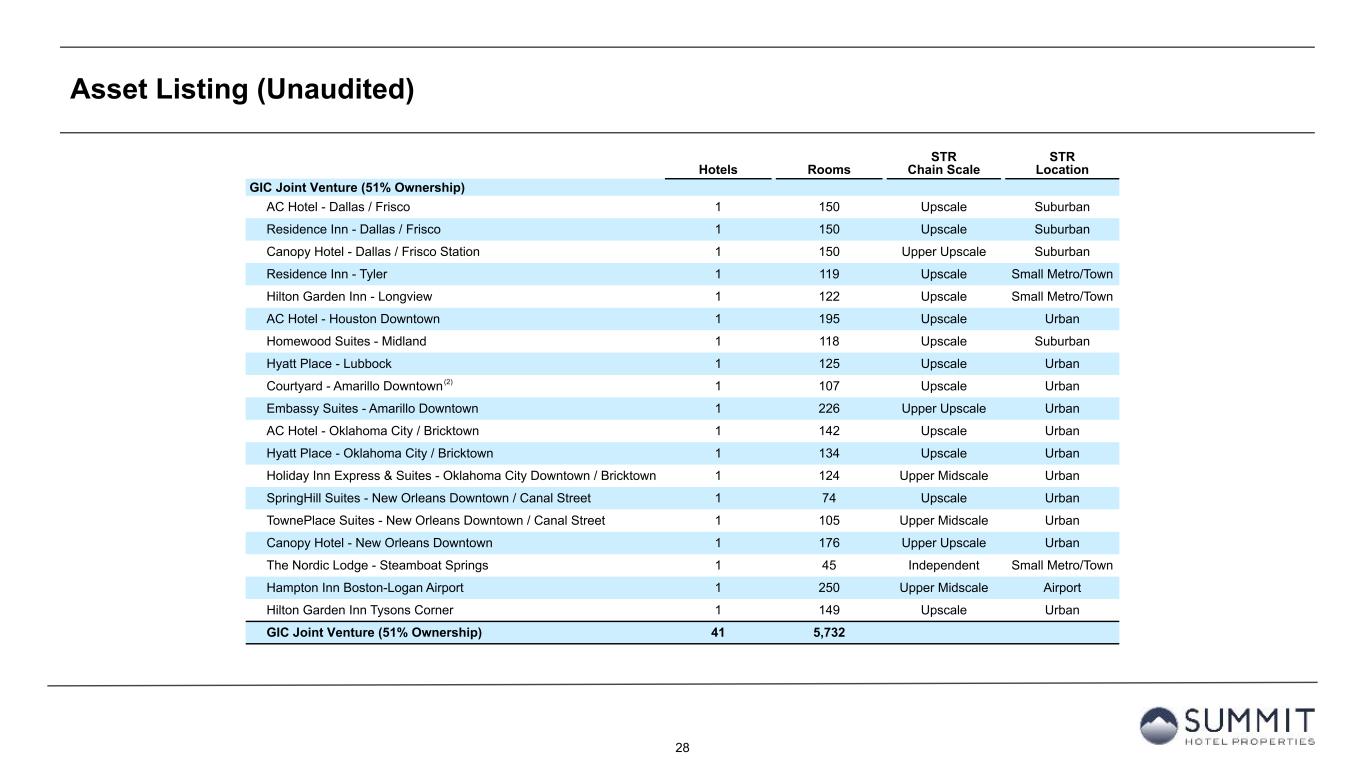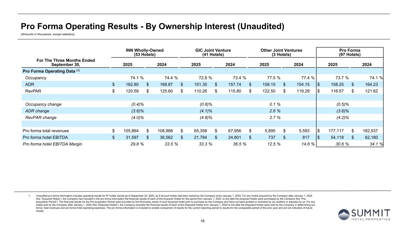 (1) Unaudited pro forma information includes operating results for 97 hotels owned as of September 30, 2025, as if each hotel had been owned by the Company since January 1, 2024. As a result, these pro forma operating and financial measures include operating results for certain hotels for periods prior to the Company’s ownership.
