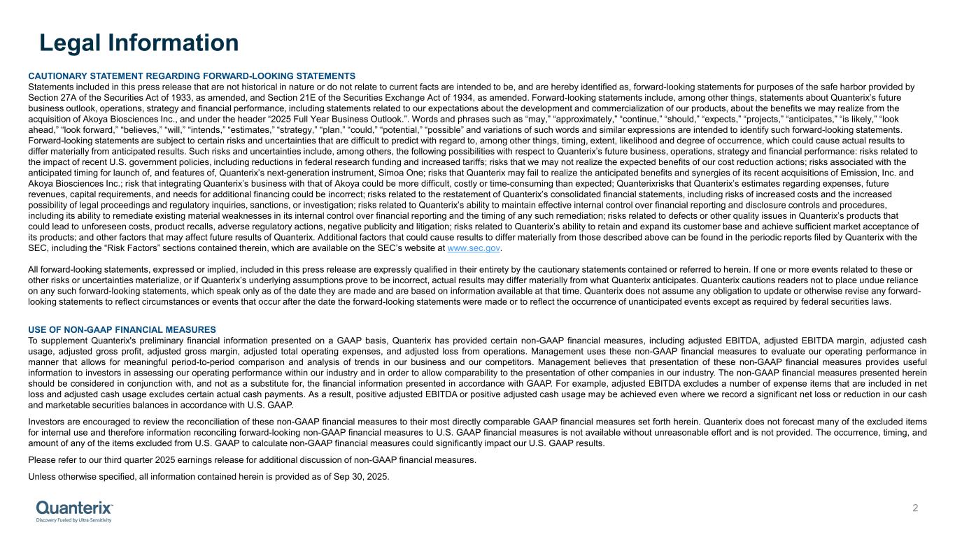 Statements included in this press release that are not historical in nature or do not relate to current facts are intended to be, and are hereby identified as, forward-looking statements for purposes of the safe harbor provided by Section 27A of the Securities Act of 1933, as amended, and Section 21E of the Securities Exchange Act of 1934, as amended. Forward-looking statements include, among other things, statements about Quanterix’s future business outlook, operations, strategy and financial performance, including statements related to our expectations about the development and commercialization of our products, about the benefits we may realize from the acquisition of Akoya Biosciences Inc., and under the header “2025 Full Year Business Outlook.”. Words and phrases such as “may,” “approximately,” “continue,” “should,” “expects,” “projects,” “anticipates,” “is likely,” “look ahead,” “look forward,” “believes,” “will,” “intends,” “estimates,” “strategy,” “plan,” “could,” “potential,” “possible” and variations of such words and similar expressions are intended to identify such forward-looking statements. Forward-looking statements are subject to certain risks and uncertainties that are difficult to predict with regard to, among other things, timing, extent, likelihood and degree of occurrence, which could cause actual results to differ materially from anticipated results. Such risks and uncertainties include, among others, the following possibilities with respect to Quanterix’s future business, operations, strategy and financial performance: risks related to the impact of recent U.S. government policies, including reductions in federal research funding and increased tariffs; risks that we may not realize the expected benefits of our cost reduction actions; risks associated with the anticipated timing for launch of, and features of, Quanterix’s next-generation instrument, Simoa One; risks that Quanterix may fail to realize the anticipated benefits and synergies of its recent acquisitions of Emission, Inc. and Akoya Biosciences Inc.; risk that integrating Quanterix’s business with that of Akoya could be more difficult, costly or time-consuming than expected; Quanterix risks that Quanterix’s estimates regarding expenses, future revenues, capital requirements, and needs for additional financing could be incorrect; risks related to the restatement of Quanterix’s consolidated financial statements, including risks of increased costs and the increased possibility of legal proceedings and regulatory inquiries, sanctions, or investigation; risks related to Quanterix’s ability to maintain effective internal control over financial reporting and disclosure controls and procedures, including its ability to remediate existing material weaknesses in its internal control over financial reporting and the timing of any such remediation; risks related to defects or other quality issues in Quanterix’s products that could lead to unforeseen costs, product recalls, adverse regulatory actions, negative publicity and litigation; risks related to Quanterix’s ability to retain and expand its customer base and achieve sufficient market acceptance of its products; and other factors that may affect future results of Quanterix. Additional factors that could cause results to differ materially from those described above can be found in the periodic reports filed by Quanterix with the SEC, including the “Risk Factors” sections contained therein, which are available on the SEC’s website at www.sec.gov.