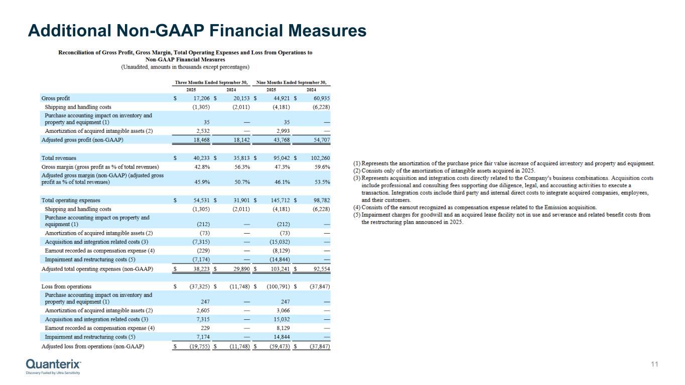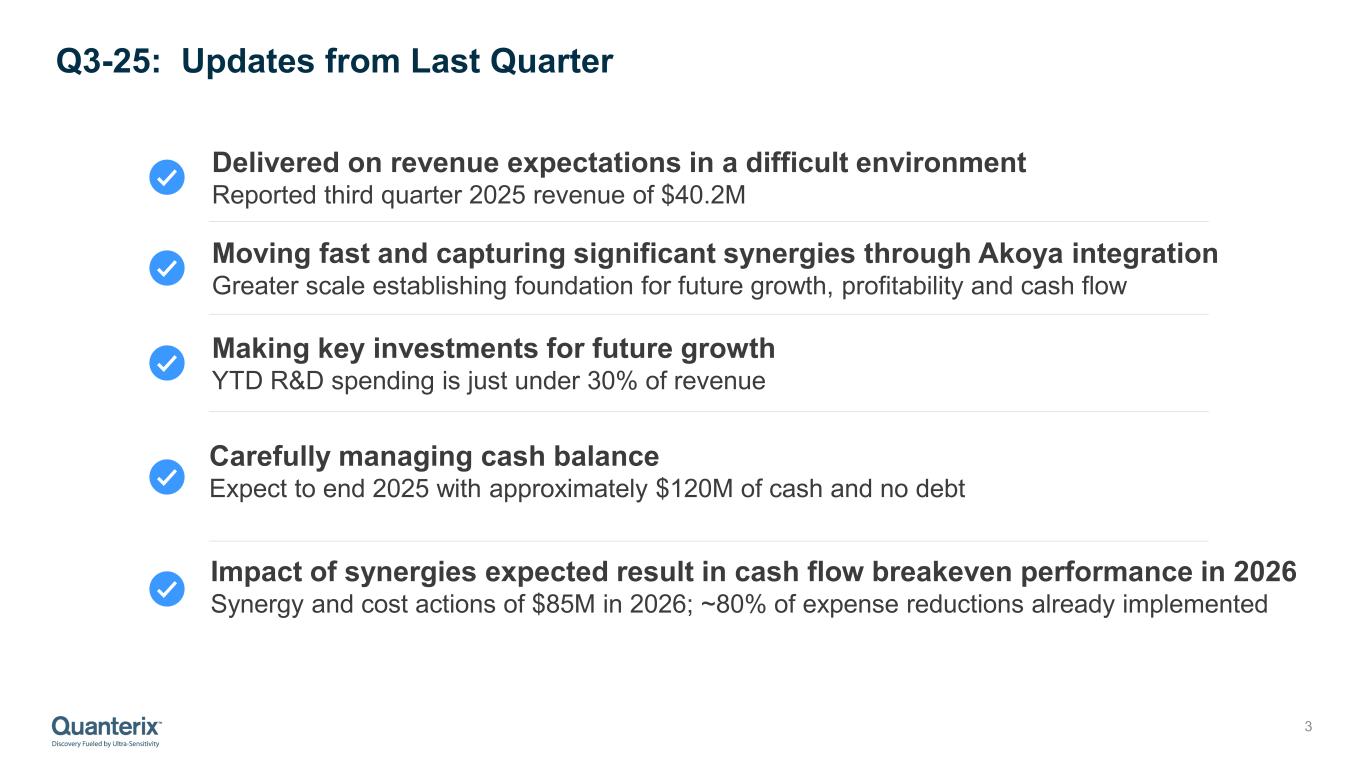 “During the third quarter, we delivered on our revenue expectations despite challenging market conditions,” said Masoud Toloue, Chief Executive Officer of Quanterix. “Equally important, we achieved key integration milestones from our Akoya transaction — keeping us firmly on track to realize $85 million in annualized synergies and reach cash flow break-even in 2026. Together, we have built a stronger, more scalable company with the foundation to drive sustained growth, profitability, and cash flow in the years ahead.”