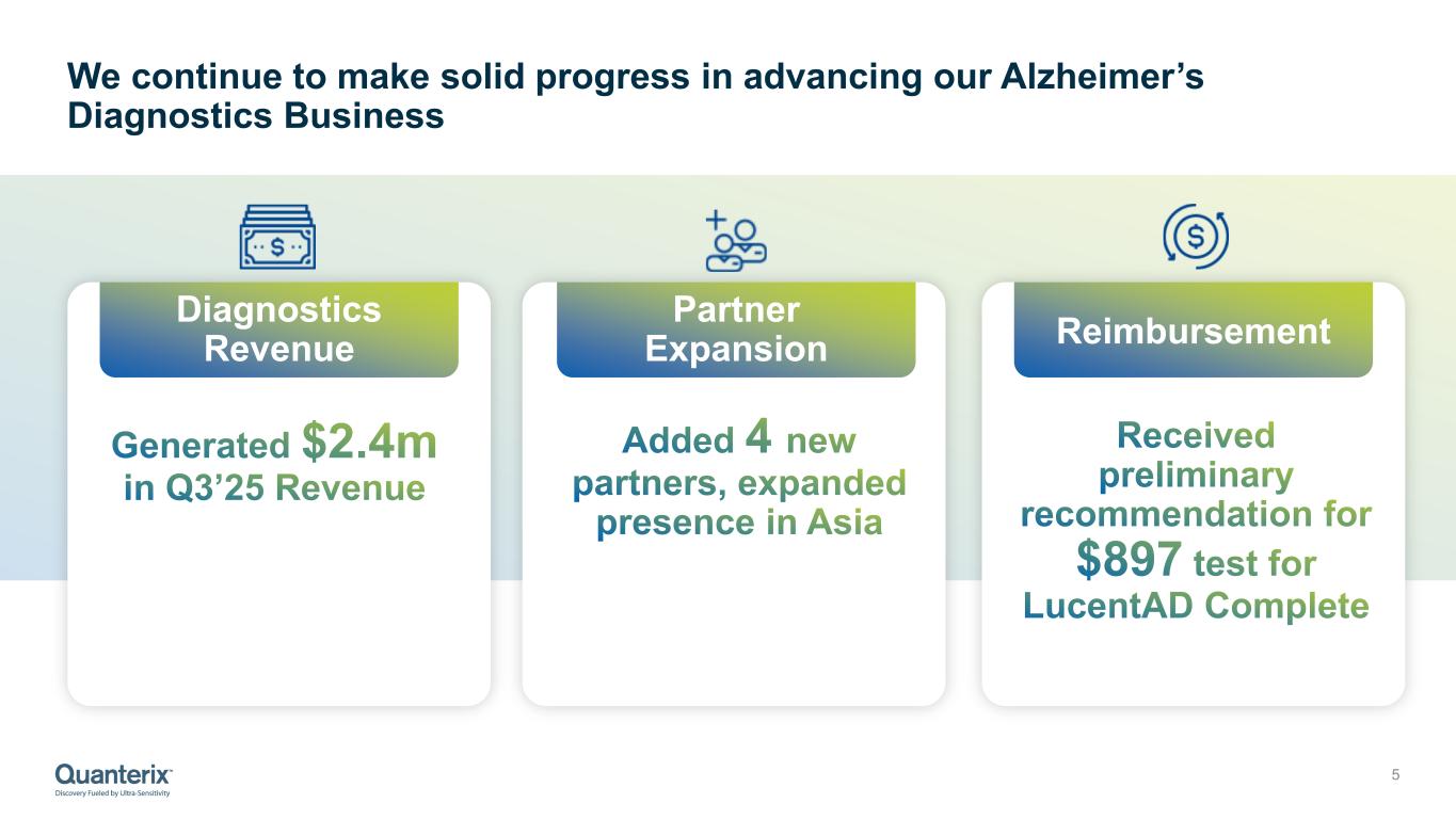 “Our Alzheimer’s diagnostics business also continues to accelerate. With a positive Medicare pricing recommendation and expanding partnerships across Asia, we are advancing toward a future where blood-based testing for neurodegenerative disease becomes standard clinical practice — and Quanterix is at the center of that transformation.”