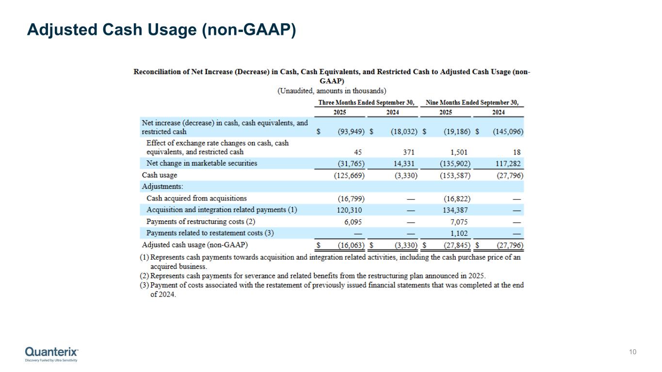 •The Company ended the third quarter with $138.1 million of cash, cash equivalents, marketable securities, and restricted cash. Adjusted cash usage, after accounting for one-time deal and restructuring costs, was $16.1 million. Adjusted cash usage is expected to decline in Q4 2025 due to improved working capital performance and a full quarter effect of cost synergies. The company continues to expect it will end 2025 with approximately $120 million in cash, cash equivalents, marketable securities, and restricted cash.
