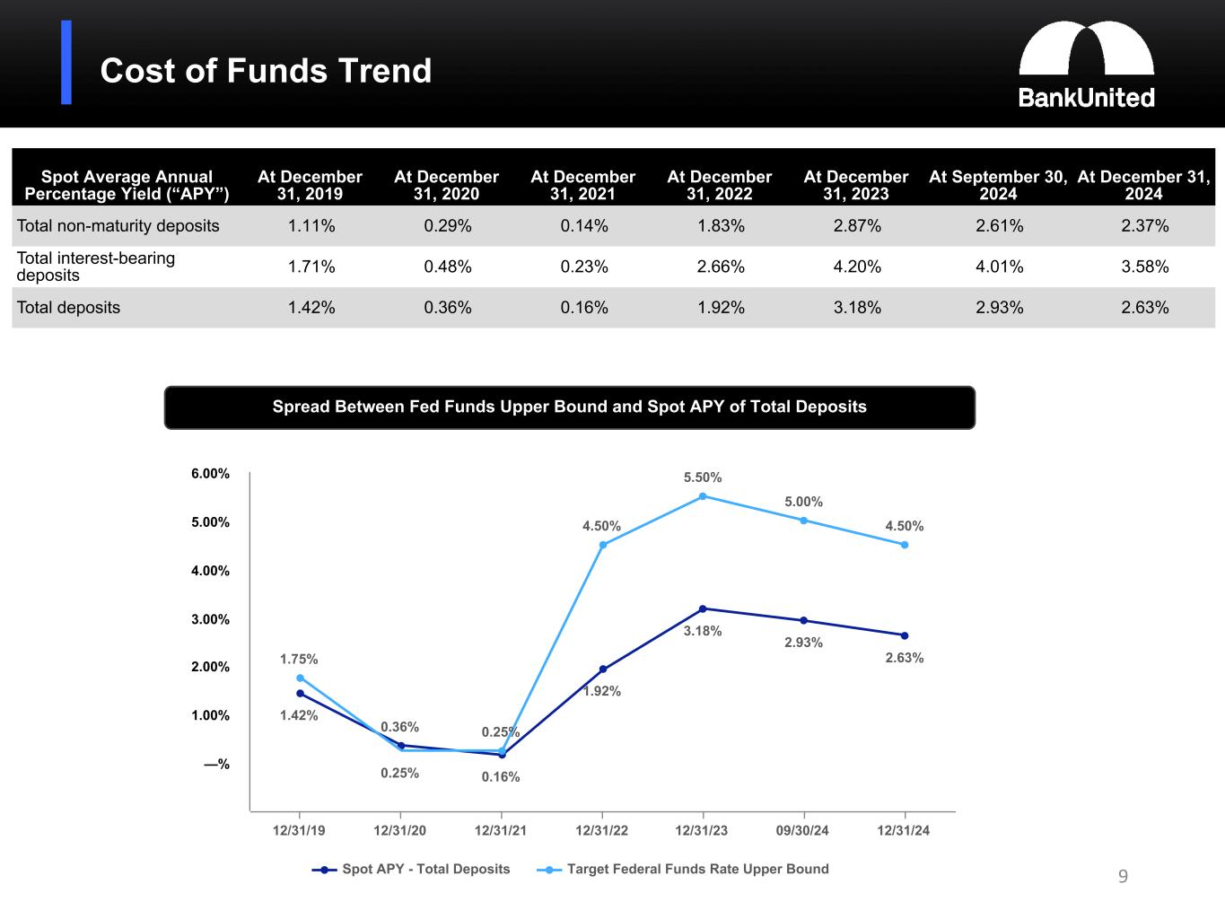 •The average cost of total deposits declined by 0.34% to 2.72% for the quarter ended December 31, 2024 from 3.06% for the immediately preceding quarter ended September 30, 2024, while the average cost of interest bearing deposits declined by 0.45% to 3.75% from 4.20% for those same comparable periods. The spot APY of total deposits declined to 2.63% at December 31, 2024 from 2.93% at September 30, 2024 while the spot APY of interest bearing deposits declined to 3.58% at December 31, 2024 from 4.01% at September 30, 2024.