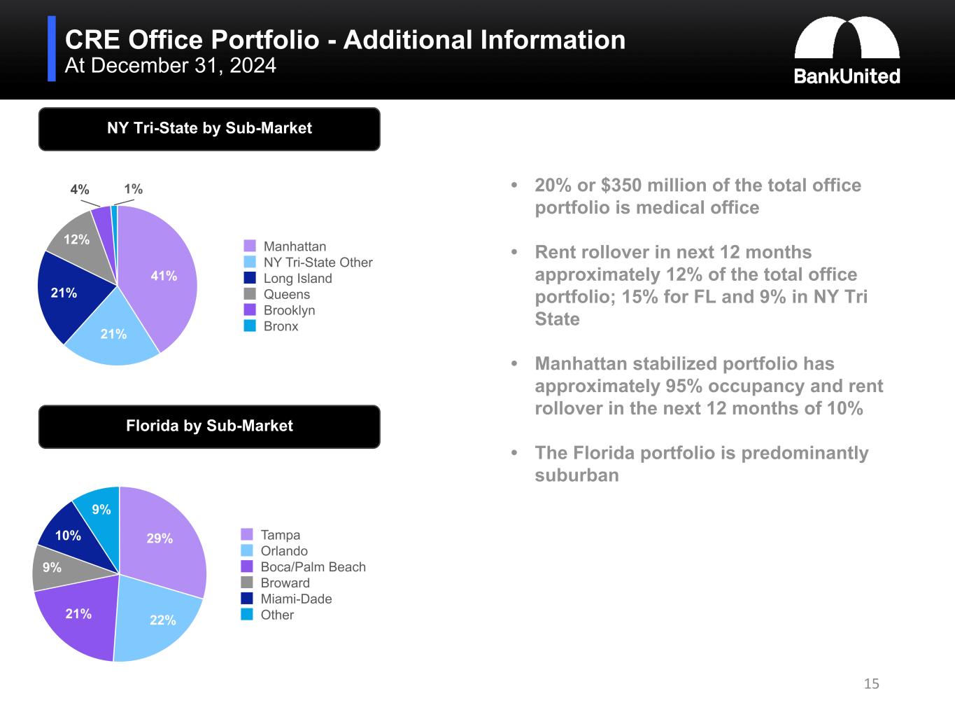 •At December 31, 2024, the weighted average LTV of the CRE portfolio was 55.0%, the weighted average DSCR was 1.76, 54% of the portfolio was collateralized by properties located in Florida and 25% was collateralized by properties located in the New York tri-state area. For the office sub-segment, the weighted average LTV was 65.2%, the weighted average DSCR was 1.57, 57% was collateralized by properties in Florida, substantially all of which was suburban, and 23% was collateralized by properties located in the New York tri-state area.