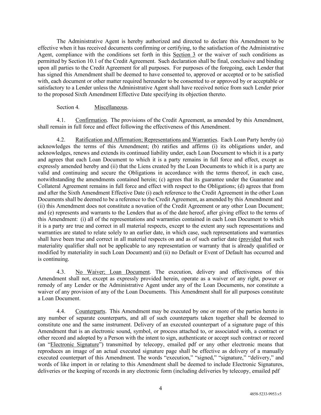 (d) Counterparts. This Amendment may be executed by one or more of the parties hereto in any number of separate counterparts, and all of such counterparts taken together shall be deemed to constitute one and the same instrument. Delivery of an executed counterpart of a signature page of this Amendment that is an electronic sound, symbol, or process attached to, or associated with, a contract or other record and adopted by a Person with the intent to sign, authenticate or accept such contract or record (an “Electronic Signature”) transmitted by telecopy, emailed pdf or any other electronic means that reproduces an image of an actual executed signature page shall be effective as delivery of a manually executed counterpart of this Amendment. The words “execution,” “signed,” “signature,” “delivery,” and words of like import in or relating to this Amendment shall be deemed to include Electronic Signatures, deliveries or the keeping of records in any electronic form (including deliveries by telecopy, emailed pdf or any other electronic means that reproduces an image of an actual executed signature page), each of which shall be of the same legal effect, validity or enforceability as a manually executed signature, physical delivery thereof or the use of a paper-based recordkeeping system, as the case may be; provided that, without limiting the foregoing, upon the request of the Administrative Agent, any electronic signature shall be promptly followed by such manually executed counterpart (in such number as may be reasonably requested by the Administrative Agent).