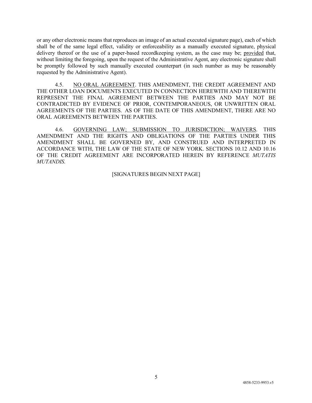 (e) NO ORAL AGREEMENT. THIS AMENDMENT, THE CREDIT AGREEMENT AND THE OTHER LOAN DOCUMENTS EXECUTED IN CONNECTION HEREWITH AND THEREWITH REPRESENT THE FINAL AGREEMENT BETWEEN THE PARTIES AND MAY NOT BE CONTRADICTED BY EVIDENCE OF PRIOR, CONTEMPORANEOUS, OR UNWRITTEN ORAL AGREEMENTS OF THE PARTIES. AS OF THE DATE OF THIS AMENDMENT, THERE ARE NO ORAL AGREEMENTS BETWEEN THE PARTIES.