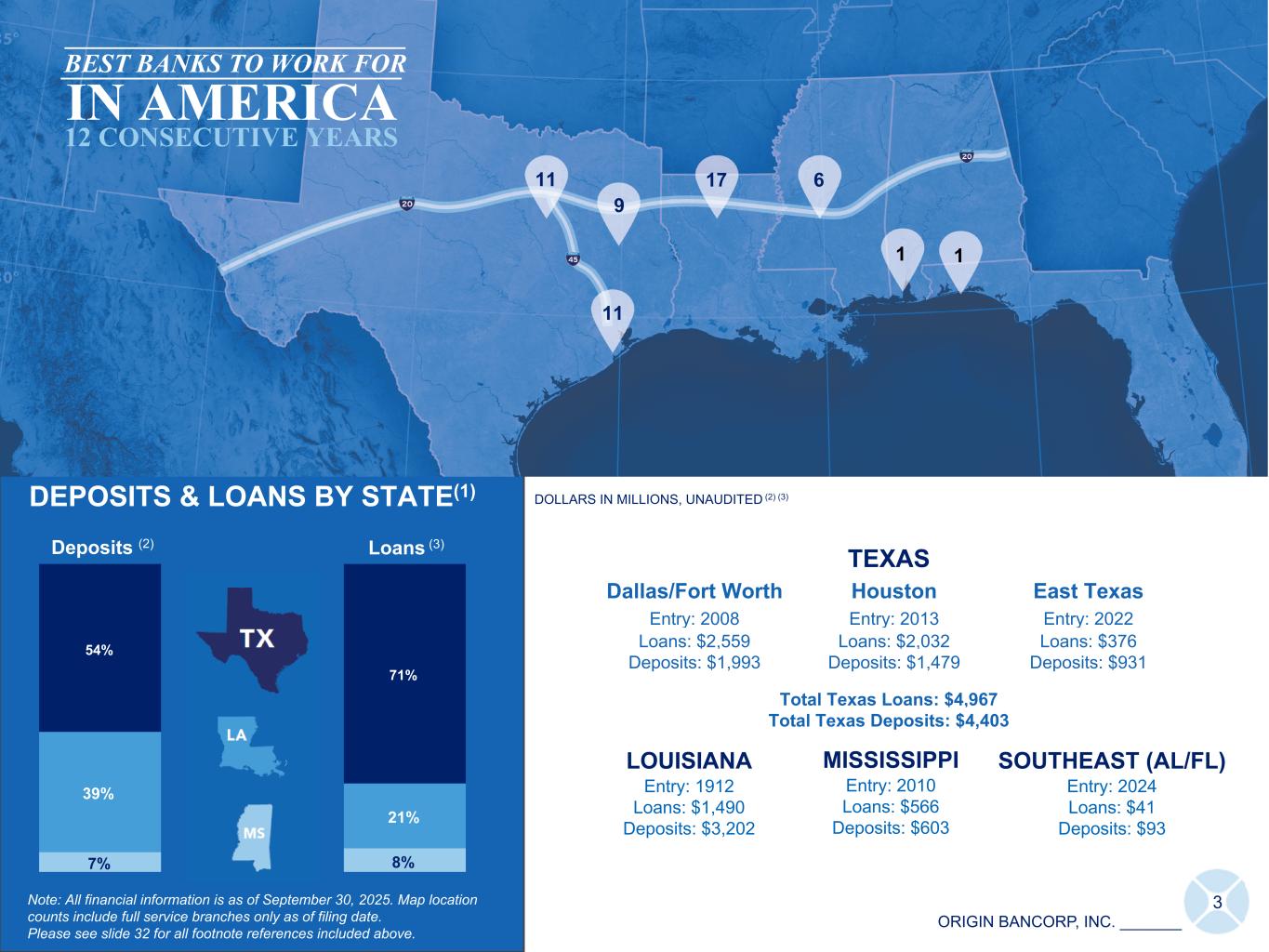 ルイジアナ州ラストン(2025年10月22日)-オリジン銀行(以下「オリジン銀行」)の持株会社であるオリジン・バンコープ(NYSE: OBK)(以下「オリジン」)は本日、2025年9月30日に終了した四半期の純利益が860万ドル、希薄化後1株当たり利益(以下「EPS」)が0.27ドルであったこと(2025年6月30日に終了した四半期の純利益は1,460万ドル、希薄化後1株当たり利益は0.47ドル)を発表しました。2025年9月30日に終了した四半期の税引前・引当金前利益(以下「PTPP」)(1)は、前年同期の2,150万ドルに対し、4,780万ドルでした。