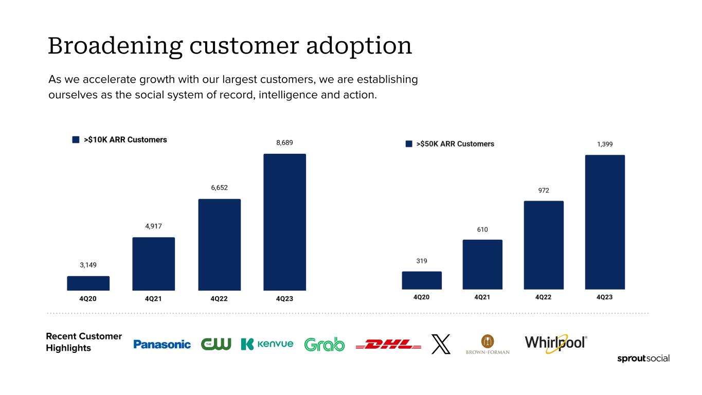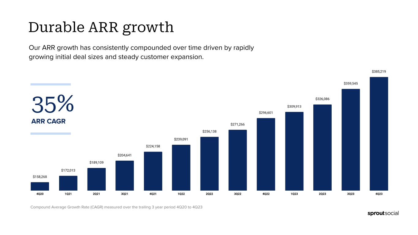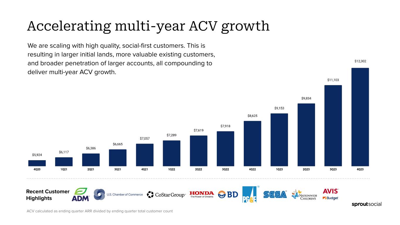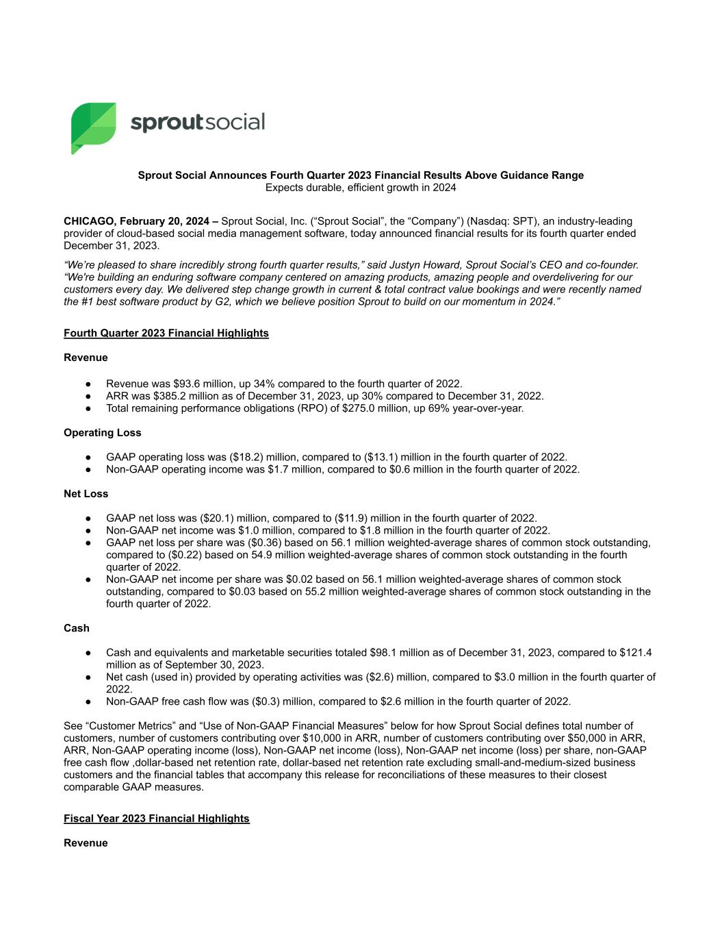 ● Total revenue was $333.6 million, up 31% compared to fiscal 2022. Operating Loss ● GAAP operating loss was ($69.3) million, compared to ($51.7) million in fiscal 2022. ● Non-GAAP operating income was $4.7 million, compared to a Non-GAAP operating loss of ($3.9) million in fiscal 2022. Customer Metrics ● Grew number of customers contributing over $10,000 in ARR to 8,689 customers as of December 31, 2023, up 31% compared to December 31, 2022. ● Grew number of customers contributing over $50,000 in ARR to 1,399 customers as of December 31, 2023, up 44% compared to December 31, 2022. ● Total number of customers as of December 31, 2023 was 31,320, down 9% compared to December 31, 2022. ● Dollar-based net retention rate was 107% in 2023, compared with 109% in 2022. ● Dollar-based net retention rate excluding small-and-medium-sized business (SMB) customers was 111% in 2023, compared with 116% in 2022. Recent Customer Highlights ● During the fourth quarter, we had the opportunity to grow with great new & existing customers like X (fka Twitter), DHL International, Brown-Forman Corporation, Kenvue, The CW Network, Archer-Daniels-Midland, U.S. Chamber of Commerce, American Honda Motor Company, Whirlpool, Avis Budget Group, PG&E Corporation, Panasonic, Nationwide Children’s Hospital, Sega of America, Grab Taxi, Becton Dickinson and CoStar Group. Recent Business Highlights Sprout Social recently: ● Named #1 best software product by G2 (here). ● Recognized by G2’s 2023 Winter Reports as a leader across 150 categories (here). ● Launched new Social Customer Care solution to power exceptional customer experience (here) ● Announced an expanded partnership with Reddit to deliver deeper, real-time Reddit insights to customers (here). ● Named Scott Morris as CMO (here) and announced the promotion of Alan Boyce to CTO (here). ● Featured as a Great Place to Work for Parents for the 4th consecutive year and as a Built In Best Place to Work in Chicago and Seattle. ● Received ISO 27001 and ISO 27701 certifications for information management and privacy management (here). First Quarter and 2024 Financial Outlook For the first quarter of 2024, the Company currently expects: ● Total revenue between $97.2 million and $97.3 million, or growth of greater than 29%. ● Non-GAAP operating income to be between $0.6 million and $0.7 million. ● Non-GAAP net income per share of between $0.00 and $0.01 based on approximately 56.4 million weighted-average shares of common stock outstanding. “Our execution and leading indicators in Q4 were strong,” said Joe Del Preto, CFO. “We’ve largely moved away from our low end growth anchor. We believe the step change in quality of our Q4 outperformance and notable momentum with leading social-first brands position Sprout to continue to execute well on our journey towards $1B in annual revenue.” For the full year 2024, the Company currently expects: ● Total revenue to be between $425.3 million and $425.5 million. ● Non-GAAP operating income between $15.0 million and $16.0 million. ● This implies year-over-year Non-GAAP operating margin improvement of roughly 220bps. ● Non-GAAP net income per share between $0.22 and $0.23 based on approximately 57.0 million weighted-average shares of common stock outstanding.