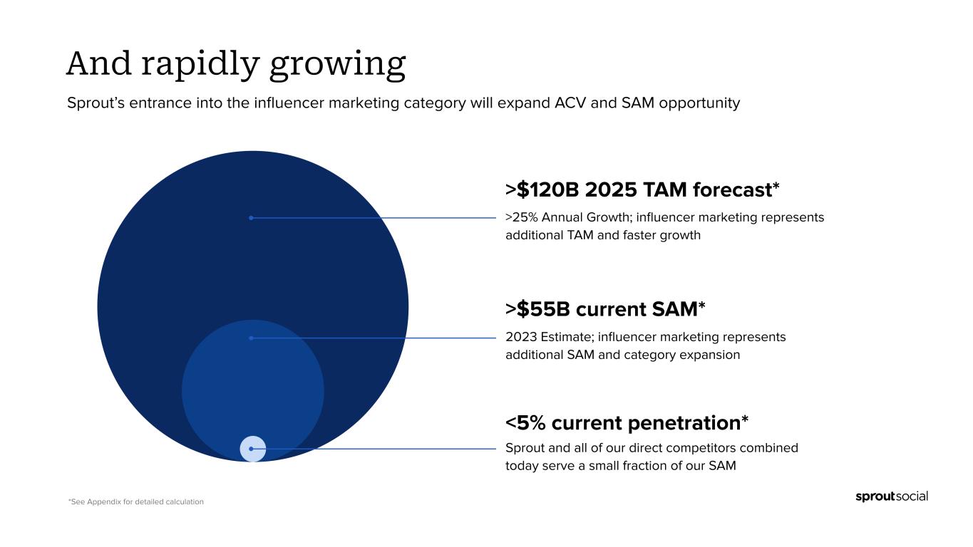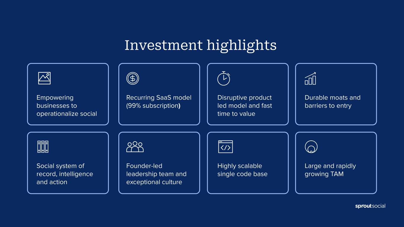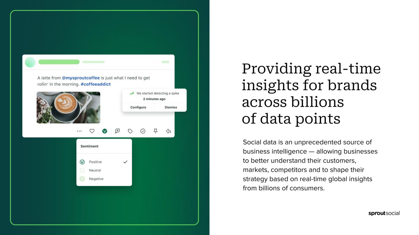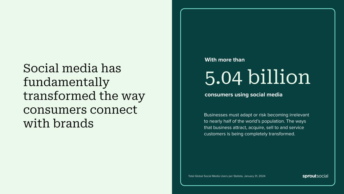 ● Total revenue was $333.6 million, up 31% compared to fiscal 2022. Operating Loss ● GAAP operating loss was ($69.3) million, compared to ($51.7) million in fiscal 2022. ● Non-GAAP operating income was $4.7 million, compared to a Non-GAAP operating loss of ($3.9) million in fiscal 2022. Customer Metrics ● Grew number of customers contributing over $10,000 in ARR to 8,689 customers as of December 31, 2023, up 31% compared to December 31, 2022. ● Grew number of customers contributing over $50,000 in ARR to 1,399 customers as of December 31, 2023, up 44% compared to December 31, 2022. ● Total number of customers as of December 31, 2023 was 31,320, down 9% compared to December 31, 2022. ● Dollar-based net retention rate was 107% in 2023, compared with 109% in 2022. ● Dollar-based net retention rate excluding small-and-medium-sized business (SMB) customers was 111% in 2023, compared with 116% in 2022. Recent Customer Highlights ● During the fourth quarter, we had the opportunity to grow with great new & existing customers like X (fka Twitter), DHL International, Brown-Forman Corporation, Kenvue, The CW Network, Archer-Daniels-Midland, U.S. Chamber of Commerce, American Honda Motor Company, Whirlpool, Avis Budget Group, PG&E Corporation, Panasonic, Nationwide Children’s Hospital, Sega of America, Grab Taxi, Becton Dickinson and CoStar Group. Recent Business Highlights Sprout Social recently: ● Named #1 best software product by G2 (here). ● Recognized by G2’s 2023 Winter Reports as a leader across 150 categories (here). ● Launched new Social Customer Care solution to power exceptional customer experience (here) ● Announced an expanded partnership with Reddit to deliver deeper, real-time Reddit insights to customers (here). ● Named Scott Morris as CMO (here) and announced the promotion of Alan Boyce to CTO (here). ● Featured as a Great Place to Work for Parents for the 4th consecutive year and as a Built In Best Place to Work in Chicago and Seattle. ● Received ISO 27001 and ISO 27701 certifications for information management and privacy management (here). First Quarter and 2024 Financial Outlook For the first quarter of 2024, the Company currently expects: ● Total revenue between $97.2 million and $97.3 million, or growth of greater than 29%. ● Non-GAAP operating income to be between $0.6 million and $0.7 million. ● Non-GAAP net income per share of between $0.00 and $0.01 based on approximately 56.4 million weighted-average shares of common stock outstanding. “Our execution and leading indicators in Q4 were strong,” said Joe Del Preto, CFO. “We’ve largely moved away from our low end growth anchor. We believe the step change in quality of our Q4 outperformance and notable momentum with leading social-first brands position Sprout to continue to execute well on our journey towards $1B in annual revenue.” For the full year 2024, the Company currently expects: ● Total revenue to be between $425.3 million and $425.5 million. ● Non-GAAP operating income between $15.0 million and $16.0 million. ● This implies year-over-year Non-GAAP operating margin improvement of roughly 220bps. ● Non-GAAP net income per share between $0.22 and $0.23 based on approximately 57.0 million weighted-average shares of common stock outstanding.