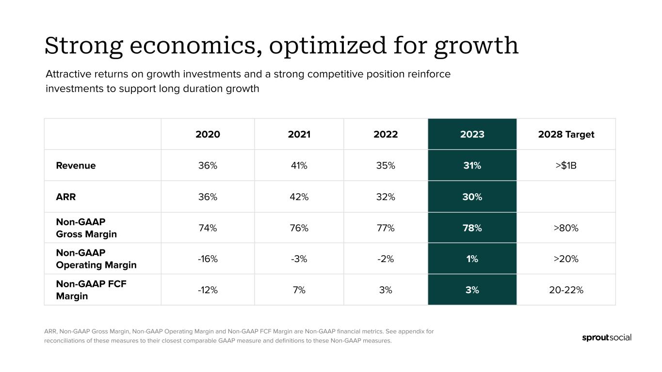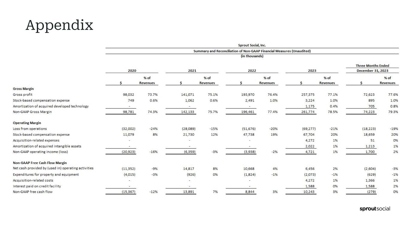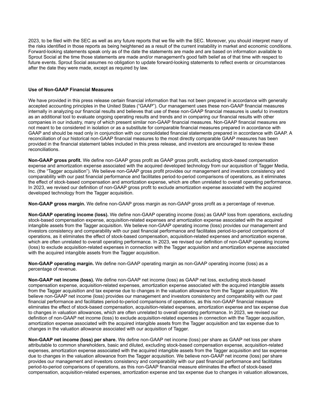 2023, to be filed with the SEC as well as any future reports that we file with the SEC. Moreover, you should interpret many of the risks identified in those reports as being heightened as a result of the current instability in market and economic conditions. Forward-looking statements speak only as of the date the statements are made and are based on information available to Sprout Social at the time those statements are made and/or management's good faith belief as of that time with respect to future events. Sprout Social assumes no obligation to update forward-looking statements to reflect events or circumstances after the date they were made, except as required by law. Use of Non-GAAP Financial Measures We have provided in this press release certain financial information that has not been prepared in accordance with generally accepted accounting principles in the United States (“GAAP”). Our management uses these non-GAAP financial measures internally in analyzing our financial results and believes that use of these non-GAAP financial measures is useful to investors as an additional tool to evaluate ongoing operating results and trends and in comparing our financial results with other companies in our industry, many of which present similar non-GAAP financial measures. Non-GAAP financial measures are not meant to be considered in isolation or as a substitute for comparable financial measures prepared in accordance with GAAP and should be read only in conjunction with our consolidated financial statements prepared in accordance with GAAP. A reconciliation of our historical non-GAAP financial measures to the most directly comparable GAAP measures has been provided in the financial statement tables included in this press release, and investors are encouraged to review these reconciliations. Non-GAAP gross profit. We define non-GAAP gross profit as GAAP gross profit, excluding stock-based compensation expense and amortization expense associated with the acquired developed technology from our acquisition of Tagger Media, Inc. (the “Tagger acquisition”). We believe non-GAAP gross profit provides our management and investors consistency and comparability with our past financial performance and facilitates period-to-period comparisons of operations, as it eliminates the effect of stock-based compensation and amortization expense, which are often unrelated to overall operating performance. In 2023, we revised our definition of non-GAAP gross profit to exclude amortization expense associated with the acquired developed technology from the Tagger acquisition. Non-GAAP gross margin. We define non-GAAP gross margin as non-GAAP gross profit as a percentage of revenue. Non-GAAP operating income (loss). We define non-GAAP operating income (loss) as GAAP loss from operations, excluding stock-based compensation expense, acquisition-related expenses and amortization expense associated with the acquired intangible assets from the Tagger acquisition. We believe non-GAAP operating income (loss) provides our management and investors consistency and comparability with our past financial performance and facilitates period-to-period comparisons of operations, as it eliminates the effect of stock-based compensation, acquisition-related expenses and amortization expense, which are often unrelated to overall operating performance. In 2023, we revised our definition of non-GAAP operating income (loss) to exclude acquisition-related expenses in connection with the Tagger acquisition and amortization expense associated with the acquired intangible assets from the Tagger acquisition. Non-GAAP operating margin. We define non-GAAP operating margin as non-GAAP operating income (loss) as a percentage of revenue. Non-GAAP net income (loss). We define non-GAAP net income (loss) as GAAP net loss, excluding stock-based compensation expense, acquisition-related expenses, amortization expense associated with the acquired intangible assets from the Tagger acquisition and tax expense due to changes in the valuation allowance from the Tagger acquisition. We believe non-GAAP net income (loss) provides our management and investors consistency and comparability with our past financial performance and facilitates period-to-period comparisons of operations, as this non-GAAP financial measure eliminates the effect of stock-based compensation, acquisition-related expenses, amortization expense and tax expense due to changes in valuation allowances, which are often unrelated to overall operating performance. In 2023, we revised our definition of non-GAAP net income (loss) to exclude acquisition-related expenses in connection with the Tagger acquisition, amortization expense associated with the acquired intangible assets from the Tagger acquisition and tax expense due to changes in the valuation allowance associated with our acquisition of Tagger. Non-GAAP net income (loss) per share. We define non-GAAP net income (loss) per share as GAAP net loss per share attributable to common shareholders, basic and diluted, excluding stock-based compensation expense, acquisition-related expenses, amortization expense associated with the acquired intangible assets from the Tagger acquisition and tax expense due to changes in the valuation allowance from the Tagger acquisition. We believe non-GAAP net income (loss) per share provides our management and investors consistency and comparability with our past financial performance and facilitates period-to-period comparisons of operations, as this non-GAAP financial measure eliminates the effect of stock-based compensation, acquisition-related expenses, amortization expense and tax expense due to changes in valuation allowances,