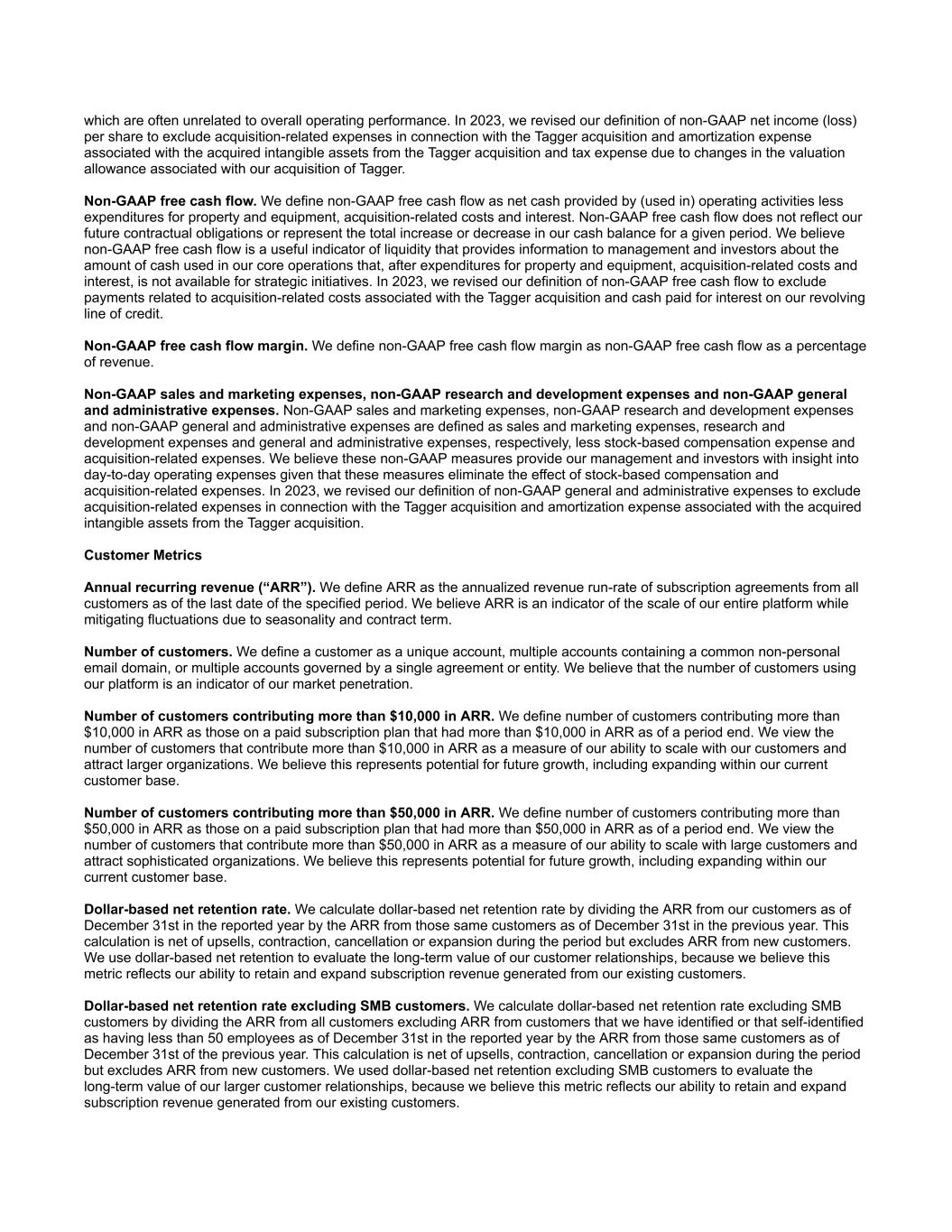 which are often unrelated to overall operating performance. In 2023, we revised our definition of non-GAAP net income (loss) per share to exclude acquisition-related expenses in connection with the Tagger acquisition and amortization expense associated with the acquired intangible assets from the Tagger acquisition and tax expense due to changes in the valuation allowance associated with our acquisition of Tagger. Non-GAAP free cash flow. We define non-GAAP free cash flow as net cash provided by (used in) operating activities less expenditures for property and equipment, acquisition-related costs and interest. Non-GAAP free cash flow does not reflect our future contractual obligations or represent the total increase or decrease in our cash balance for a given period. We believe non-GAAP free cash flow is a useful indicator of liquidity that provides information to management and investors about the amount of cash used in our core operations that, after expenditures for property and equipment, acquisition-related costs and interest, is not available for strategic initiatives. In 2023, we revised our definition of non-GAAP free cash flow to exclude payments related to acquisition-related costs associated with the Tagger acquisition and cash paid for interest on our revolving line of credit. Non-GAAP free cash flow margin. We define non-GAAP free cash flow margin as non-GAAP free cash flow as a percentage of revenue. Non-GAAP sales and marketing expenses, non-GAAP research and development expenses and non-GAAP general and administrative expenses. Non-GAAP sales and marketing expenses, non-GAAP research and development expenses and non-GAAP general and administrative expenses are defined as sales and marketing expenses, research and development expenses and general and administrative expenses, respectively, less stock-based compensation expense and acquisition-related expenses. We believe these non-GAAP measures provide our management and investors with insight into day-to-day operating expenses given that these measures eliminate the effect of stock-based compensation and acquisition-related expenses. In 2023, we revised our definition of non-GAAP general and administrative expenses to exclude acquisition-related expenses in connection with the Tagger acquisition and amortization expense associated with the acquired intangible assets from the Tagger acquisition. Customer Metrics Annual recurring revenue (“ARR”). We define ARR as the annualized revenue run-rate of subscription agreements from all customers as of the last date of the specified period. We believe ARR is an indicator of the scale of our entire platform while mitigating fluctuations due to seasonality and contract term. Number of customers. We define a customer as a unique account, multiple accounts containing a common non-personal email domain, or multiple accounts governed by a single agreement or entity. We believe that the number of customers using our platform is an indicator of our market penetration. Number of customers contributing more than $10,000 in ARR. We define number of customers contributing more than $10,000 in ARR as those on a paid subscription plan that had more than $10,000 in ARR as of a period end. We view the number of customers that contribute more than $10,000 in ARR as a measure of our ability to scale with our customers and attract larger organizations. We believe this represents potential for future growth, including expanding within our current customer base. Number of customers contributing more than $50,000 in ARR. We define number of customers contributing more than $50,000 in ARR as those on a paid subscription plan that had more than $50,000 in ARR as of a period end. We view the number of customers that contribute more than $50,000 in ARR as a measure of our ability to scale with large customers and attract sophisticated organizations. We believe this represents potential for future growth, including expanding within our current customer base. Dollar-based net retention rate. We calculate dollar-based net retention rate by dividing the ARR from our customers as of December 31st in the reported year by the ARR from those same customers as of December 31st in the previous year. This calculation is net of upsells, contraction, cancellation or expansion during the period but excludes ARR from new customers. We use dollar-based net retention to evaluate the long-term value of our customer relationships, because we believe this metric reflects our ability to retain and expand subscription revenue generated from our existing customers. Dollar-based net retention rate excluding SMB customers. We calculate dollar-based net retention rate excluding SMB customers by dividing the ARR from all customers excluding ARR from customers that we have identified or that self-identified as having less than 50 employees as of December 31st in the reported year by the ARR from those same customers as of December 31st of the previous year. This calculation is net of upsells, contraction, cancellation or expansion during the period but excludes ARR from new customers. We used dollar-based net retention excluding SMB customers to evaluate the long-term value of our larger customer relationships, because we believe this metric reflects our ability to retain and expand subscription revenue generated from our existing customers.