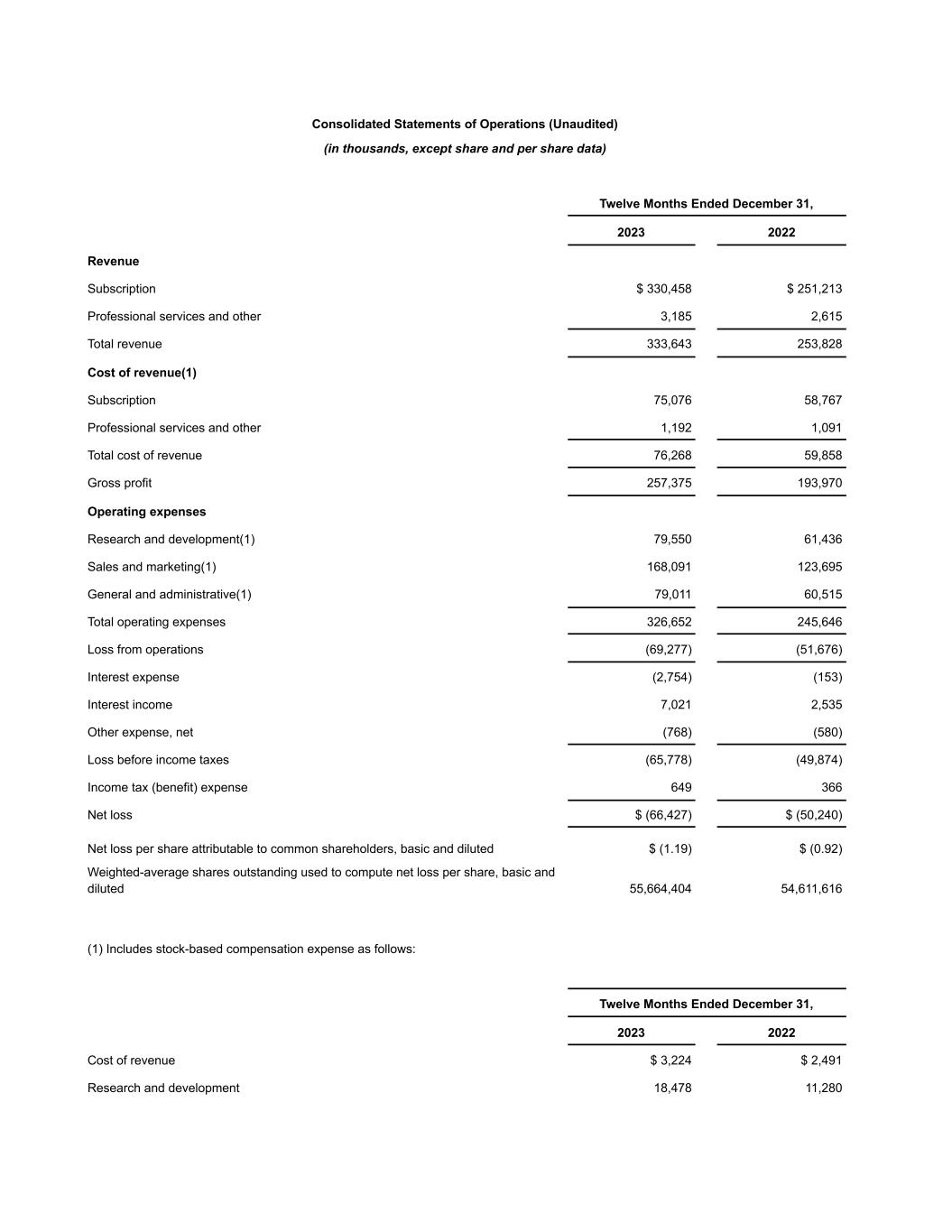 Consolidated Statements of Operations (Unaudited) (in thousands, except share and per share data) Twelve Months Ended December 31, 2023 2022 Revenue Subscription $ 330,458 $ 251,213 Professional services and other 3,185 2,615 Total revenue 333,643 253,828 Cost of revenue(1) Subscription 75,076 58,767 Professional services and other 1,192 1,091 Total cost of revenue 76,268 59,858 Gross profit 257,375 193,970 Operating expenses Research and development(1) 79,550 61,436 Sales and marketing(1) 168,091 123,695 General and administrative(1) 79,011 60,515 Total operating expenses 326,652 245,646 Loss from operations (69,277) (51,676) Interest expense (2,754) (153) Interest income 7,021 2,535 Other expense, net (768) (580) Loss before income taxes (65,778) (49,874) Income tax (benefit) expense 649 366 Net loss $ (66,427) $ (50,240) Net loss per share attributable to common shareholders, basic and diluted $ (1.19) $ (0.92) Weighted-average shares outstanding used to compute net loss per share, basic and diluted 55,664,404 54,611,616 (1) Includes stock-based compensation expense as follows: Twelve Months Ended December 31, 2023 2022 Cost of revenue $ 3,224 $ 2,491 Research and development 18,478 11,280