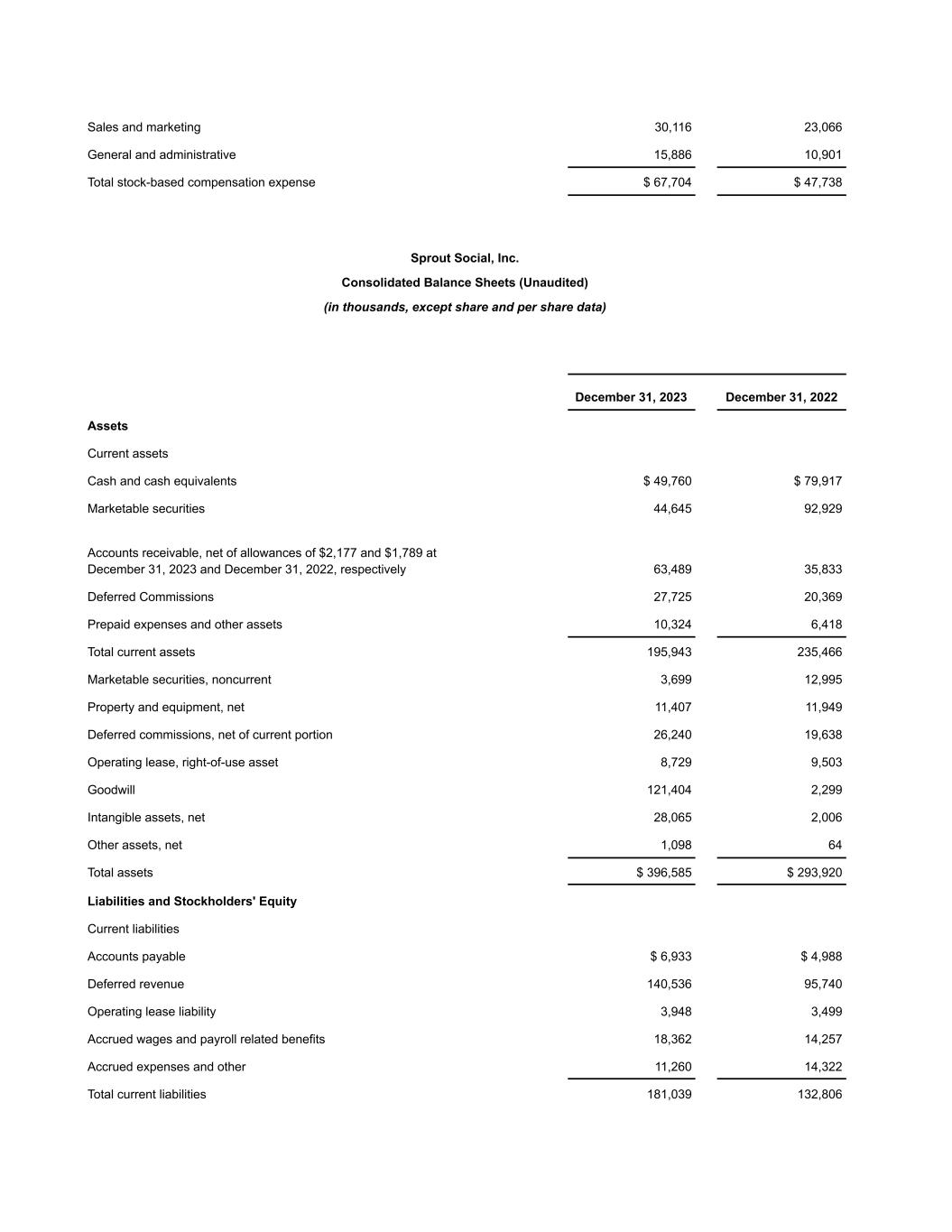 Sales and marketing 30,116 23,066 General and administrative 15,886 10,901 Total stock-based compensation expense $ 67,704 $ 47,738 Sprout Social, Inc. Consolidated Balance Sheets (Unaudited) (in thousands, except share and per share data) December 31, 2023 December 31, 2022 Assets Current assets Cash and cash equivalents $ 49,760 $ 79,917 Marketable securities 44,645 92,929 Accounts receivable, net of allowances of $2,177 and $1,789 at December 31, 2023 and December 31, 2022, respectively 63,489 35,833 Deferred Commissions 27,725 20,369 Prepaid expenses and other assets 10,324 6,418 Total current assets 195,943 235,466 Marketable securities, noncurrent 3,699 12,995 Property and equipment, net 11,407 11,949 Deferred commissions, net of current portion 26,240 19,638 Operating lease, right-of-use asset 8,729 9,503 Goodwill 121,404 2,299 Intangible assets, net 28,065 2,006 Other assets, net 1,098 64 Total assets $ 396,585 $ 293,920 Liabilities and Stockholders' Equity Current liabilities Accounts payable $ 6,933 $ 4,988 Deferred revenue 140,536 95,740 Operating lease liability 3,948 3,499 Accrued wages and payroll related benefits 18,362 14,257 Accrued expenses and other 11,260 14,322 Total current liabilities 181,039 132,806