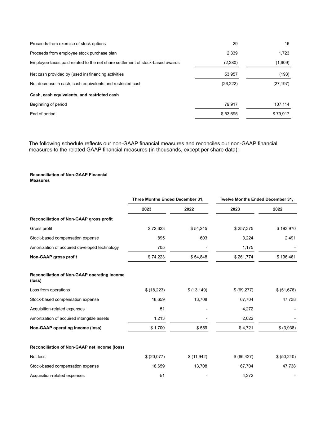 Proceeds from exercise of stock options 29 16 Proceeds from employee stock purchase plan 2,339 1,723 Employee taxes paid related to the net share settlement of stock-based awards (2,380) (1,909) Net cash provided by (used in) financing activities 53,957 (193) Net decrease in cash, cash equivalents and restricted cash (26,222) (27,197) Cash, cash equivalents, and restricted cash Beginning of period 79,917 107,114 End of period $ 53,695 $ 79,917 The following schedule reflects our non-GAAP financial measures and reconciles our non-GAAP financial measures to the related GAAP financial measures (in thousands, except per share data): Reconciliation of Non-GAAP Financial Measures Three Months Ended December 31, Twelve Months Ended December 31, 2023 2022 2023 2022 Reconciliation of Non-GAAP gross profit Gross profit $ 72,623 $ 54,245 $ 257,375 $ 193,970 Stock-based compensation expense 895 603 3,224 2,491 Amortization of acquired developed technology 705 - 1,175 - Non-GAAP gross profit $ 74,223 $ 54,848 $ 261,774 $ 196,461 Reconciliation of Non-GAAP operating income (loss) Loss from operations $ (18,223) $ (13,149) $ (69,277) $ (51,676) Stock-based compensation expense 18,659 13,708 67,704 47,738 Acquisition-related expenses 51 - 4,272 - Amortization of acquired intangible assets 1,213 - 2,022 - Non-GAAP operating income (loss) $ 1,700 $ 559 $ 4,721 $ (3,938) Reconciliation of Non-GAAP net income (loss) Net loss $ (20,077) $ (11,942) $ (66,427) $ (50,240) Stock-based compensation expense 18,659 13,708 67,704 47,738 Acquisition-related expenses 51 - 4,272 -