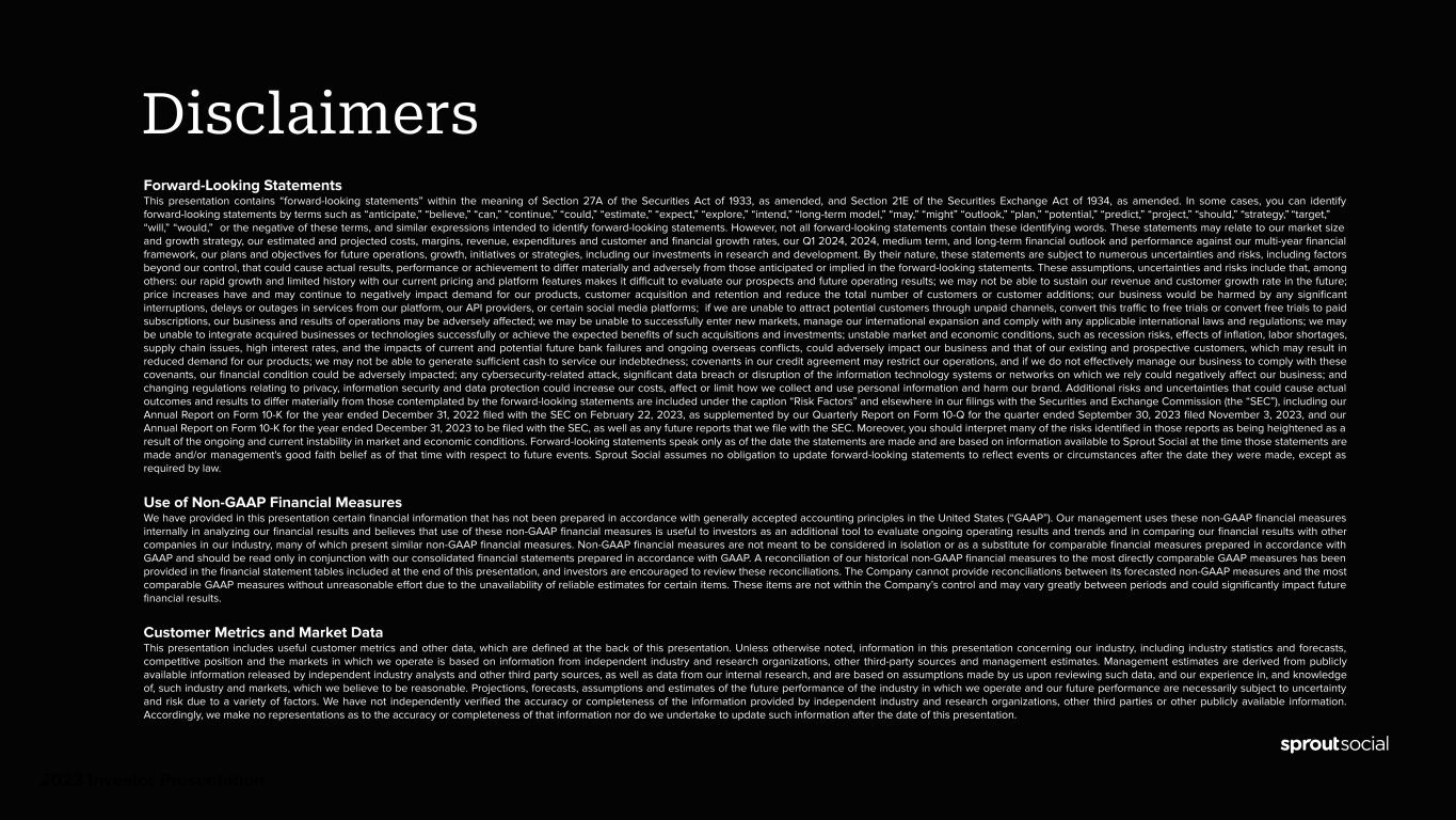 The Company’s first quarter and 2024 financial outlook is based on a number of assumptions that are subject to change and many of which are outside the Company’s control. If actual results vary from these assumptions, the Company’s expectations may change. There can be no assurance that the Company will achieve these results. The Company does not provide guidance for operating loss, the most directly comparable GAAP measure to non-GAAP operating income, net loss per share, the most directly comparable GAAP measure to non-GAAP net income per share, or operating margin, the most directly comparable GAAP measure to Non-GAAP operating margin, and similarly cannot provide a reconciliation between its forecasted non-GAAP operating income, non-GAAP net income per share and non-GAAP operating margin and these comparable GAAP measures without unreasonable effort due to the unavailability of reliable estimates for certain items. These items are not within the Company’s control and may vary greatly between periods and could significantly impact future financial results. Conference Call Information The financial results and business highlights will be discussed on a conference call and webcast scheduled at 4:00 p.m. Central Time (5:00 p.m. Eastern Time) today, February 20, 2024. Online registration for this event conference call can be found at https://conferencingportals.com/event/LOdFIxuX. The live webcast of the conference call can be accessed from Sprout Social’s investor relations website at http://investors.sproutsocial.com. Following completion of the events, a webcast replay will also be available at http://investors.sproutsocial.com for 12 months. About Sprout Social Sprout Social is a global leader in social media management and analytics software. Sprout’s unified platform puts powerful social data into the hands of more than 30,000 brands so they can make strategic decisions that drive business growth and innovation. With a full suite of social media management solutions, Sprout offers comprehensive publishing and engagement functionality, customer care, connected workflows and AI-powered business intelligence. Sprout’s award-winning software operates across all major social media networks and digital platforms. For more information about Sprout Social (NASDAQ: SPT), visit sproutsocial.com. Forward-Looking Statements This press release contains “forward-looking statements” within the meaning of Section 27A of the Securities Act of 1933, as amended, and Section 21E of the Securities Exchange Act of 1934, as amended. In some cases, you can identify forward-looking statements by terms such as “anticipate,” “believe,” “can,” “continue,” “could,” “estimate,” “expect,” “explore,” “intend,” “long-term model,” “may,” “might” “outlook,” “plan,” “potential,” “predict,” “project,” “should,” “strategy,” “target,” “will,” “would,” or the negative of these terms, and similar expressions intended to identify forward-looking statements. However, not all forward-looking statements contain these identifying words. These statements may relate to our market size and growth strategy, our estimated and projected costs, margins, revenue, expenditures and customer and financial growth rates, our Q1 2024 and full year 2024 financial outlook, our plans and objectives for future operations, growth, initiatives or strategies. By their nature, these statements are subject to numerous uncertainties and risks, including factors beyond our control, that could cause actual results, performance or achievement to differ materially and adversely from those anticipated or implied in the forward-looking statements. These assumptions, uncertainties and risks include that, among others: we may not be able to sustain our revenue and customer growth rate in the future; price increases have and may continue to negatively impact demand for our products, customer acquisition and retention and reduce the total number of customers or customer additions; our business would be harmed by any significant interruptions, delays or outages in services from our platform, our API providers, or certain social media platforms; if we are unable to attract potential customers through unpaid channels, convert this traffic to free trials or convert free trials to paid subscriptions, our business and results of operations may be adversely affected; we may be unable to successfully enter new markets, manage our international expansion and comply with any applicable international laws and regulations; we may be unable to integrate acquired businesses or technologies successfully or achieve the expected benefits of such acquisitions and investments; unstable market and economic conditions, such as recession risks, effects of inflation, labor shortages, supply chain issues, high interest rates, and the impacts of current and potential future bank failures and impacts of ongoing overseas conflicts, could adversely impact our business and that of our existing and prospective customers, which may result in reduced demand for our products; we may not be able to generate sufficient cash to service our indebtedness; covenants in our credit agreement may restrict our operations, and if we do not effectively manage our business to comply with these covenants, our financial condition could be adversely impacted; any cybersecurity-related attack, significant data breach or disruption of the information technology systems or networks on which we rely could negatively affect our business; and changing regulations relating to privacy, information security and data protection could increase our costs, affect or limit how we collect and use personal information and harm our brand. Additional risks and uncertainties that could cause actual outcomes and results to differ materially from those contemplated by the forward-looking statements are included under the capt