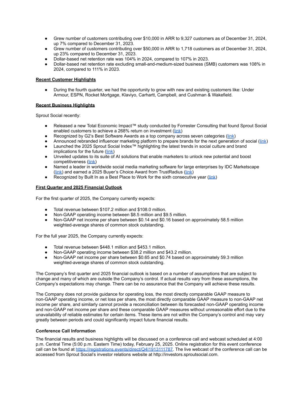 ● Grew number of customers contributing over $10,000 in ARR to 9,327 customers as of December 31, 2024, up 7% compared to December 31, 2023. ● Grew number of customers contributing over $50,000 in ARR to 1,718 customers as of December 31, 2024, up 23% compared to December 31, 2023. ● Dollar-based net retention rate was 104% in 2024, compared to 107% in 2023. ● Dollar-based net retention rate excluding small-and-medium-sized business (SMB) customers was 108% in 2024, compared to 111% in 2023. Recent Customer Highlights ● During the fourth quarter, we had the opportunity to grow with new and existing customers like: Under Armour, ESPN, Rocket Mortgage, Klaviyo, Carhartt, Campbell, and Cushman & Wakefield. Recent Business Highlights Sprout Social recently: ● Released a new Total Economic Impact™ study conducted by Forrester Consulting that found Sprout Social enabled customers to achieve a 268% return on investment (link) ● Recognized by G2’s Best Software Awards as a top company across seven categories (link) ● Announced rebranded influencer marketing platform to prepare brands for the next generation of social (link) ● Launched the 2025 Sprout Social Index™ highlighting the latest trends in social culture and brand implications for the future (link) ● Unveiled updates to its suite of AI solutions that enable marketers to unlock new potential and boost competitiveness (link) ● Named a leader in worldwide social media marketing software for large enterprises by IDC Marketscape (link) and earned a 2025 Buyer’s Choice Award from TrustRadius (link) ● Recognized by Built In as a Best Place to Work for the sixth consecutive year (link) First Quarter and 2025 Financial Outlook For the first quarter of 2025, the Company currently expects: ● Total revenue between $107.2 million and $108.0 million. ● Non-GAAP operating income between $8.5 million and $9.5 million. ● Non-GAAP net income per share between $0.14 and $0.16 based on approximately 58.5 million weighted-average shares of common stock outstanding. For the full year 2025, the Company currently expects: ● Total revenue between $448.1 million and $453.1 million. ● Non-GAAP operating income between $38.2 million and $43.2 million. ● Non-GAAP net income per share between $0.65 and $0.74 based on approximately 59.3 million weighted-average shares of common stock outstanding. The Company’s first quarter and 2025 financial outlook is based on a number of assumptions that are subject to change and many of which are outside the Company’s control. If actual results vary from these assumptions, the Company’s expectations may change. There can be no assurance that the Company will achieve these results. The Company does not provide guidance for operating loss, the most directly comparable GAAP measure to non-GAAP operating income, or net loss per share, the most directly comparable GAAP measure to non-GAAP net income per share, and similarly cannot provide a reconciliation between its forecasted non-GAAP operating income and non-GAAP net income per share and these comparable GAAP measures without unreasonable effort due to the unavailability of reliable estimates for certain items. These items are not within the Company’s control and may vary greatly between periods and could significantly impact future financial results. Conference Call Information The financial results and business highlights will be discussed on a conference call and webcast scheduled at 4:00 p.m. Central Time (5:00 p.m. Eastern Time) today, February 25, 2025. Online registration for this event conference call can be found at https://registrations.events/direct/Q4I1913111787. The live webcast of the conference call can be accessed from Sprout Social’s investor relations website at http://investors.sproutsocial.com.