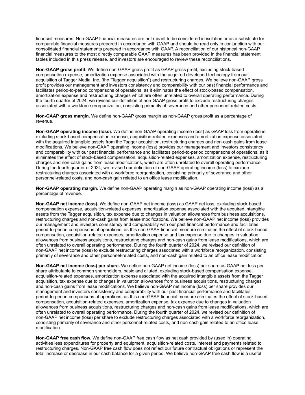 financial measures. Non-GAAP financial measures are not meant to be considered in isolation or as a substitute for comparable financial measures prepared in accordance with GAAP and should be read only in conjunction with our consolidated financial statements prepared in accordance with GAAP. A reconciliation of our historical non-GAAP financial measures to the most directly comparable GAAP measures has been provided in the financial statement tables included in this press release, and investors are encouraged to review these reconciliations. Non-GAAP gross profit. We define non-GAAP gross profit as GAAP gross profit, excluding stock-based compensation expense, amortization expense associated with the acquired developed technology from our acquisition of Tagger Media, Inc. (the “Tagger acquisition”) and restructuring charges. We believe non-GAAP gross profit provides our management and investors consistency and comparability with our past financial performance and facilitates period-to-period comparisons of operations, as it eliminates the effect of stock-based compensation, amortization expense and restructuring charges which are often unrelated to overall operating performance. During the fourth quarter of 2024, we revised our definition of non-GAAP gross profit to exclude restructuring charges associated with a workforce reorganization, consisting primarily of severance and other personnel-related costs. Non-GAAP gross margin. We define non-GAAP gross margin as non-GAAP gross profit as a percentage of revenue. Non-GAAP operating income (loss). We define non-GAAP operating income (loss) as GAAP loss from operations, excluding stock-based compensation expense, acquisition-related expenses and amortization expense associated with the acquired intangible assets from the Tagger acquisition, restructuring charges and non-cash gains from lease modifications. We believe non-GAAP operating income (loss) provides our management and investors consistency and comparability with our past financial performance and facilitates period-to-period comparisons of operations, as it eliminates the effect of stock-based compensation, acquisition-related expenses, amortization expense, restructuring charges and non-cash gains from lease modifications, which are often unrelated to overall operating performance. During the fourth quarter of 2024, we revised our definition of non-GAAP operating income (loss) to exclude restructuring charges associated with a workforce reorganization, consisting primarily of severance and other personnel-related costs, and non-cash gain related to an office lease modification. Non-GAAP operating margin. We define non-GAAP operating margin as non-GAAP operating income (loss) as a percentage of revenue. Non-GAAP net income (loss). We define non-GAAP net income (loss) as GAAP net loss, excluding stock-based compensation expense, acquisition-related expenses, amortization expense associated with the acquired intangible assets from the Tagger acquisition, tax expense due to changes in valuation allowances from business acquisitions, restructuring charges and non-cash gains from lease modifications. We believe non-GAAP net income (loss) provides our management and investors consistency and comparability with our past financial performance and facilitates period-to-period comparisons of operations, as this non-GAAP financial measure eliminates the effect of stock-based compensation, acquisition-related expenses, amortization expense and tax expense due to changes in valuation allowances from business acquisitions, restructuring charges and non-cash gains from lease modifications, which are often unrelated to overall operating performance. During the fourth quarter of 2024, we revised our definition of non-GAAP net income (loss) to exclude restructuring charges associated with a workforce reorganization, consisting primarily of severance and other personnel-related costs, and non-cash gain related to an office lease modification. Non-GAAP net income (loss) per share. We define non-GAAP net income (loss) per share as GAAP net loss per share attributable to common shareholders, basic and diluted, excluding stock-based compensation expense, acquisition-related expenses, amortization expense associated with the acquired intangible assets from the Tagger acquisition, tax expense due to changes in valuation allowances from business acquisitions, restructuring charges and non-cash gains from lease modifications. We believe non-GAAP net income (loss) per share provides our management and investors consistency and comparability with our past financial performance and facilitates period-to-period comparisons of operations, as this non-GAAP financial measure eliminates the effect of stock-based compensation, acquisition-related expenses, amortization expense, tax expense due to changes in valuation allowances from business acquisitions, restructuring charges and non-cash gains from lease modifications, which are often unrelated to overall operating performance. During the fourth quarter of 2024, we revised our definition of non-GAAP net income (loss) per share to exclude restructuring charges associated with a workforce reorganization, consisting primarily of severance and other personnel-related costs, and non-cash gain related to an office lease modification. Non-GAAP free cash flow. We define non-GAAP free cash flow as net cash provided by (used in) operating activities less expenditures for property and equipment, acquisition-related costs, interest and payments related to restructuring charges. Non-GAAP free cash flow does not reflect our future contractual obligations or represent the total increase or decrease in our cash balance for a given period. We believe non-GAAP free cash flow is a useful