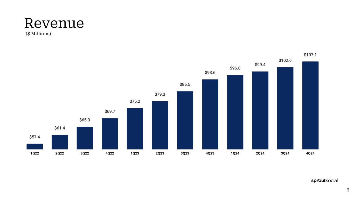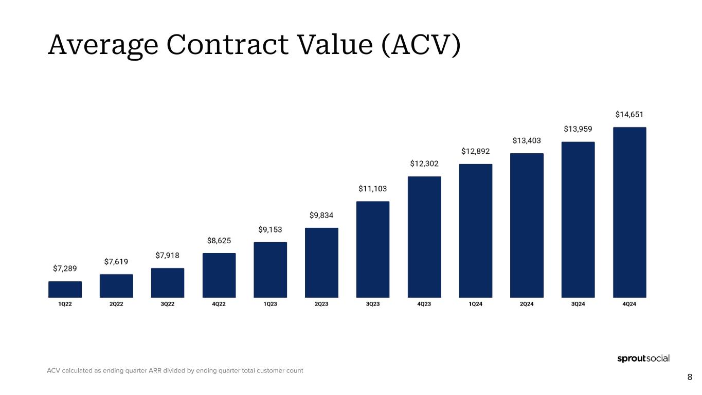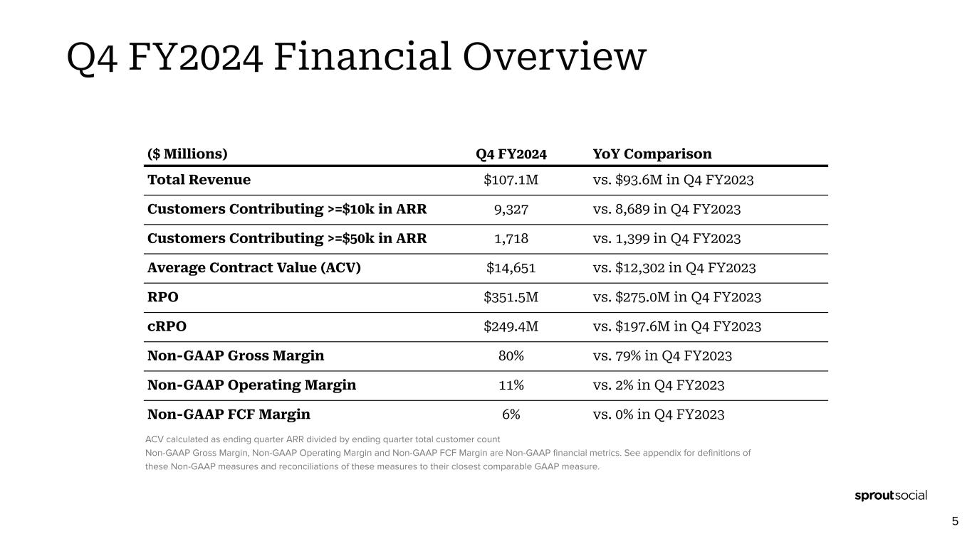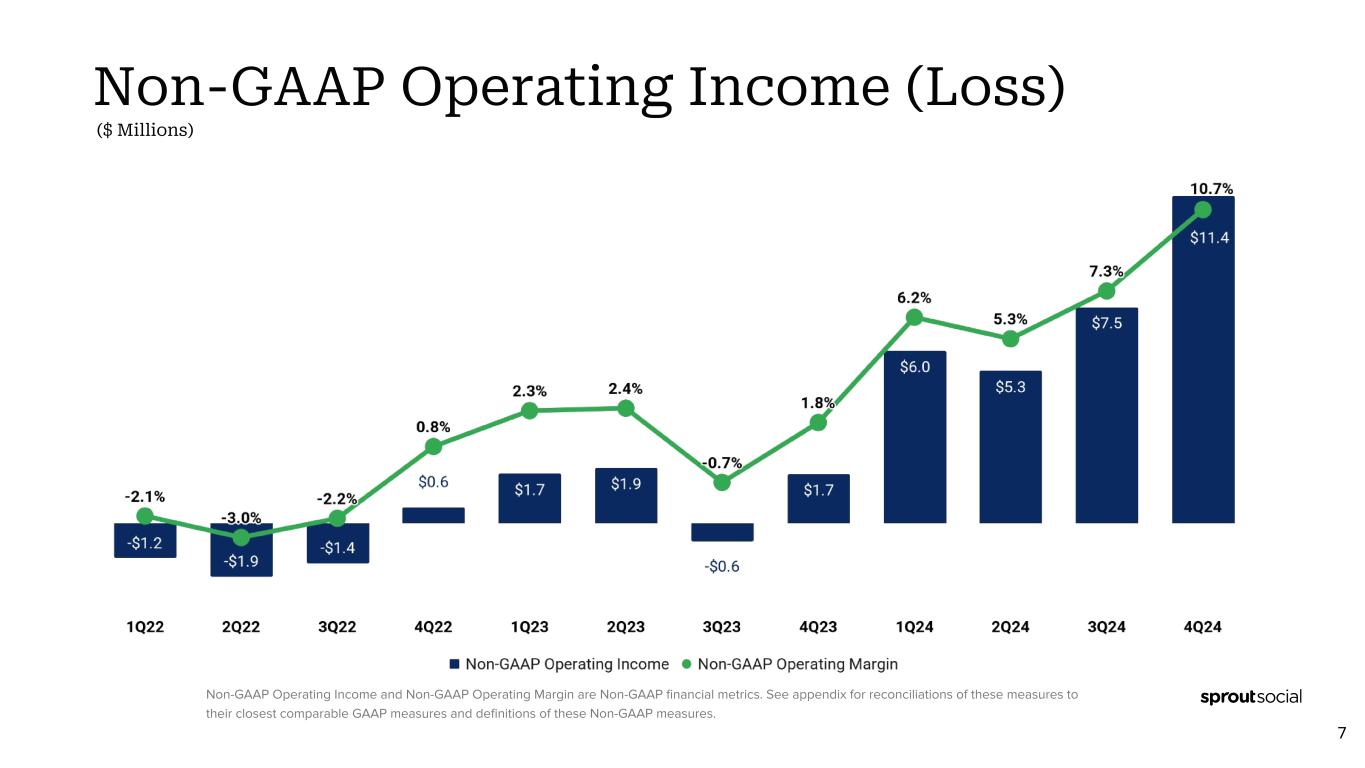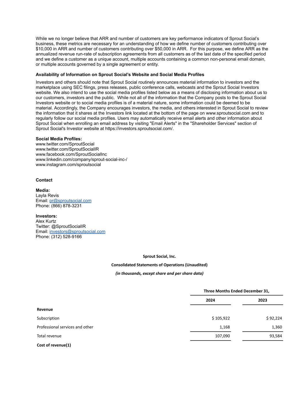 While we no longer believe that ARR and number of customers are key performance indicators of Sprout Social’s business, these metrics are necessary for an understanding of how we define number of customers contributing over $10,000 in ARR and number of customers contributing over $50,000 in ARR. For this purpose, we define ARR as the annualized revenue run-rate of subscription agreements from all customers as of the last date of the specified period and we define a customer as a unique account, multiple accounts containing a common non-personal email domain, or multiple accounts governed by a single agreement or entity. Availability of Information on Sprout Social’s Website and Social Media Profiles Investors and others should note that Sprout Social routinely announces material information to investors and the marketplace using SEC filings, press releases, public conference calls, webcasts and the Sprout Social Investors website. We also intend to use the social media profiles listed below as a means of disclosing information about us to our customers, investors and the public. While not all of the information that the Company posts to the Sprout Social Investors website or to social media profiles is of a material nature, some information could be deemed to be material. Accordingly, the Company encourages investors, the media, and others interested in Sprout Social to review the information that it shares at the Investors link located at the bottom of the page on www.sproutsocial.com and to regularly follow our social media profiles. Users may automatically receive email alerts and other information about Sprout Social when enrolling an email address by visiting "Email Alerts" in the "Shareholder Services" section of Sprout Social's Investor website at https://investors.sproutsocial.com/. Social Media Profiles: www.twitter.com/SproutSocial www.twitter.com/SproutSocialIR www.facebook.com/SproutSocialInc www.linkedin.com/company/sprout-social-inc-/ www.instagram.com/sproutsocial Contact Media: Layla Revis Email: pr@sproutsocial.com Phone: (866) 878-3231 Investors: Alex Kurtz Twitter: @SproutSocialIR Email: investors@sproutsocial.com Phone: (312) 528-9166 Sprout Social, Inc. Consolidated Statements of Operations (Unaudited) (in thousands, except share and per share data) Three Months Ended December 31, 2024 2023 Revenue Subscription $ 105,922 $ 92,224 Professional services and other 1,168 1,360 Total revenue 107,090 93,584 Cost of revenue(1)