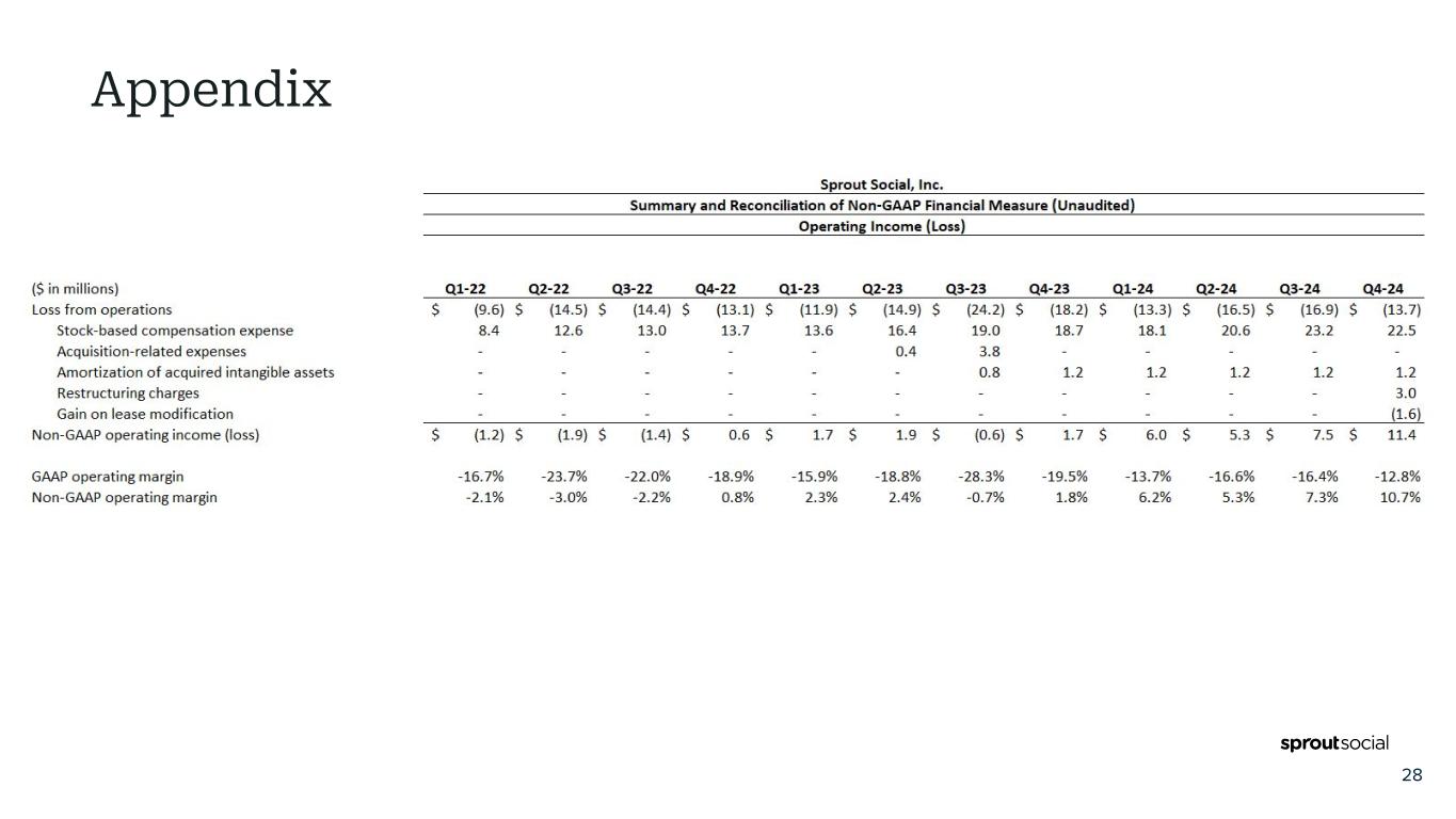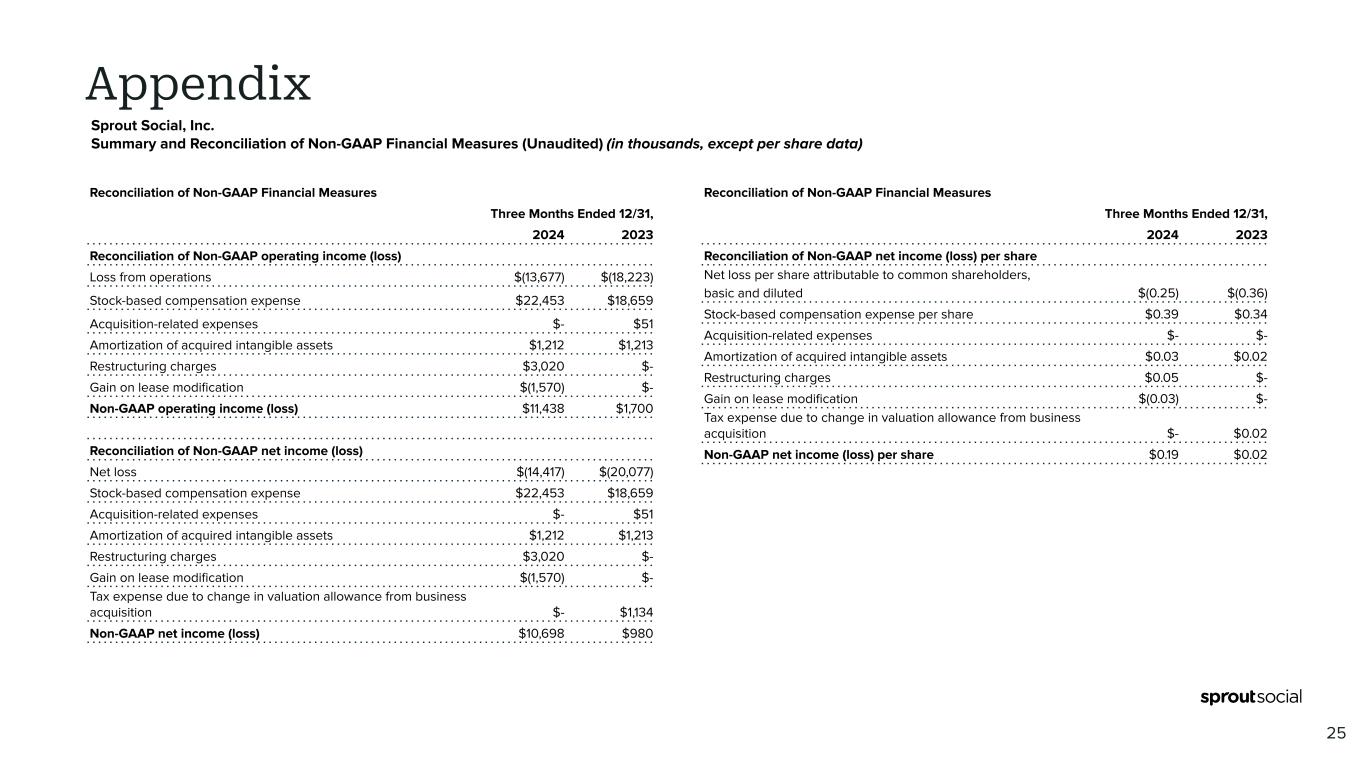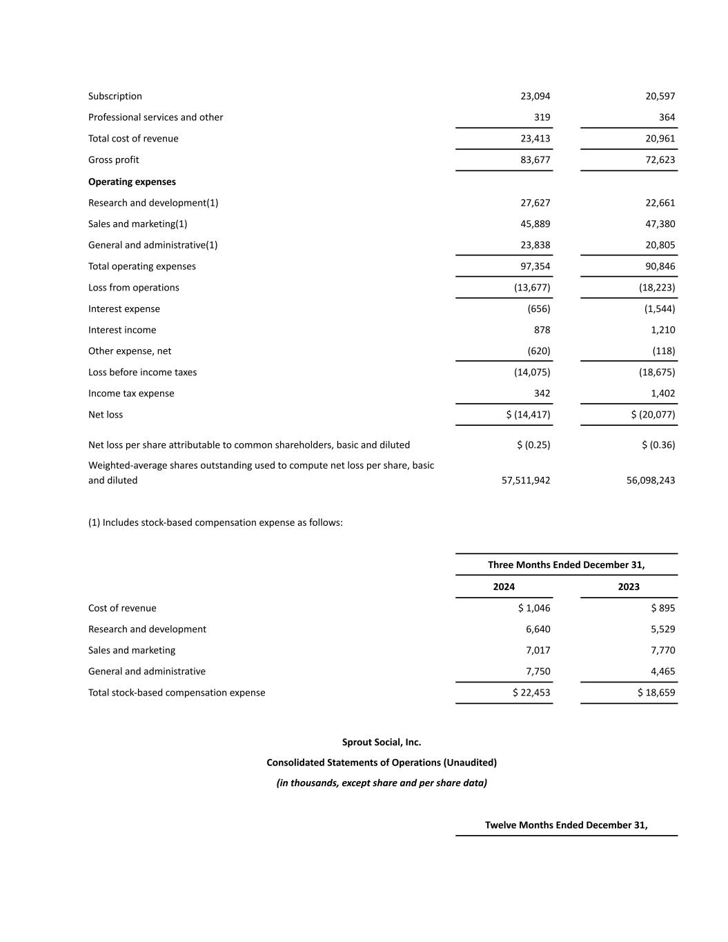 Subscription 23,094 20,597 Professional services and other 319 364 Total cost of revenue 23,413 20,961 Gross profit 83,677 72,623 Operating expenses Research and development(1) 27,627 22,661 Sales and marketing(1) 45,889 47,380 General and administrative(1) 23,838 20,805 Total operating expenses 97,354 90,846 Loss from operations (13,677) (18,223) Interest expense (656) (1,544) Interest income 878 1,210 Other expense, net (620) (118) Loss before income taxes (14,075) (18,675) Income tax expense 342 1,402 Net loss $ (14,417) $ (20,077) Net loss per share attributable to common shareholders, basic and diluted $ (0.25) $ (0.36) Weighted-average shares outstanding used to compute net loss per share, basic and diluted 57,511,942 56,098,243 (1) Includes stock-based compensation expense as follows: Three Months Ended December 31, 2024 2023 Cost of revenue $ 1,046 $ 895 Research and development 6,640 5,529 Sales and marketing 7,017 7,770 General and administrative 7,750 4,465 Total stock-based compensation expense $ 22,453 $ 18,659 Sprout Social, Inc. Consolidated Statements of Operations (Unaudited) (in thousands, except share and per share data) Twelve Months Ended December 31,