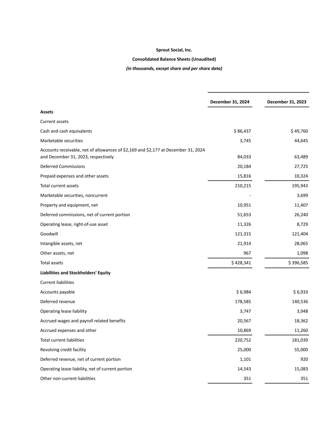 Sprout Social, Inc. Consolidated Balance Sheets (Unaudited) (in thousands, except share and per share data) December 31, 2024 December 31, 2023 Assets Current assets Cash and cash equivalents $ 86,437 $ 49,760 Marketable securities 3,745 44,645 Accounts receivable, net of allowances of $2,169 and $2,177 at December 31, 2024 and December 31, 2023, respectively 84,033 63,489 Deferred Commissions 20,184 27,725 Prepaid expenses and other assets 15,816 10,324 Total current assets 210,215 195,943 Marketable securities, noncurrent - 3,699 Property and equipment, net 10,951 11,407 Deferred commissions, net of current portion 51,653 26,240 Operating lease, right-of-use asset 11,326 8,729 Goodwill 121,315 121,404 Intangible assets, net 21,914 28,065 Other assets, net 967 1,098 Total assets $ 428,341 $ 396,585 Liabilities and Stockholders' Equity Current liabilities Accounts payable $ 6,984 $ 6,933 Deferred revenue 178,585 140,536 Operating lease liability 3,747 3,948 Accrued wages and payroll related benefits 20,567 18,362 Accrued expenses and other 10,869 11,260 Total current liabilities 220,752 181,039 Revolving credit facility 25,000 55,000 Deferred revenue, net of current portion 1,101 920 Operating lease liability, net of current portion 14,543 15,083 Other non-current liabilities 351 351