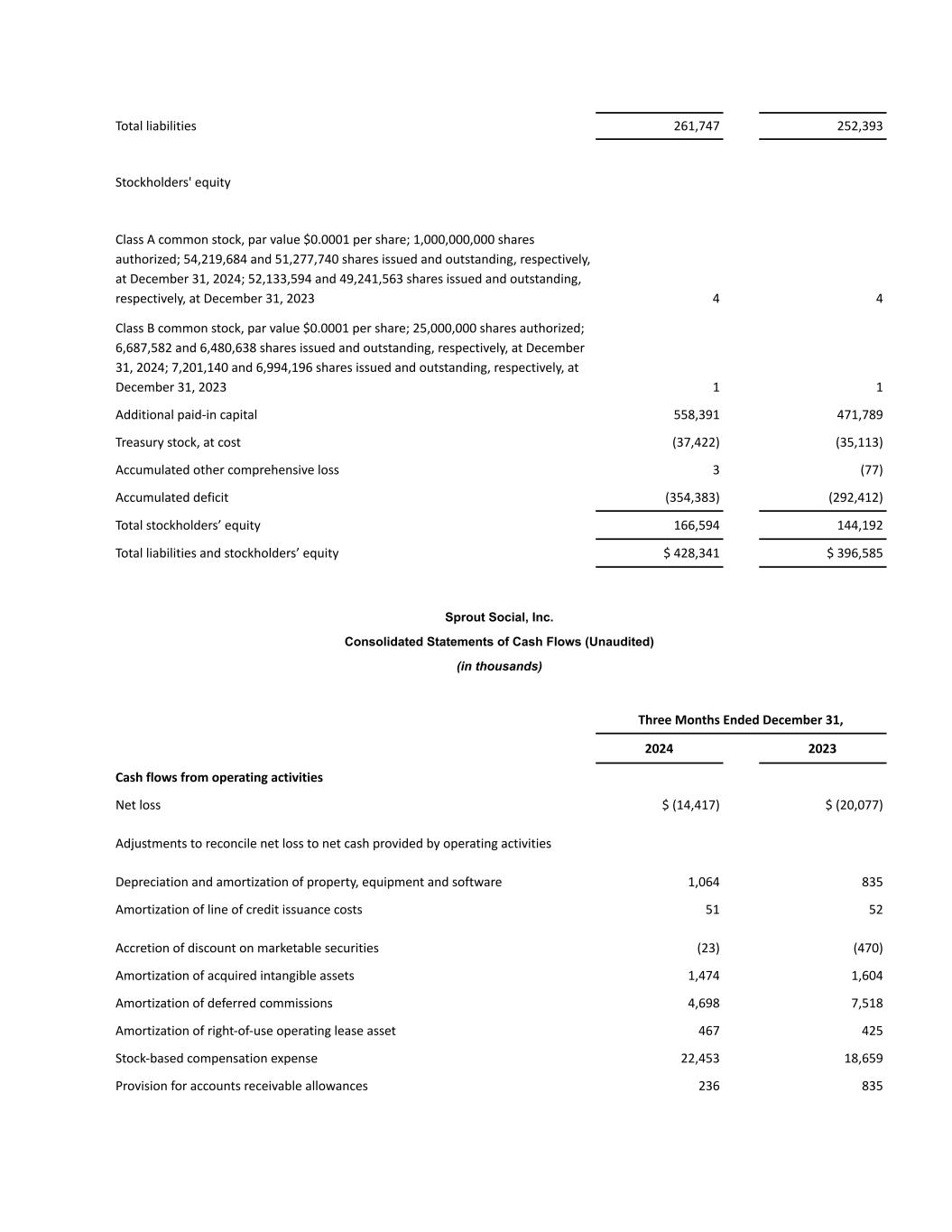 Total liabilities 261,747 252,393 Stockholders' equity Class A common stock, par value $0.0001 per share; 1,000,000,000 shares authorized; 54,219,684 and 51,277,740 shares issued and outstanding, respectively, at December 31, 2024; 52,133,594 and 49,241,563 shares issued and outstanding, respectively, at December 31, 2023 4 4 Class B common stock, par value $0.0001 per share; 25,000,000 shares authorized; 6,687,582 and 6,480,638 shares issued and outstanding, respectively, at December 31, 2024; 7,201,140 and 6,994,196 shares issued and outstanding, respectively, at December 31, 2023 1 1 Additional paid-in capital 558,391 471,789 Treasury stock, at cost (37,422) (35,113) Accumulated other comprehensive loss 3 (77) Accumulated deficit (354,383) (292,412) Total stockholders’ equity 166,594 144,192 Total liabilities and stockholders’ equity $ 428,341 $ 396,585 Sprout Social, Inc. Consolidated Statements of Cash Flows (Unaudited) (in thousands) Three Months Ended December 31, 2024 2023 Cash flows from operating activities Net loss $ (14,417) $ (20,077) Adjustments to reconcile net loss to net cash provided by operating activities Depreciation and amortization of property, equipment and software 1,064 835 Amortization of line of credit issuance costs 51 52 Accretion of discount on marketable securities (23) (470) Amortization of acquired intangible assets 1,474 1,604 Amortization of deferred commissions 4,698 7,518 Amortization of right-of-use operating lease asset 467 425 Stock-based compensation expense 22,453 18,659 Provision for accounts receivable allowances 236 835