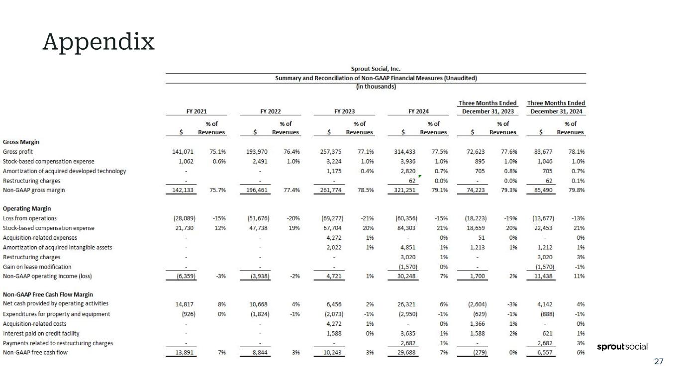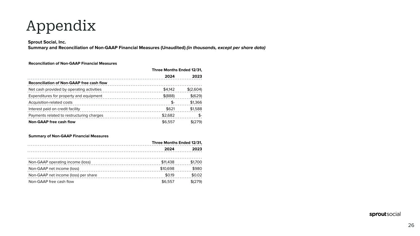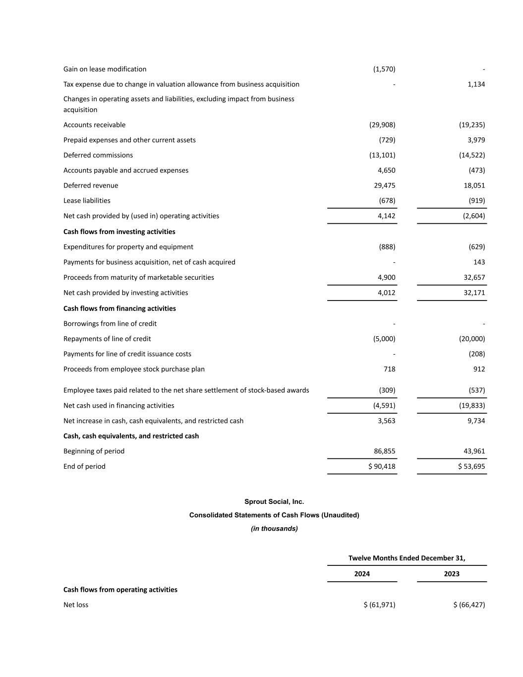 Gain on lease modification (1,570) - Tax expense due to change in valuation allowance from business acquisition - 1,134 Changes in operating assets and liabilities, excluding impact from business acquisition Accounts receivable (29,908) (19,235) Prepaid expenses and other current assets (729) 3,979 Deferred commissions (13,101) (14,522) Accounts payable and accrued expenses 4,650 (473) Deferred revenue 29,475 18,051 Lease liabilities (678) (919) Net cash provided by (used in) operating activities 4,142 (2,604) Cash flows from investing activities Expenditures for property and equipment (888) (629) Payments for business acquisition, net of cash acquired - 143 Proceeds from maturity of marketable securities 4,900 32,657 Net cash provided by investing activities 4,012 32,171 Cash flows from financing activities Borrowings from line of credit - - Repayments of line of credit (5,000) (20,000) Payments for line of credit issuance costs - (208) Proceeds from employee stock purchase plan 718 912 Employee taxes paid related to the net share settlement of stock-based awards (309) (537) Net cash used in financing activities (4,591) (19,833) Net increase in cash, cash equivalents, and restricted cash 3,563 9,734 Cash, cash equivalents, and restricted cash Beginning of period 86,855 43,961 End of period $ 90,418 $ 53,695 Sprout Social, Inc. Consolidated Statements of Cash Flows (Unaudited) (in thousands) Twelve Months Ended December 31, 2024 2023 Cash flows from operating activities Net loss $ (61,971) $ (66,427)