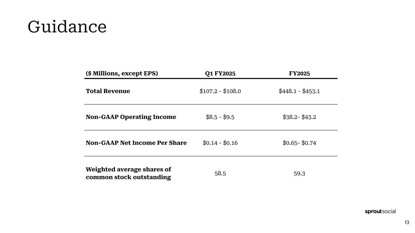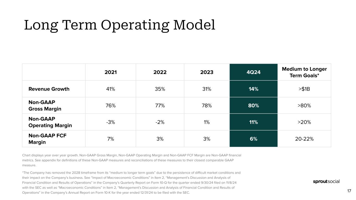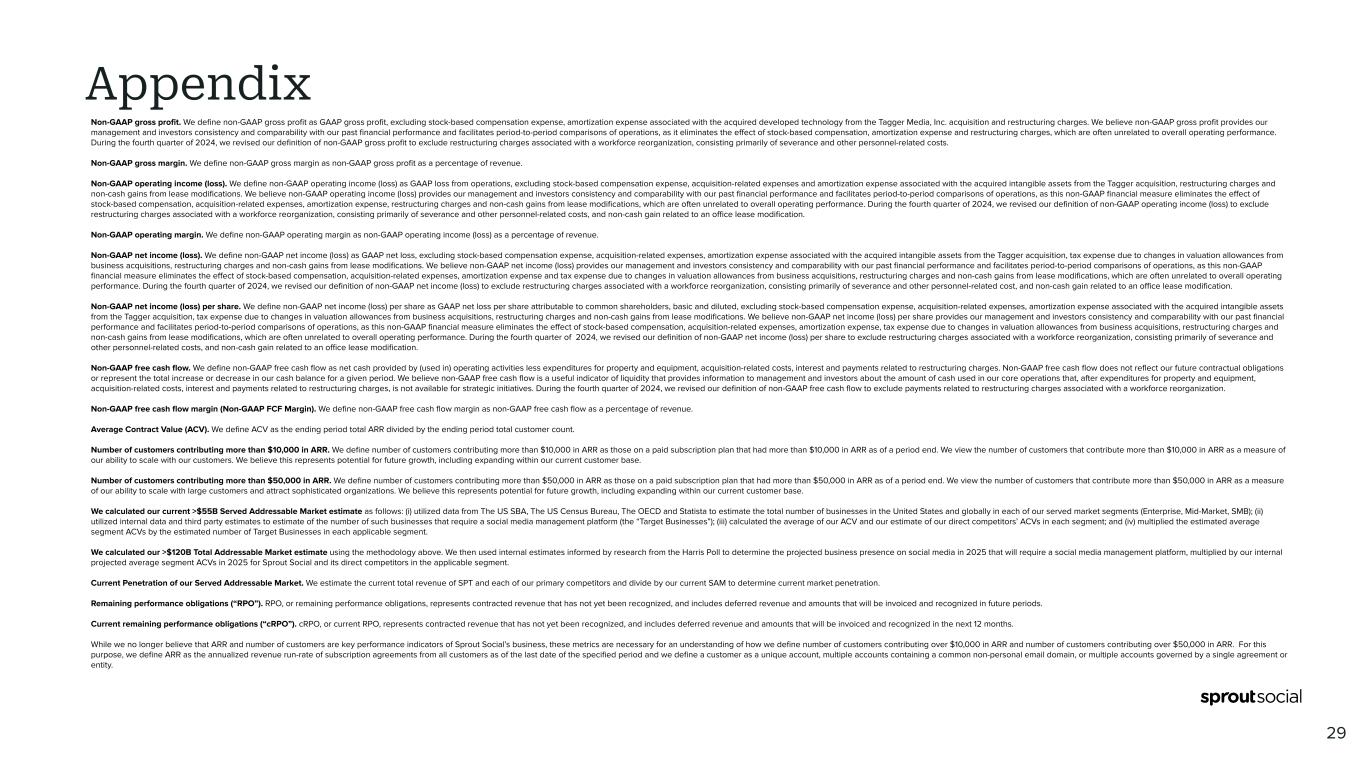 Following completion of the events, a webcast replay will also be available at http://investors.sproutsocial.com for 12 months. About Sprout Social Sprout Social is a global leader in social media management and analytics software. Sprout’s unified platform puts powerful social data into the hands of approximately 30,000 brands so they can make strategic decisions that drive business growth and innovation. With a full suite of social media management solutions, Sprout offers comprehensive publishing and engagement functionality, customer care, connected workflows and AI-powered business intelligence. Sprout’s award-winning software operates across all major social media networks and digital platforms. For more information about Sprout Social (NASDAQ: SPT), visit sproutsocial.com. Forward-Looking Statements This press release contains “forward-looking statements” within the meaning of Section 27A of the Securities Act of 1933, as amended, and Section 21E of the Securities Exchange Act of 1934, as amended. In some cases, you can identify forward-looking statements by terms such as “anticipate,” “believe,” “can,” “continue,” “could,” “estimate,” “expect,” “explore,””future,” “intend,” “long-term model,” “may,” “medium to longer term goals,” “might” “outlook,” “plan,” “potential,” “predict,” “project,” “should,” “strategy,” “target,” “will,” “would,” or the negative of these terms, and similar expressions intended to identify forward-looking statements. However, not all forward-looking statements contain these identifying words. These statements may relate to our market size and growth strategy, our estimated and projected costs, margins, revenue, expenditures and customer and financial growth rates, our Q1 2025 and full year 2025 financial outlook, our plans and objectives for future operations, growth, initiatives or strategies. By their nature, these statements are subject to numerous uncertainties and risks, including factors beyond our control, that could cause actual results, performance or achievement to differ materially and adversely from those anticipated or implied in the forward-looking statements. These assumptions, uncertainties and risks include that, among others: we may not be able to sustain our revenue and customer growth rate in the future, including due to risks associated with our strategic focus on enterprise customers; price increases have and may continue to negatively impact demand for our products, customer acquisition and retention and reduce the total number of customers or customer additions; our business would be harmed by any significant interruptions, delays or outages in services from our platform, our API providers, or certain social media platforms; if we are unable to attract potential customers through unpaid channels, convert this traffic to free trials or convert free trials to paid subscriptions, our business and results of operations may be adversely affected; we may be unable to successfully enter new markets, manage our international expansion and comply with any applicable international laws and regulations; we may be unable to integrate acquired businesses or technologies successfully or achieve the expected benefits of such acquisitions and investments; unstable market and economic conditions, such as recession risks, effects of inflation, labor shortages, supply chain issues, high interest rates, and the impacts of current and potential future bank failures and impacts of ongoing overseas conflicts, have and could continue to adversely impact our business and that of our existing and prospective customers, which may result in reduced demand for our products; we may not be able to generate sufficient cash to service our indebtedness; covenants in our credit agreement may restrict our operations, and if we do not effectively manage our business to comply with these covenants, our financial condition could be adversely impacted; any cybersecurity-related attack, significant data breach or disruption of the information technology systems or networks on which we rely could negatively affect our business; changing regulations relating to privacy, information security and data protection could increase our costs, affect or limit how we collect and use personal information and harm our brand; and risks related to ongoing legal proceedings. Additional risks and uncertainties that could cause actual outcomes and results to differ materially from those contemplated by the forward-looking statements are included under the caption “Risk Factors” and elsewhere in our filings with the Securities and Exchange Commission (the “SEC”), including our Annual Report on Form 10-K for the year ended December 31, 2023 filed with the SEC on February 23, 2024 and our Annual Report on Form 10-K for the year ended December 31, 2024, to be filed with the SEC as well as any future reports that we file with the SEC. Moreover, you should interpret many of the risks identified in those reports as being heightened as a result of the current instability in market and economic conditions. Forward-looking statements speak only as of the date the statements are made and are based on information available to Sprout Social at the time those statements are made and/or management's good faith belief as of that time with respect to future events. Sprout Social assumes no obligation to update forward-looking statements to reflect events or circumstances after the date they were made, except as required by law. Use of Non-GAAP Financial Measures We have provided in this press release certain financial information that has not been prepared in accordance with generally accepted accounting principles in the United States (“GAAP”). Our management uses these non-GAAP financial measures internally in analyzing our financial results and believes that use of these non-GAAP financial