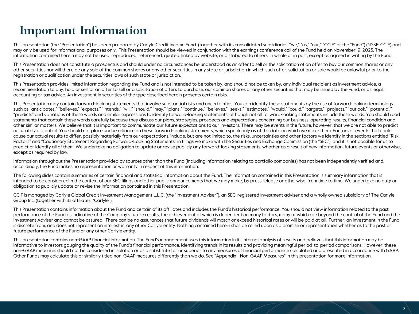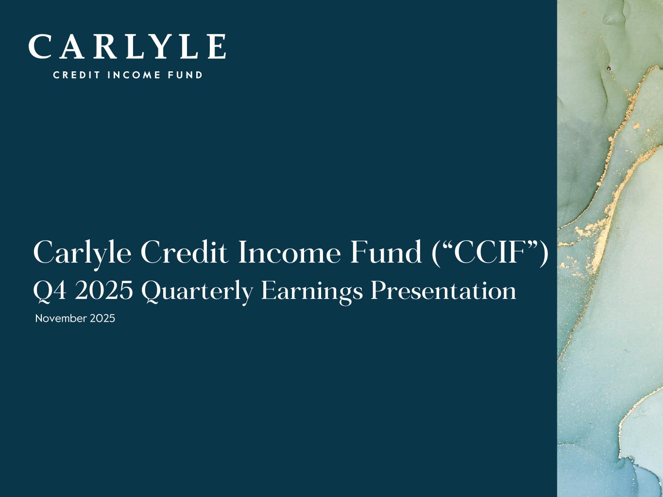 R-171, G-132, B-51 R-108, G-132, B-156 R-97, G-161, B-224 R-10, G-54, B-74 R-29, G-101, B-113 R-182, G-231, B-250 R-215, G-185, B-122 R-196, G-206, B-215 R-171, G-202, B-243 R-13, G-107, B-147 R-33, G-152, B-172 R-208, G-232, B-248 R-0, G-0, B-0 R-95, G-95, B-95 R-188, G-188, B-188 R-235, G-235, B-235 R-242, G-232, B-211 R-196, G-234, B-240 1 Carlyle Credit Income Fund (“CCIF”) Q4 2025 Quarterly Earnings Presentation November 2025