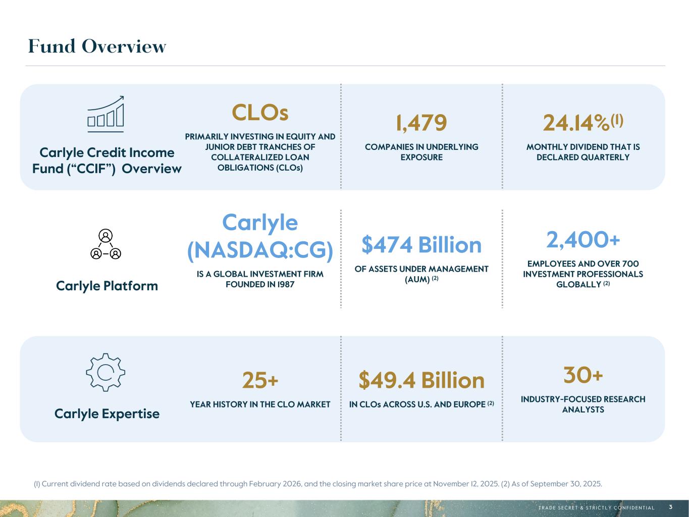 R-171, G-132, B-51 R-108, G-132, B-156 R-97, G-161, B-224 R-10, G-54, B-74 R-29, G-101, B-113 R-182, G-231, B-250 R-215, G-185, B-122 R-196, G-206, B-215 R-171, G-202, B-243 R-13, G-107, B-147 R-33, G-152, B-172 R-208, G-232, B-248 R-0, G-0, B-0 R-95, G-95, B-95 R-188, G-188, B-188 R-235, G-235, B-235 R-242, G-232, B-211 R-196, G-234, B-240 T R A D E S E C R E T & S T R I C T L Y C O N F I D E N T I A L 2 This presentation (the “Presentation”) has been prepared by Carlyle Credit Income Fund. (together with its consolidated subsidiaries, “we,” “us,” “our,” “CCIF” or the “Fund”) (NYSE: CCIF) and may only be used for informational purposes only. This Presentation should be viewed in conjunction with the earnings conference call of the Fund held on November 19, 2025. The information contained herein may not be used, reproduced, referenced, quoted, linked by website, or distributed to others, in whole or in part, except as agreed in writing by the Fund. This Presentation does not constitute a prospectus and should under no circumstances be understood as an offer to sell or the solicitation of an offer to buy our common shares or any other securities nor will there be any sale of the common shares or any other securities in any state or jurisdiction in which such offer, solicitation or sale would be unlawful prior to the registration or qualification under the securities laws of such state or jurisdiction. This Presentation provides limited information regarding the Fund and is not intended to be taken by, and should not be taken by, any individual recipient as investment advice, a recommendation to buy, hold or sell, or an offer to sell or a solicitation of offers to purchase, our common shares or any other securities that may be issued by the Fund, or as legal, accounting or tax advice. An investment in securities of the type described herein presents certain risks. This Presentation may contain forward-looking statements that involve substantial risks and uncertainties. You can identify these statements by the use of forward-looking terminology such as “anticipates,” “believes,” “expects,” “intends,” “will,” “should,” “may,” “plans,” “continue,” “believes,” “seeks,” “estimates,” “would,” “could,” “targets,” “projects,” “outlook,” “potential,” “predicts” and variations of these words and similar expressions to identify forward-looking statements, although not all forward-looking statements include these words. You should read statements that contain these words carefully because they discuss our plans, strategies, prospects and expectations concerning our business, operating results, financial condition and other similar matters. We believe that it is important to communicate our future expectations to our investors. There may be events in the future, however, that we are not able to predict accurately or control. You should not place undue reliance on these forward-looking statements, which speak only as of the date on which we make them. Factors or events that could cause our actual results to differ, possibly materially from our expectations, include, but are not limited to, the risks, uncertainties and other factors we identify in the sections entitled “Risk Factors” and “Cautionary Statement Regarding Forward-Looking Statements” in filings we make with the Securities and Exchange Commission (the “SEC”), and it is not possible for us to predict or identify all of them. We undertake no obligation to update or revise publicly any forward-looking statements, whether as a result of new information, future events or otherwise, except as required by law. Information throughout the Presentation provided by sources other than the Fund (including information relating to portfolio companies) has not been independently verified and, accordingly, the Fund makes no representation or warranty in respect of this information. The following slides contain summaries of certain financial and statistical information about the Fund. The information contained in this Presentation is summary information that is intended to be considered in the context of our SEC filings and other public announcements that we may make, by press release or otherwise, from time to time. We undertake no duty or obligation to publicly update or revise the information contained in this Presentation. CCIF is managed by Carlyle Global Credit Investment Management L.L.C. (the “Investment Adviser”), an SEC-registered investment adviser and a wholly owned subsidiary of The Carlyle Group Inc. (together with its affiliates, “Carlyle”). This Presentation contains information about the Fund and certain of its affiliates and includes the Fund’s historical performance. You should not view information related to the past performance of the Fund as indicative of the Company’s future results, the achievement of which is dependent on many factors, many of which are beyond the control of the Fund and the Investment Adviser and cannot be assured. There can be no assurances that future dividends will match or exceed historical rates or will be paid at all. Further, an investment in the Fund is discrete from, and does not represent an interest in, any other Carlyle entity. Nothing contained herein shall be relied upon as a promise or representation whether as to the past or future performance of the Fund or any other Carlyle entity. This presentation contains non-GAAP financial information. The Fund's management uses this information in its internal analysis of results and believes that this information may be informative to investors gauging the quality of the Fund's financial performance, identifying trends in its results and providing meaningful period-to-period comparisons. However, these non-GAAP measures should not be considered in isolation or as a substitute for or superior to any measures of financial performance calcula