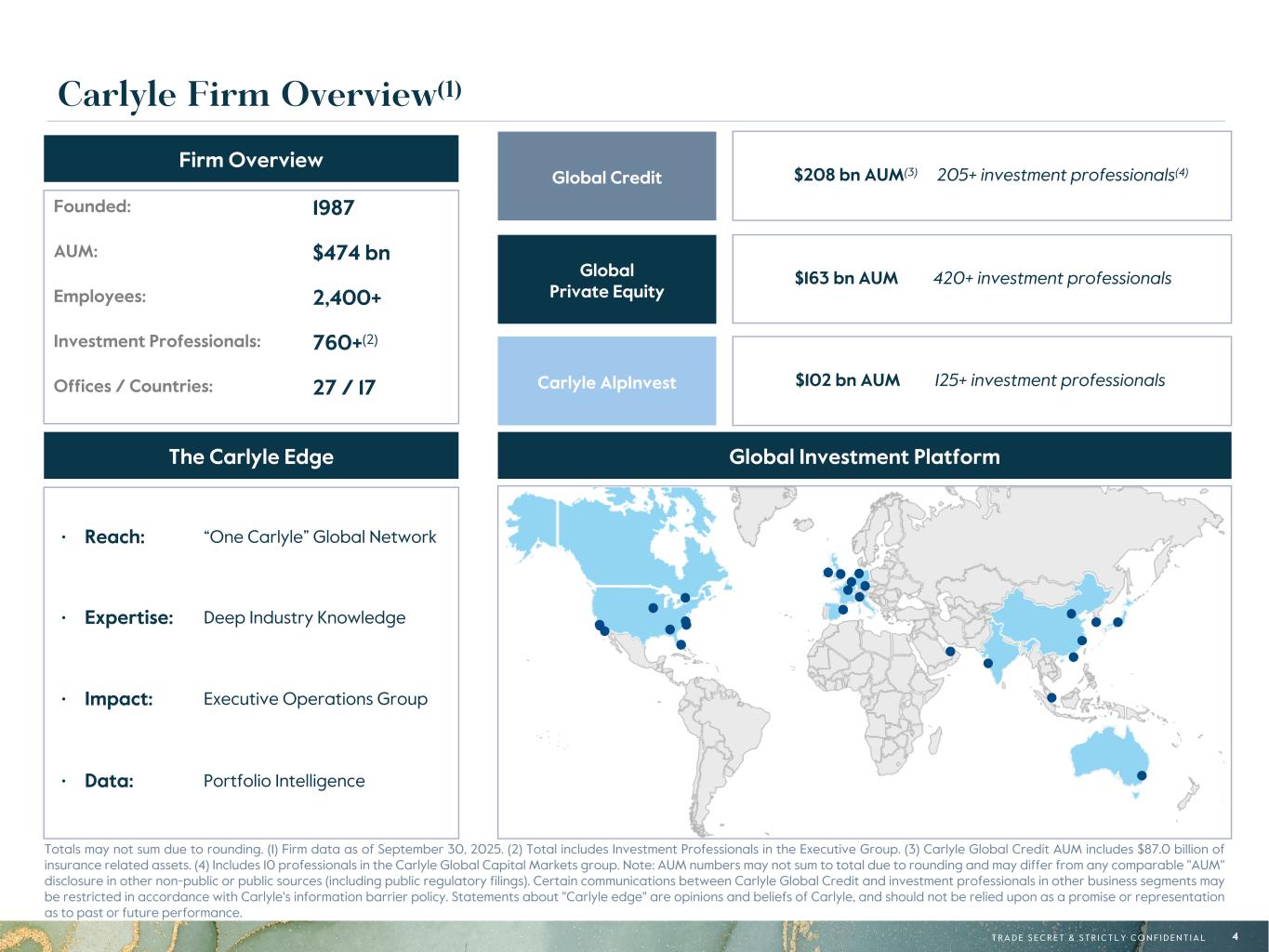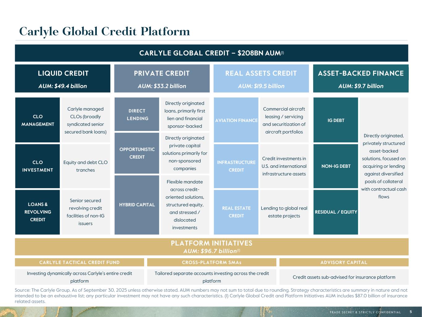 R-171, G-132, B-51 R-108, G-132, B-156 R-97, G-161, B-224 R-10, G-54, B-74 R-29, G-101, B-113 R-182, G-231, B-250 R-215, G-185, B-122 R-196, G-206, B-215 R-171, G-202, B-243 R-13, G-107, B-147 R-33, G-152, B-172 R-208, G-232, B-248 R-0, G-0, B-0 R-95, G-95, B-95 R-188, G-188, B-188 R-235, G-235, B-235 R-242, G-232, B-211 R-196, G-234, B-240 T R A D E S E C R E T & S T R I C T L Y C O N F I D E N T I A L 4 Totals may not sum due to rounding. (1) Firm data as of September 30, 2025. (2) Total includes Investment Professionals in the Executive Group. (3) Carlyle Global Credit AUM includes $87.0 billion of insurance related assets. (4) Includes 10 professionals in the Carlyle Global Capital Markets group. Note: AUM numbers may not sum to total due to rounding and may differ from any comparable "AUM" disclosure in other non-public or public sources (including public regulatory filings). Certain communications between Carlyle Global Credit and investment professionals in other business segments may be restricted in accordance with Carlyle's information barrier policy. Statements about "Carlyle edge" are opinions and beliefs of Carlyle, and should not be relied upon as a promise or representation as to past or future performance. Firm Overview The Carlyle Edge • Reach: “One Carlyle” Global Network • Expertise: Deep Industry Knowledge • Impact: Executive Operations Group • Data: Portfolio Intelligence Global Private Equity Global Credit Carlyle AlpInvest Global Investment Platform Founded: 1987 AUM: $474 bn Employees: 2,400+ Investment Professionals: 760+(2) Offices / Countries: 27 / 17 $163 bn AUM 420+ investment professionals $208 bn AUM(3) 205+ investment professionals(4) $102 bn AUM 125+ investment professionals Carlyle Firm Overview(1)