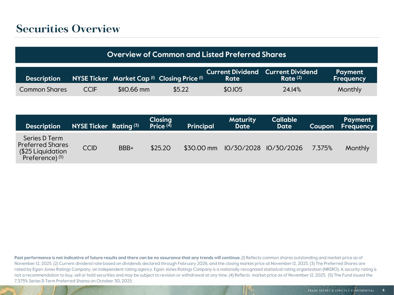 R-171, G-132, B-51 R-108, G-132, B-156 R-97, G-161, B-224 R-10, G-54, B-74 R-29, G-101, B-113 R-182, G-231, B-250 R-215, G-185, B-122 R-196, G-206, B-215 R-171, G-202, B-243 R-13, G-107, B-147 R-33, G-152, B-172 R-208, G-232, B-248 R-0, G-0, B-0 R-95, G-95, B-95 R-188, G-188, B-188 R-235, G-235, B-235 R-242, G-232, B-211 R-196, G-234, B-240 T R A D E S E C R E T & S T R I C T L Y C O N F I D E N T I A L 6 Securities Overview Description NYSE Ticker Market Cap (1) Closing Price (1) Current Dividend Rate Current Dividend Rate (2) Payment Frequency Common Shares CCIF $110.66 mm $5.22 $0.105 24.14% Monthly Overview of Common and Listed Preferred Shares Description NYSE Ticker Rating (3) Closing Price (4) Principal Maturity Date Callable Date Coupon Payment Frequency Series D Term Preferred Shares ($25 Liquidation Preference) (5) CCID BBB+ $25.20 $30.00 mm 10/30/2028 10/30/2026 7.375% Monthly Past performance is not indicative of future results and there can be no assurance that any trends will continue. (1) Reflects common shares outstanding and market price as of November 12, 2025. (2) Current dividend rate based on dividends declared through February 2026, and the closing market price at November 12, 2025. (3) The Preferred Shares are rated by Egan-Jones Ratings Company, an independent rating agency. Egan-Jones Ratings Company is a nationally recognized statistical rating organization (NRSRO). A security rating is not a recommendation to buy, sell or hold securities and may be subject to revision or withdrawal at any time. (4) Reflects market price as of November 12, 2025. (5) The Fund issued the 7.375% Series D Term Preferred Shares on October 30, 2025.