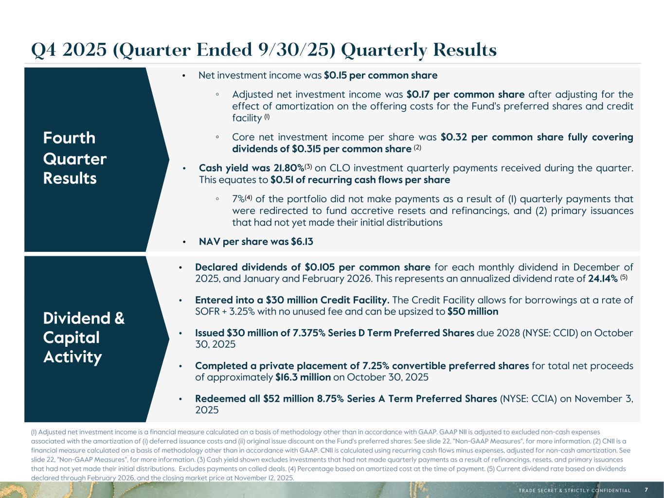 R-171, G-132, B-51 R-108, G-132, B-156 R-97, G-161, B-224 R-10, G-54, B-74 R-29, G-101, B-113 R-182, G-231, B-250 R-215, G-185, B-122 R-196, G-206, B-215 R-171, G-202, B-243 R-13, G-107, B-147 R-33, G-152, B-172 R-208, G-232, B-248 R-0, G-0, B-0 R-95, G-95, B-95 R-188, G-188, B-188 R-235, G-235, B-235 R-242, G-232, B-211 R-196, G-234, B-240 T R A D E S E C R E T & S T R I C T L Y C O N F I D E N T I A L 7 • Net investment income was $0.15 per common share ◦ Adjusted net investment income was $0.17 per common share after adjusting for the effect of amortization on the offering costs for the Fund's preferred shares and credit facility (1) ◦ Core net investment income per share was $0.32 per common share fully covering dividends of $0.315 per common share (2) • Cash yield was 21.80%(3) on CLO investment quarterly payments received during the quarter. This equates to $0.51 of recurring cash flows per share ◦ 7%(4) of the portfolio did not make payments as a result of (1) quarterly payments that were redirected to fund accretive resets and refinancings, and (2) primary issuances that had not yet made their initial distributions • NAV per share was $6.13 • Declared dividends of $0.105 per common share for each monthly dividend in December of 2025, and January and February 2026. This represents an annualized dividend rate of 24.14% (5) • Entered into a $30 million Credit Facility. The Credit Facility allows for borrowings at a rate of SOFR + 3.25% with no unused fee and can be upsized to $50 million • Issued $30 million of 7.375% Series D Term Preferred Shares due 2028 (NYSE: CCID) on October 30, 2025 • Completed a private placement of 7.25% convertible preferred shares for total net proceeds of approximately $16.3 million on October 30, 2025 • Redeemed all $52 million 8.75% Series A Term Preferred Shares (NYSE: CCIA) on November 3, 2025 Dividend & Capital Activity (1) Adjusted net investment income is a financial measure calculated on a basis of methodology other than in accordance with GAAP. GAAP NII is adjusted to excluded non-cash expenses associated with the amortization of (i) deferred issuance costs and (ii) original issue discount on the Fund's preferred shares. See slide 22, "Non-GAAP Measures", for more information. (2) CNII is a financial measure calculated on a basis of methodology other than in accordance with GAAP. CNII is calculated using recurring cash flows minus expenses, adjusted for non-cash amortization. See slide 22, "Non-GAAP Measures", for more information. (3) Cash yield shown excludes investments that had not made quarterly payments as a result of refinancings, resets, and primary issuances that had not yet made their initial distributions. Excludes payments on called deals. (4) Percentage based on amortized cost at the time of payment. (5) Current dividend rate based on dividends declared through February 2026, and the closing market price at November 12, 2025. Fourth Quarter Results Q4 2025 (Quarter Ended 9/30/25) Quarterly Results
