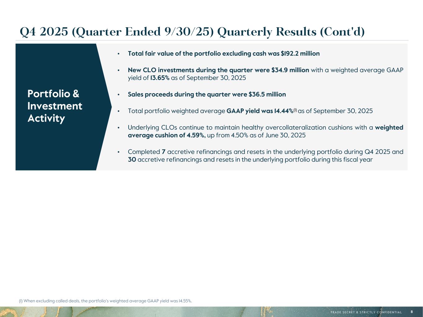 R-171, G-132, B-51 R-108, G-132, B-156 R-97, G-161, B-224 R-10, G-54, B-74 R-29, G-101, B-113 R-182, G-231, B-250 R-215, G-185, B-122 R-196, G-206, B-215 R-171, G-202, B-243 R-13, G-107, B-147 R-33, G-152, B-172 R-208, G-232, B-248 R-0, G-0, B-0 R-95, G-95, B-95 R-188, G-188, B-188 R-235, G-235, B-235 R-242, G-232, B-211 R-196, G-234, B-240 T R A D E S E C R E T & S T R I C T L Y C O N F I D E N T I A L 8 Q4 2025 (Quarter Ended 9/30/25) Quarterly Results (Cont'd) • Total fair value of the portfolio excluding cash was $192.2 million • New CLO investments during the quarter were $34.9 million with a weighted average GAAP yield of 13.65% as of September 30, 2025 • Sales proceeds during the quarter were $36.5 million • Total portfolio weighted average GAAP yield was 14.44%(1) as of September 30, 2025 • Underlying CLOs continue to maintain healthy overcollateralization cushions with a weighted average cushion of 4.59%, up from 4.50% as of June 30, 2025 • Completed 7 accretive refinancings and resets in the underlying portfolio during Q4 2025 and 30 accretive refinancings and resets in the underlying portfolio during this fiscal year Portfolio & Investment Activity (1) When excluding called deals, the portfolio's weighted average GAAP yield was 14.55%.