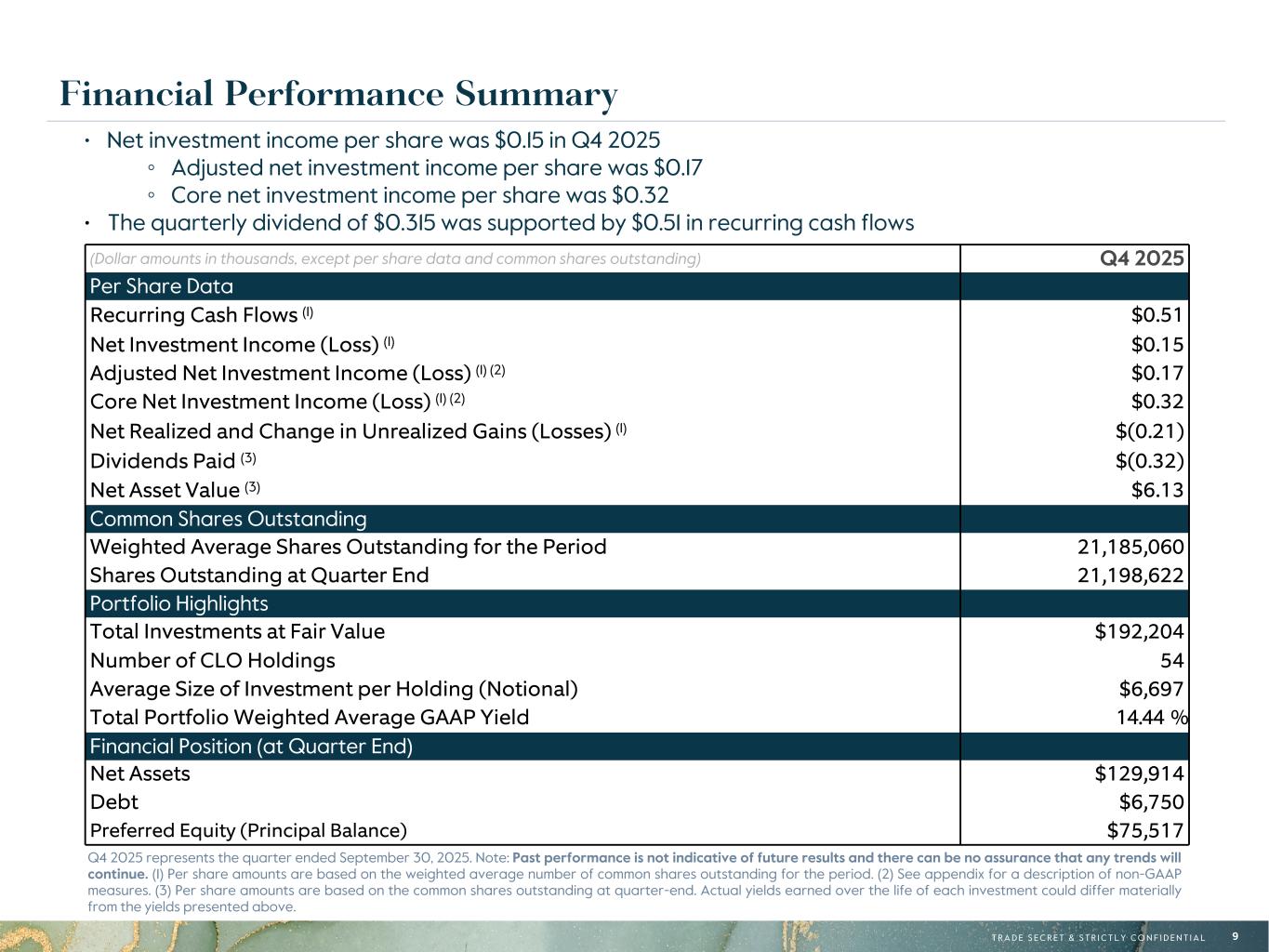 R-171, G-132, B-51 R-108, G-132, B-156 R-97, G-161, B-224 R-10, G-54, B-74 R-29, G-101, B-113 R-182, G-231, B-250 R-215, G-185, B-122 R-196, G-206, B-215 R-171, G-202, B-243 R-13, G-107, B-147 R-33, G-152, B-172 R-208, G-232, B-248 R-0, G-0, B-0 R-95, G-95, B-95 R-188, G-188, B-188 R-235, G-235, B-235 R-242, G-232, B-211 R-196, G-234, B-240 T R A D E S E C R E T & S T R I C T L Y C O N F I D E N T I A L 9 • Net investment income per share was $0.15 in Q4 2025 ◦ Adjusted net investment income per share was $0.17 ◦ Core net investment income per share was $0.32 • The quarterly dividend of $0.315 was supported by $0.51 in recurring cash flows Q4 2025 represents the quarter ended September 30, 2025. Note: Past performance is not indicative of future results and there can be no assurance that any trends will continue. (1) Per share amounts are based on the weighted average number of common shares outstanding for the period. (2) See appendix for a description of non-GAAP measures. (3) Per share amounts are based on the common shares outstanding at quarter-end. Actual yields earned over the life of each investment could differ materially from the yields presented above. Financial Performance Summary (Dollar amounts in thousands, except per share data and common shares outstanding) Q4 2025 Per Share Data Recurring Cash Flows (1) $0.51 Net Investment Income (Loss) (1) $0.15 Adjusted Net Investment Income (Loss) (1) (2) $0.17 Core Net Investment Income (Loss) (1) (2) $0.32 Net Realized and Change in Unrealized Gains (Losses) (1) $(0.21) Dividends Paid (3) $(0.32) Net Asset Value (3) $6.13 Common Shares Outstanding Weighted Average Shares Outstanding for the Period 21,185,060 Shares Outstanding at Quarter End 21,198,622 Portfolio Highlights Total Investments at Fair Value $192,204 Number of CLO Holdings 54 Average Size of Investment per Holding (Notional) $6,697 Total Portfolio Weighted Average GAAP Yield 14.44 % Financial Position (at Quarter End) Net Assets $129,914 Debt $6,750 Preferred Equity (Principal Balance) $75,517