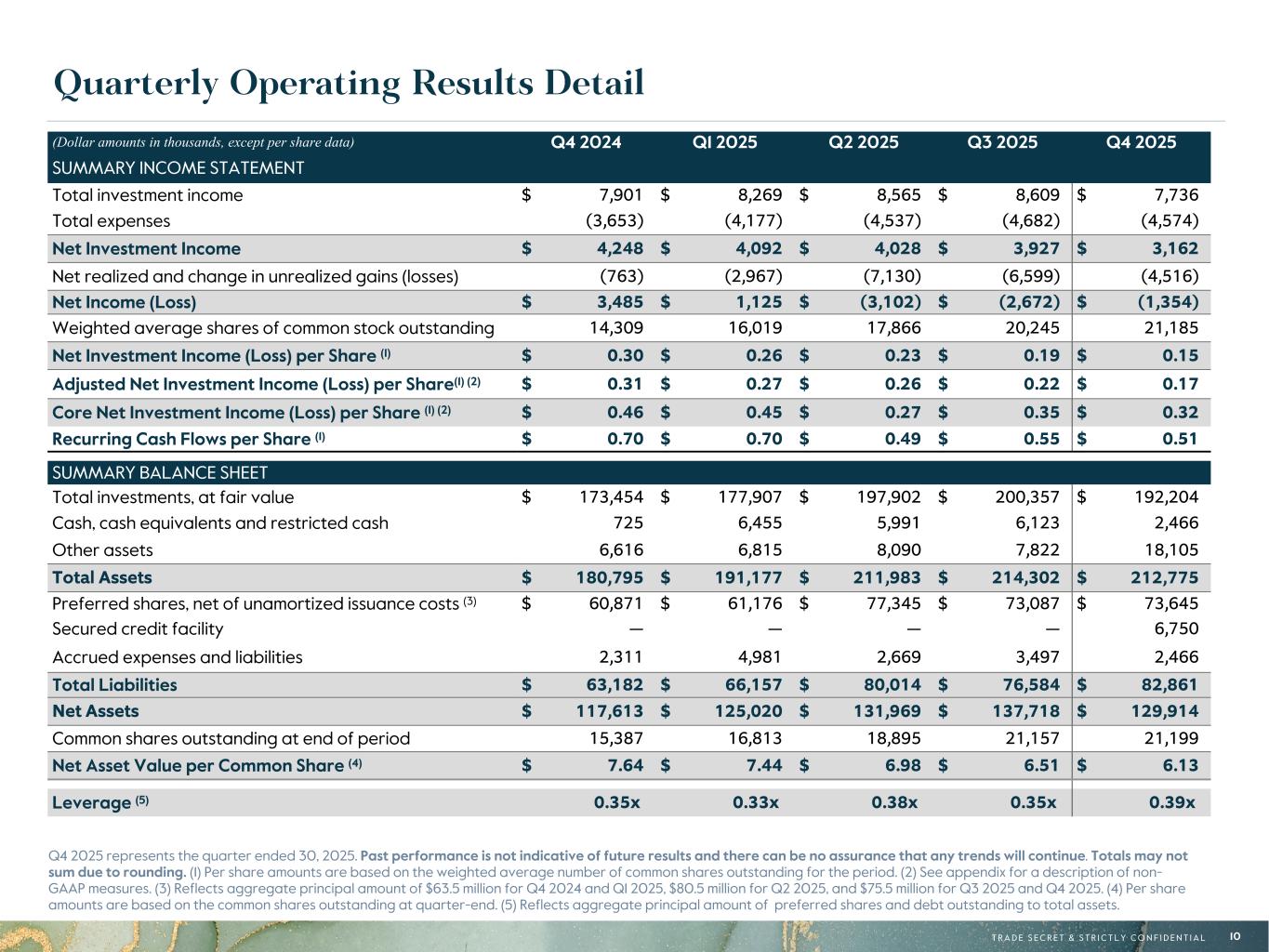 R-171, G-132, B-51 R-108, G-132, B-156 R-97, G-161, B-224 R-10, G-54, B-74 R-29, G-101, B-113 R-182, G-231, B-250 R-215, G-185, B-122 R-196, G-206, B-215 R-171, G-202, B-243 R-13, G-107, B-147 R-33, G-152, B-172 R-208, G-232, B-248 R-0, G-0, B-0 R-95, G-95, B-95 R-188, G-188, B-188 R-235, G-235, B-235 R-242, G-232, B-211 R-196, G-234, B-240 T R A D E S E C R E T & S T R I C T L Y C O N F I D E N T I A L 10 Quarterly Operating Results Detail Q4 2025 represents the quarter ended 30, 2025. Past performance is not indicative of future results and there can be no assurance that any trends will continue. Totals may not sum due to rounding. (1) Per share amounts are based on the weighted average number of common shares outstanding for the period. (2) See appendix for a description of non- GAAP measures. (3) Reflects aggregate principal amount of $63.5 million for Q4 2024 and Q1 2025, $80.5 million for Q2 2025, and $75.5 million for Q3 2025 and Q4 2025. (4) Per share amounts are based on the common shares outstanding at quarter-end. (5) Reflects aggregate principal amount of preferred shares and debt outstanding to total assets. (Dollar amounts in thousands, except per share data) Q4 2024 Q1 2025 Q2 2025 Q3 2025 Q4 2025 SUMMARY INCOME STATEMENT Total investment income $ 7,901 $ 8,269 $ 8,565 $ 8,609 $ 7,736 Total expenses (3,653) (4,177) (4,537) (4,682) (4,574) Net Investment Income $ 4,248 $ 4,092 $ 4,028 $ 3,927 $ 3,162 Net realized and change in unrealized gains (losses) (763) (2,967) (7,130) (6,599) (4,516) Net Income (Loss) $ 3,485 $ 1,125 $ (3,102) $ (2,672) $ (1,354) Weighted average shares of common stock outstanding 14,309 16,019 17,866 20,245 21,185 Net Investment Income (Loss) per Share (1) $ 0.30 $ 0.26 $ 0.23 $ 0.19 $ 0.15 Adjusted Net Investment Income (Loss) per Share(1) (2) $ 0.31 $ 0.27 $ 0.26 $ 0.22 $ 0.17 Core Net Investment Income (Loss) per Share (1) (2) $ 0.46 $ 0.45 $ 0.27 $ 0.35 $ 0.32 Recurring Cash Flows per Share (1) $ 0.70 $ 0.70 $ 0.49 $ 0.55 $ 0.51 SUMMARY BALANCE SHEET Total investments, at fair value $ 173,454 $ 177,907 $ 197,902 $ 200,357 $ 192,204 Cash, cash equivalents and restricted cash 725 6,455 5,991 6,123 2,466 Other assets 6,616 6,815 8,090 7,822 18,105 Total Assets $ 180,795 $ 191,177 $ 211,983 $ 214,302 $ 212,775 Preferred shares, net of unamortized issuance costs (3) $ 60,871 $ 61,176 $ 77,345 $ 73,087 $ 73,645 Secured credit facility — — — — 6,750 Accrued expenses and liabilities 2,311 4,981 2,669 3,497 2,466 Total Liabilities $ 63,182 $ 66,157 $ 80,014 $ 76,584 $ 82,861 Net Assets $ 117,613 $ 125,020 $ 131,969 $ 137,718 $ 129,914 Common shares outstanding at end of period 15,387 16,813 18,895 21,157 21,199 Net Asset Value per Common Share (4) $ 7.64 $ 7.44 $ 6.98 $ 6.51 $ 6.13 Leverage (5) 0.35x 0.33x 0.38x 0.35x 0.39x