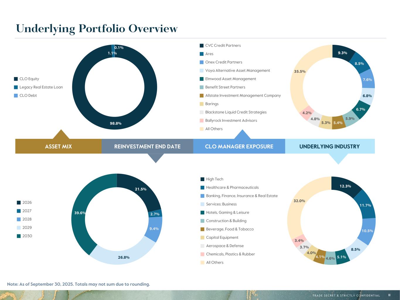 R-171, G-132, B-51 R-108, G-132, B-156 R-97, G-161, B-224 R-10, G-54, B-74 R-29, G-101, B-113 R-182, G-231, B-250 R-215, G-185, B-122 R-196, G-206, B-215 R-171, G-202, B-243 R-13, G-107, B-147 R-33, G-152, B-172 R-208, G-232, B-248 R-0, G-0, B-0 R-95, G-95, B-95 R-188, G-188, B-188 R-235, G-235, B-235 R-242, G-232, B-211 R-196, G-234, B-240 T R A D E S E C R E T & S T R I C T L Y C O N F I D E N T I A L 11 12.3% 11.7% 10.5% 8.5% 5.1%4.6%4.1% 4.0% 3.7% 3.4% 32.0% High Tech Healthcare & Pharmaceuticals Banking, Finance, Insurance & Real Estate Services: Business Hotels, Gaming & Leisure Construction & Building Beverage, Food & Tobacco Capital Equipment Aerospace & Defense Chemicals, Plastics & Rubber All Others UNDERLYING INDUSTRYCLO MANAGER EXPOSUREREINVESTMENT END DATEASSET MIX 21.5% 2.7% 9.4% 26.8% 39.6% 2026 2027 2028 2029 2030 Underlying Portfolio Overview Note: As of September 30, 2025. Totals may not sum due to rounding. 9.3% 8.5% 7.6% 6.8% 6.7% 5.9% 5.4%5.3% 4.8% 4.2% 35.5% CVC Credit Partners Ares Onex Credit Partners Voya Alternative Asset Management Elmwood Asset Management Benefit Street Partners Allstate Investment Management Company Barings Blackstone Liquid Credit Strategies Ballyrock Investment Advisors All Others 98.8% 1.1% 0.1% CLO Equity Legacy Real Estate Loan CLO Debt