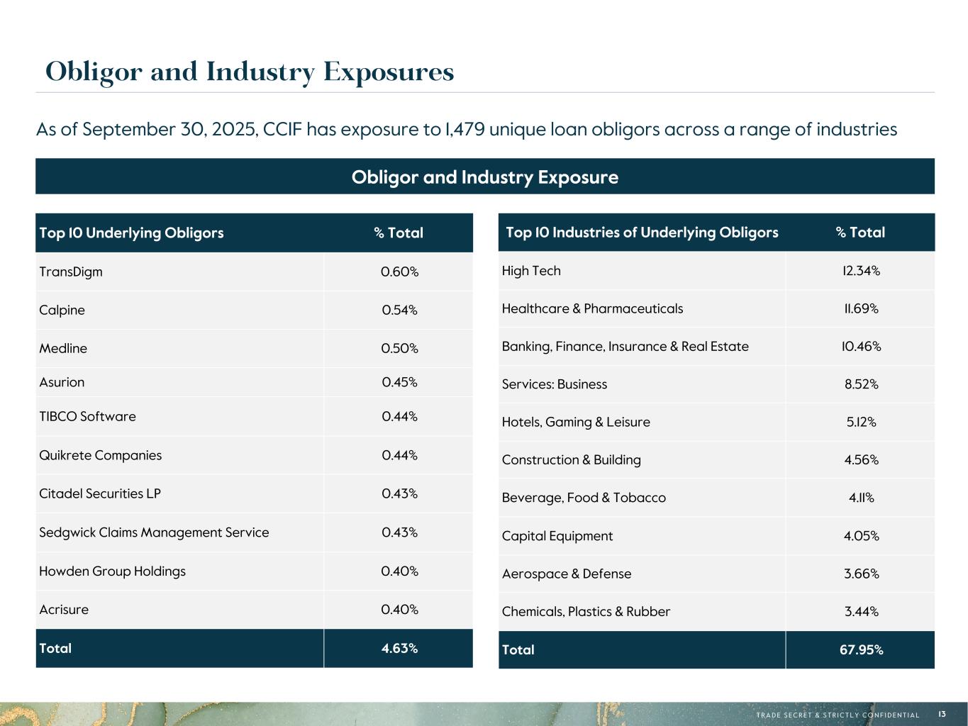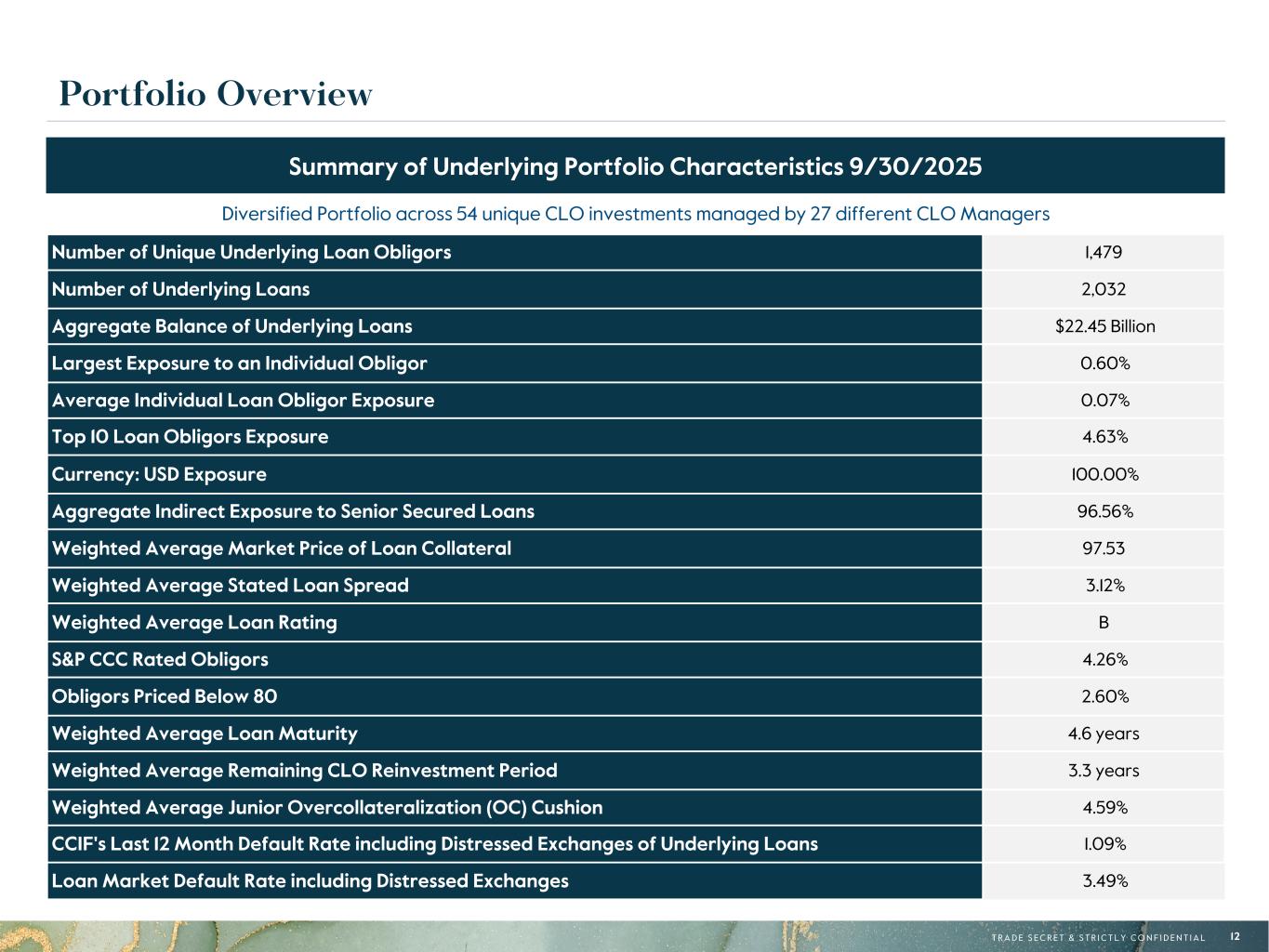 R-171, G-132, B-51 R-108, G-132, B-156 R-97, G-161, B-224 R-10, G-54, B-74 R-29, G-101, B-113 R-182, G-231, B-250 R-215, G-185, B-122 R-196, G-206, B-215 R-171, G-202, B-243 R-13, G-107, B-147 R-33, G-152, B-172 R-208, G-232, B-248 R-0, G-0, B-0 R-95, G-95, B-95 R-188, G-188, B-188 R-235, G-235, B-235 R-242, G-232, B-211 R-196, G-234, B-240 T R A D E S E C R E T & S T R I C T L Y C O N F I D E N T I A L 12 Portfolio Overview Diversified Portfolio across 54 unique CLO investments managed by 27 different CLO Managers Number of Unique Underlying Loan Obligors 1,479 Number of Underlying Loans 2,032 Aggregate Balance of Underlying Loans $22.45 Billion Largest Exposure to an Individual Obligor 0.60% Average Individual Loan Obligor Exposure 0.07% Top 10 Loan Obligors Exposure 4.63% Currency: USD Exposure 100.00% Aggregate Indirect Exposure to Senior Secured Loans 96.56% Weighted Average Market Price of Loan Collateral 97.53 Weighted Average Stated Loan Spread 3.12% Weighted Average Loan Rating B S&P CCC Rated Obligors 4.26% Obligors Priced Below 80 2.60% Weighted Average Loan Maturity 4.6 years Weighted Average Remaining CLO Reinvestment Period 3.3 years Weighted Average Junior Overcollateralization (OC) Cushion 4.59% CCIF's Last 12 Month Default Rate including Distressed Exchanges of Underlying Loans 1.09% Loan Market Default Rate including Distressed Exchanges 3.49% Summary of Underlying Portfolio Characteristics 9/30/2025