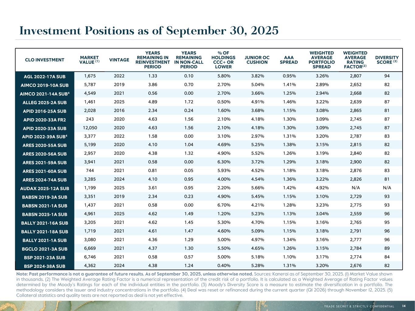 R-171, G-132, B-51 R-108, G-132, B-156 R-97, G-161, B-224 R-10, G-54, B-74 R-29, G-101, B-113 R-182, G-231, B-250 R-215, G-185, B-122 R-196, G-206, B-215 R-171, G-202, B-243 R-13, G-107, B-147 R-33, G-152, B-172 R-208, G-232, B-248 R-0, G-0, B-0 R-95, G-95, B-95 R-188, G-188, B-188 R-235, G-235, B-235 R-242, G-232, B-211 R-196, G-234, B-240 T R A D E S E C R E T & S T R I C T L Y C O N F I D E N T I A L 14 Investment Positions as of September 30, 2025 CLO INVESTMENT MARKET VALUE (1) VINTAGE YEARS REMAINING IN REINVESTMENT PERIOD YEARS REMAINING IN NON-CALL PERIOD % OF HOLDINGS CCC+ OR LOWER JUNIOR OC CUSHION AAA SPREAD WEIGHTED AVERAGE PORTFOLIO SPREAD WEIGHTED AVERAGE RATING FACTOR(2) DIVERSITY SCORE (3) AGL 2022-17A SUB 1,675 2022 1.33 0.10 5.80% 3.82% 0.95% 3.26% 2,807 94 AIMCO 2019-10A SUB 5,787 2019 3.86 0.70 2.70% 5.04% 1.41% 2.89% 2,652 82 AIMCO 2021-14A SUB4 4,549 2021 0.56 0.00 2.70% 3.66% 1.25% 2.94% 2,668 82 ALLEG 2025-2A SUB 1,461 2025 4.89 1.72 0.50% 4.91% 1.46% 3.22% 2,639 87 APID 2016-25A SUB 2,028 2016 2.34 0.24 1.60% 3.68% 1.15% 3.08% 2,865 81 APID 2020-33A FR2 243 2020 4.63 1.56 2.10% 4.18% 1.30% 3.09% 2,745 87 APID 2020-33A SUB 12,050 2020 4.63 1.56 2.10% 4.18% 1.30% 3.09% 2,745 87 APID 2022-39A SUB4 3,377 2022 1.58 0.00 3.10% 2.97% 1.31% 3.20% 2,787 83 ARES 2020-55A SUB 5,199 2020 4.10 1.04 4.69% 5.25% 1.38% 3.15% 2,815 82 ARES 2020-56A SUB 2,957 2020 4.38 1.32 4.90% 5.52% 1.26% 3.19% 2,840 82 ARES 2021-59A SUB 3,941 2021 0.58 0.00 6.30% 3.72% 1.29% 3.18% 2,900 82 ARES 2021-60A SUB 744 2021 0.81 0.05 5.93% 4.52% 1.18% 3.18% 2,876 83 ARES 2024-74A SUB 3,285 2024 4.10 0.95 4.00% 4.54% 1.36% 3.22% 2,826 81 AUDAX 2025-12A SUB 1,199 2025 3.61 0.95 2.20% 5.66% 1.42% 4.92% N/A N/A BABSN 2019-3A SUB 3,351 2019 2.34 0.23 4.90% 5.45% 1.15% 3.10% 2,729 93 BABSN 2021-1A SUB 1,437 2021 0.58 0.00 6.70% 4.21% 1.28% 3.23% 2,775 93 BABSN 2025-1A SUB 4,961 2025 4.62 1.49 1.20% 5.23% 1.13% 3.04% 2,559 96 BALLY 2021-16A SUB 3,205 2021 4.62 1.45 5.30% 4.70% 1.15% 3.16% 2,765 95 BALLY 2021-18A SUB 1,719 2021 4.61 1.47 4.60% 5.09% 1.15% 3.18% 2,791 96 BALLY 2021-1A SUB 3,080 2021 4.36 1.29 5.00% 4.97% 1.34% 3.16% 2,777 96 BGCLO 2021-3A SUB 6,669 2021 4.37 1.30 5.50% 4.65% 1.26% 3.15% 2,784 89 BSP 2021-23A SUB 6,746 2021 0.58 0.57 5.00% 5.18% 1.10% 3.17% 2,774 84 BSP 2024-38A SUB 4,362 2024 4.38 1.24 0.40% 5.28% 1.31% 3.20% 2,676 82 Note: Past performance is not a guarantee of future results. As of September 30, 2025, unless otherwise noted. Sources: Kanerai as of September 30, 2025. (1) Market Value shown in thousands. (2) The Weighted Average Rating Factor is a numerical representation of the credit risk of a portfolio. It is calculated as a Weighted Average of Rating Factor values determined by the Moody’s Ratings for each of the individual entities in the portfolio. (3) Moody's Diversity Score is a measure to estimate the diversification in a portfolio. The methodology considers the issuer and industry concentrations in the portfolio. (4) Deal was reset or refinanced during the current quarter (Q1 2026) through November 12, 2025. (5) Collateral statistics and quality tests are not reported as deal is not yet effective.