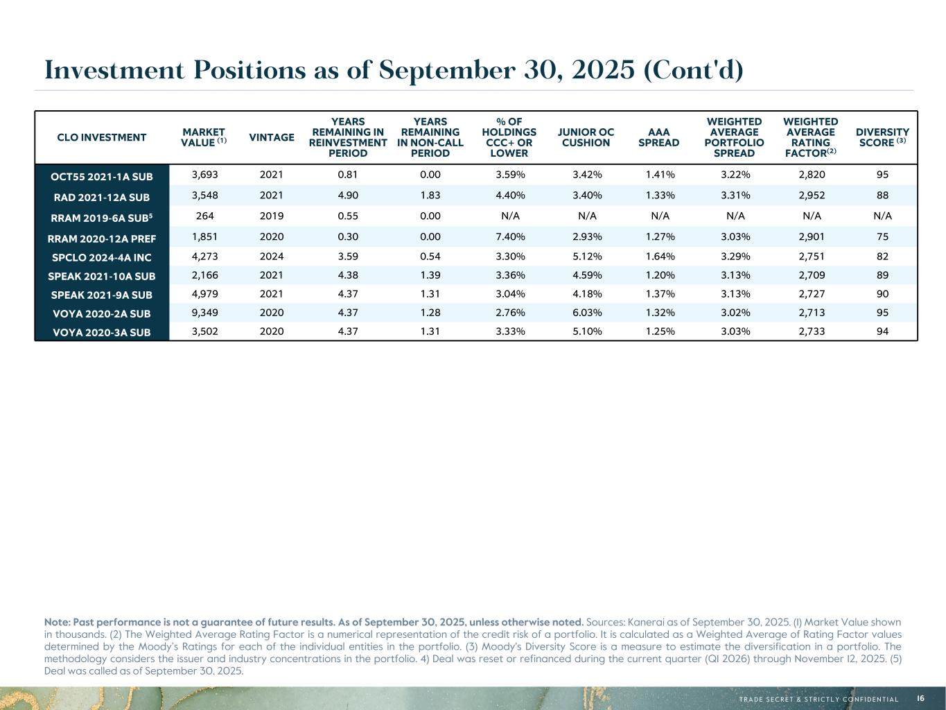 R-171, G-132, B-51 R-108, G-132, B-156 R-97, G-161, B-224 R-10, G-54, B-74 R-29, G-101, B-113 R-182, G-231, B-250 R-215, G-185, B-122 R-196, G-206, B-215 R-171, G-202, B-243 R-13, G-107, B-147 R-33, G-152, B-172 R-208, G-232, B-248 R-0, G-0, B-0 R-95, G-95, B-95 R-188, G-188, B-188 R-235, G-235, B-235 R-242, G-232, B-211 R-196, G-234, B-240 T R A D E S E C R E T & S T R I C T L Y C O N F I D E N T I A L 15 Investment Positions as of September 30, 2025 (Cont'd) CLO INVESTMENT MARKET VALUE (1) VINTAGE YEARS REMAINING IN REINVESTMENT PERIOD YEARS REMAINING IN NON-CALL PERIOD % OF HOLDINGS CCC+ OR LOWER JUNIOR OC CUSHION AAA SPREAD WEIGHTED AVERAGE PORTFOLIO SPREAD WEIGHTED AVERAGE RATING FACTOR(2) DIVERSITY SCORE (3) CIFC 2020-2A SUB 2,754 2020 1.07 0.00 6.10% 5.09% 1.43% 3.23% 2,867 97 CIFC 2020-3A SUB4 5,040 2020 1.07 0.00 4.90% 5.15% 1.40% 3.19% 2,824 97 DAVIS 2022-1A M1 47 2022 4.87 1.80 4.10% 5.01% 1.34% 3.19% 2,764 82 DAVIS 2022-1A M2 111 2022 4.87 1.80 4.10% 5.01% 1.34% 3.19% 2,764 82 DAVIS 2022-1A SUB 3,931 2022 4.87 1.80 4.10% 5.01% 1.34% 3.19% 2,764 82 ELM17 2022-4A SUB 11,303 2022 3.85 0.79 2.86% 4.05% 1.39% 2.98% 2,649 90 ELMW7 2020-4A SUB 1,485 2020 4.11 1.05 2.85% 3.09% 1.36% 3.00% 2,661 89 EMPWR 2022-1A SUB 6,818 2022 4.11 1.05 1.60% 4.59% 1.40% 2.99% 2,557 90 GALXY 2016-22A SUBA 1,272 2016 0.55 0.01 3.20% 3.43% 1.24% 3.09% 2,755 87 KKR 25 SUB 1,087 2019 0.80 0.79 8.90% 2.28% 0.95% 3.30% 3,024 84 MIDO 2022-11A SUB 3,720 2022 2.33 0.29 4.30% 4.87% 1.22% 3.28% 2,737 81 MIDO 2024-14A SUB 3,978 2024 3.59 0.49 3.40% 4.82% 1.59% 3.23% 2,717 83 MORGN 2021-7A SUB5 269 2021 0.57 0.00 N/A N/A N/A N/A N/A N/A NEUB 2020-38A SBPF 27 2020 1.07 0.41 6.70% 4.46% 0.96% 3.15% 2,951 92 NEUB 2020-38A SUB 4,998 2020 1.07 0.41 6.70% 4.46% 0.96% 3.15% 2,951 92 NEUB 2021-41A SUB 2,184 2021 0.55 0.54 5.90% 3.60% 1.05% 3.08% 2,868 93 NIAPK 2019-1A G 404 2019 4.36 1.30 6.60% 4.91% 1.35% 3.20% 2,854 77 NIAPK 2019-1A SUB 4,529 2019 4.36 1.30 6.60% 4.91% 1.35% 3.20% 2854 77 OAKC 2016-13A SUB 1,903 2016 4.12 0.95 4.40% 4.82% 1.40% 2.95% 2,767 82 OAKCL 2019-3A SUB 2,002 2019 4.37 1.10 3.40% 4.24% 1.39% 3.12% 2,603 86 OCP 2015-9A SUB 8,839 2015 2.33 0.29 2.90% 4.96% 1.10% 2.99% 2,641 89 OCP 2017-13A SUB 5,681 2017 4.22 1.16 2.80% 3.99% 1.34% 2.99% 2,595 90 Note: Past performance is not a guarantee of future results. As of September 30, 2025, unless otherwise noted. Sources: Kanerai as of September 30, 2025. (1) Market Value shown in thousands. (2) The Weighted Average Rating Factor is a numerical representation of the credit risk of a portfolio. It is calculated as a Weighted Average of Rating Factor values determined by the Moody’s Ratings for each of the individual entities in the portfolio. (3) Moody's Diversity Score is a measure to estimate the diversification in a portfolio. The methodology considers the issuer and industry concentrations in the portfolio. (4) Deal was reset or refinanced during the current quarter (Q1 2026) through November 12, 2025. (5) Deal was called as of September 30, 2025.