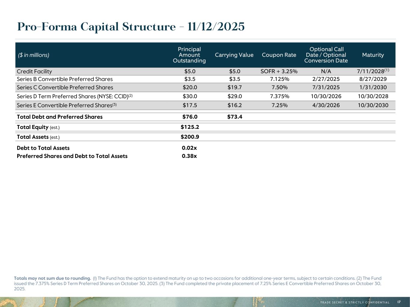 R-171, G-132, B-51 R-108, G-132, B-156 R-97, G-161, B-224 R-10, G-54, B-74 R-29, G-101, B-113 R-182, G-231, B-250 R-215, G-185, B-122 R-196, G-206, B-215 R-171, G-202, B-243 R-13, G-107, B-147 R-33, G-152, B-172 R-208, G-232, B-248 R-0, G-0, B-0 R-95, G-95, B-95 R-188, G-188, B-188 R-235, G-235, B-235 R-242, G-232, B-211 R-196, G-234, B-240 T R A D E S E C R E T & S T R I C T L Y C O N F I D E N T I A L 17 Pro-Forma Capital Structure - 11/12/2025 Totals may not sum due to rounding. (1) The Fund has the option to extend maturity on up to two occasions for additional one-year terms, subject to certain conditions. (2) The Fund issued the 7.375% Series D Term Preferred Shares on October 30, 2025. (3) The Fund completed the private placement of 7.25% Series E Convertible Preferred Shares on October 30, 2025. ($ in millions) Principal Amount Outstanding Carrying Value Coupon Rate Optional Call Date / Optional Conversion Date Maturity Credit Facility $5.0 $5.0 SOFR + 3.25% N/A 7/11/2028(1) Series B Convertible Preferred Shares $3.5 $3.5 7.125% 2/27/2025 8/27/2029 Series C Convertible Preferred Shares $20.0 $19.7 7.50% 7/31/2025 1/31/2030 Series D Term Preferred Shares (NYSE: CCID)(2) $30.0 $29.0 7.375% 10/30/2026 10/30/2028 Series E Convertible Preferred Shares(3) $17.5 $16.2 7.25% 4/30/2026 10/30/2030 Total Debt and Preferred Shares $76.0 $73.4 Total Equity (est.) $125.2 Total Assets (est.) $200.9 Debt to Total Assets 0.02x Preferred Shares and Debt to Total Assets 0.38x