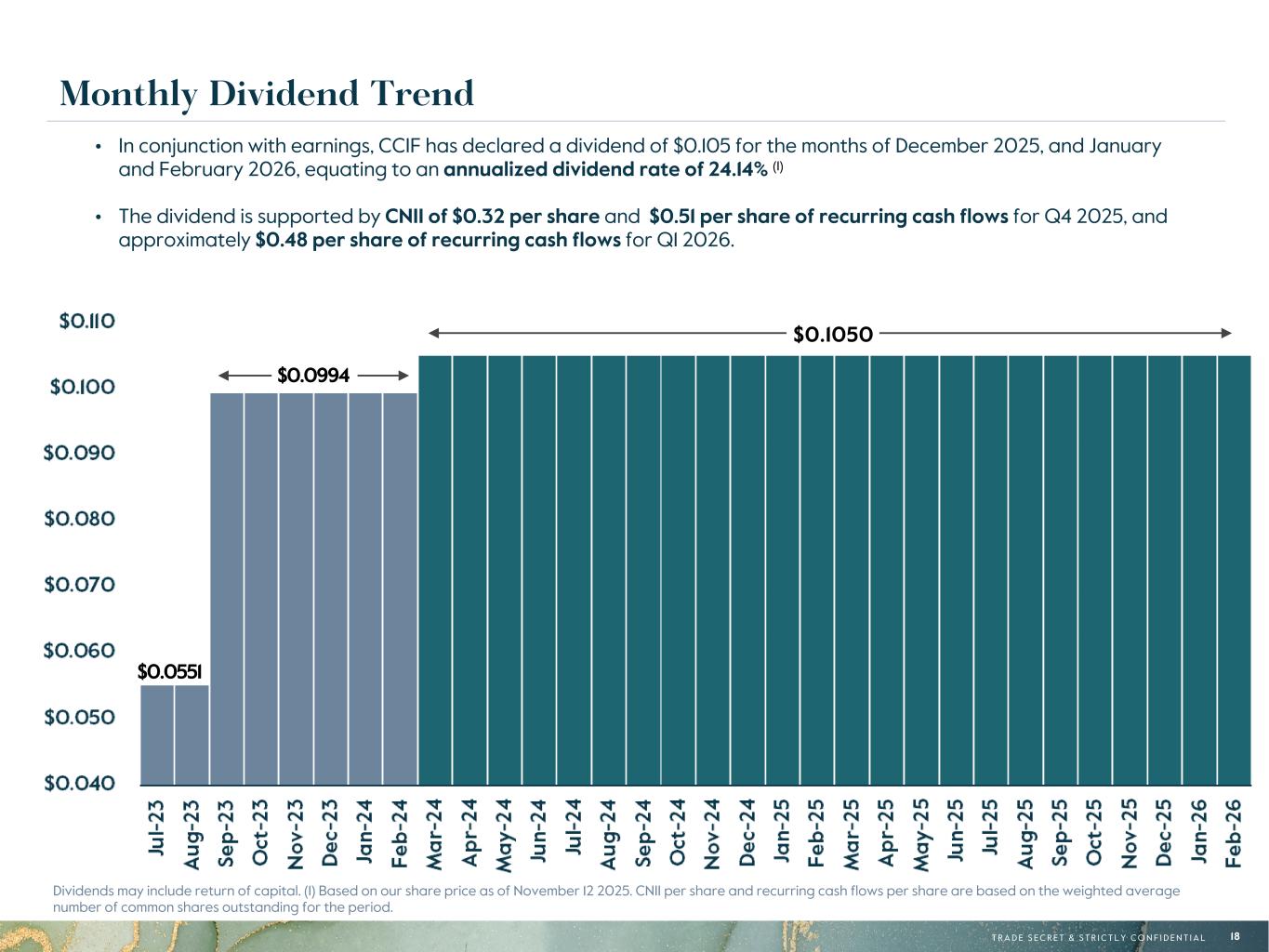 R-171, G-132, B-51 R-108, G-132, B-156 R-97, G-161, B-224 R-10, G-54, B-74 R-29, G-101, B-113 R-182, G-231, B-250 R-215, G-185, B-122 R-196, G-206, B-215 R-171, G-202, B-243 R-13, G-107, B-147 R-33, G-152, B-172 R-208, G-232, B-248 R-0, G-0, B-0 R-95, G-95, B-95 R-188, G-188, B-188 R-235, G-235, B-235 R-242, G-232, B-211 R-196, G-234, B-240 T R A D E S E C R E T & S T R I C T L Y C O N F I D E N T I A L 18 Monthly Dividend Trend Dividends may include return of capital. (1) Based on our share price as of November 12 2025. CNII per share and recurring cash flows per share are based on the weighted average number of common shares outstanding for the period. • In conjunction with earnings, CCIF has declared a dividend of $0.105 for the months of December 2025, and January and February 2026, equating to an annualized dividend rate of 24.14% (1) • The dividend is supported by CNII of $0.32 per share and $0.51 per share of recurring cash flows for Q4 2025, and approximately $0.48 per share of recurring cash flows for Q1 2026. $0.0551 $0.0994 $0.1050