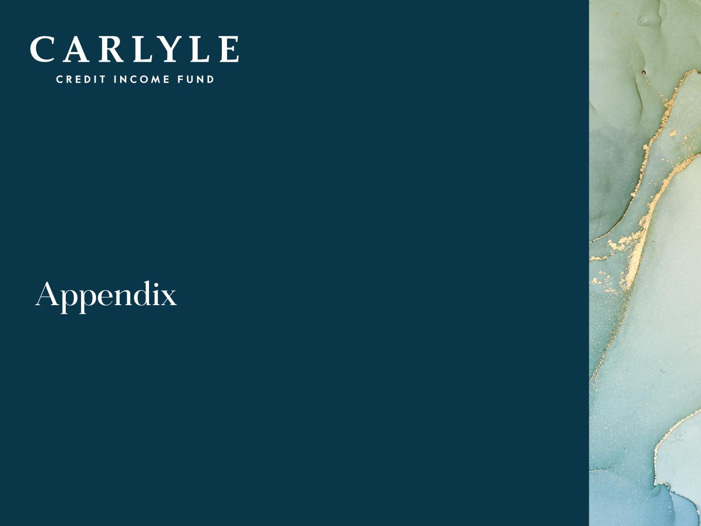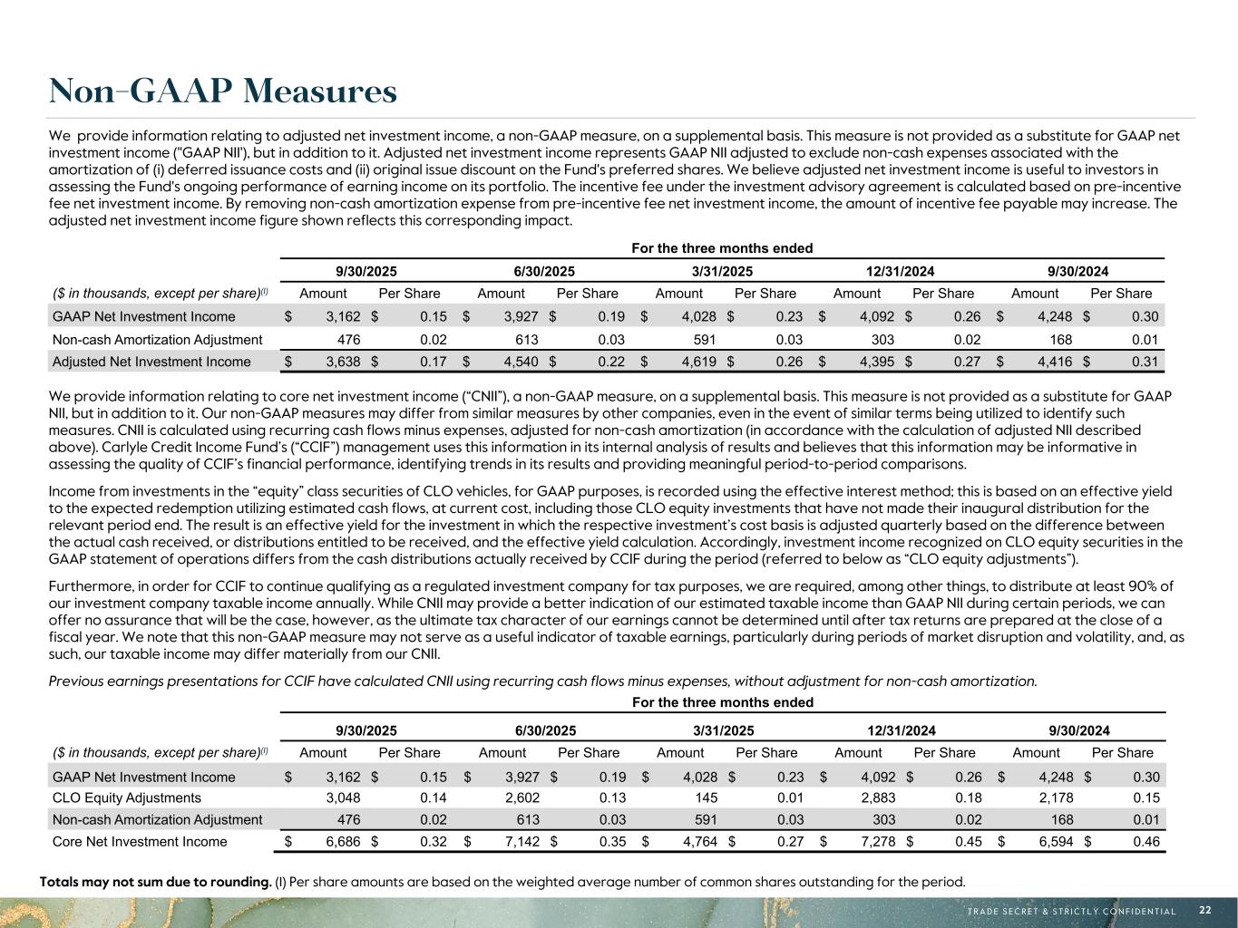 R-171, G-132, B-51 R-108, G-132, B-156 R-97, G-161, B-224 R-10, G-54, B-74 R-29, G-101, B-113 R-182, G-231, B-250 R-215, G-185, B-122 R-196, G-206, B-215 R-171, G-202, B-243 R-13, G-107, B-147 R-33, G-152, B-172 R-208, G-232, B-248 R-0, G-0, B-0 R-95, G-95, B-95 R-188, G-188, B-188 R-235, G-235, B-235 R-242, G-232, B-211 R-196, G-234, B-240 T R A D E S E C R E T & S T R I C T L Y C O N F I D E N T I A L 22 Non-GAAP Measures We provide information relating to core net investment income (“CNII”), a non-GAAP measure, on a supplemental basis. This measure is not provided as a substitute for GAAP NII, but in addition to it. Our non-GAAP measures may differ from similar measures by other companies, even in the event of similar terms being utilized to identify such measures. CNII is calculated using recurring cash flows minus expenses, adjusted for non-cash amortization (in accordance with the calculation of adjusted NII described above). Carlyle Credit Income Fund’s (“CCIF”) management uses this information in its internal analysis of results and believes that this information may be informative in assessing the quality of CCIF’s financial performance, identifying trends in its results and providing meaningful period-to-period comparisons. Income from investments in the “equity” class securities of CLO vehicles, for GAAP purposes, is recorded using the effective interest method; this is based on an effective yield to the expected redemption utilizing estimated cash flows, at current cost, including those CLO equity investments that have not made their inaugural distribution for the relevant period end. The result is an effective yield for the investment in which the respective investment’s cost basis is adjusted quarterly based on the difference between the actual cash received, or distributions entitled to be received, and the effective yield calculation. Accordingly, investment income recognized on CLO equity securities in the GAAP statement of operations differs from the cash distributions actually received by CCIF during the period (referred to below as “CLO equity adjustments”). Furthermore, in order for CCIF to continue qualifying as a regulated investment company for tax purposes, we are required, among other things, to distribute at least 90% of our investment company taxable income annually. While CNII may provide a better indication of our estimated taxable income than GAAP NII during certain periods, we can offer no assurance that will be the case, however, as the ultimate tax character of our earnings cannot be determined until after tax returns are prepared at the close of a fiscal year. We note that this non-GAAP measure may not serve as a useful indicator of taxable earnings, particularly during periods of market disruption and volatility, and, as such, our taxable income may differ materially from our CNII. Previous earnings presentations for CCIF have calculated CNII using recurring cash flows minus expenses, without adjustment for non-cash amortization. For the three months ended 9/30/2025 6/30/2025 3/31/2025 12/31/2024 9/30/2024 ($ in thousands, except per share)(1) Amount Per Share Amount Per Share Amount Per Share Amount Per Share Amount Per Share GAAP Net Investment Income $ 3,162 $ 0.15 $ 3,927 $ 0.19 $ 4,028 $ 0.23 $ 4,092 $ 0.26 $ 4,248 $ 0.30 CLO Equity Adjustments 3,048 0.14 2,602 0.13 145 0.01 2,883 0.18 2,178 0.15 Non-cash Amortization Adjustment 476 0.02 613 0.03 591 0.03 303 0.02 168 0.01 Core Net Investment Income $ 6,686 $ 0.32 $ 7,142 $ 0.35 $ 4,764 $ 0.27 $ 7,278 $ 0.45 $ 6,594 $ 0.46 We provide information relating to adjusted net investment income, a non-GAAP measure, on a supplemental basis. This measure is not provided as a substitute for GAAP net investment income ("GAAP NII'), but in addition to it. Adjusted net investment income represents GAAP NII adjusted to exclude non-cash expenses associated with the amortization of (i) deferred issuance costs and (ii) original issue discount on the Fund's preferred shares. We believe adjusted net investment income is useful to investors in assessing the Fund's ongoing performance of earning income on its portfolio. The incentive fee under the investment advisory agreement is calculated based on pre-incentive fee net investment income. By removing non-cash amortization expense from pre-incentive fee net investment income, the amount of incentive fee payable may increase. The adjusted net investment income figure shown reflects this corresponding impact. For the three months ended 9/30/2025 6/30/2025 3/31/2025 12/31/2024 9/30/2024 ($ in thousands, except per share)(1) Amount Per Share Amount Per Share Amount Per Share Amount Per Share Amount Per Share GAAP Net Investment Income $ 3,162 $ 0.15 $ 3,927 $ 0.19 $ 4,028 $ 0.23 $ 4,092 $ 0.26 $ 4,248 $ 0.30 Non-cash Amortization Adjustment 476 0.02 613 0.03 591 0.03 303 0.02 168 0.01 Adjusted Net Investment Income $ 3,638 $ 0.17 $ 4,540 $ 0.22 $ 4,619 $ 0.26 $ 4,395 $ 0.27 $ 4,416 $ 0.31 Totals may not sum due to rounding. (1) Per share amounts are based on the weighted average number of common shares outstanding for the period.