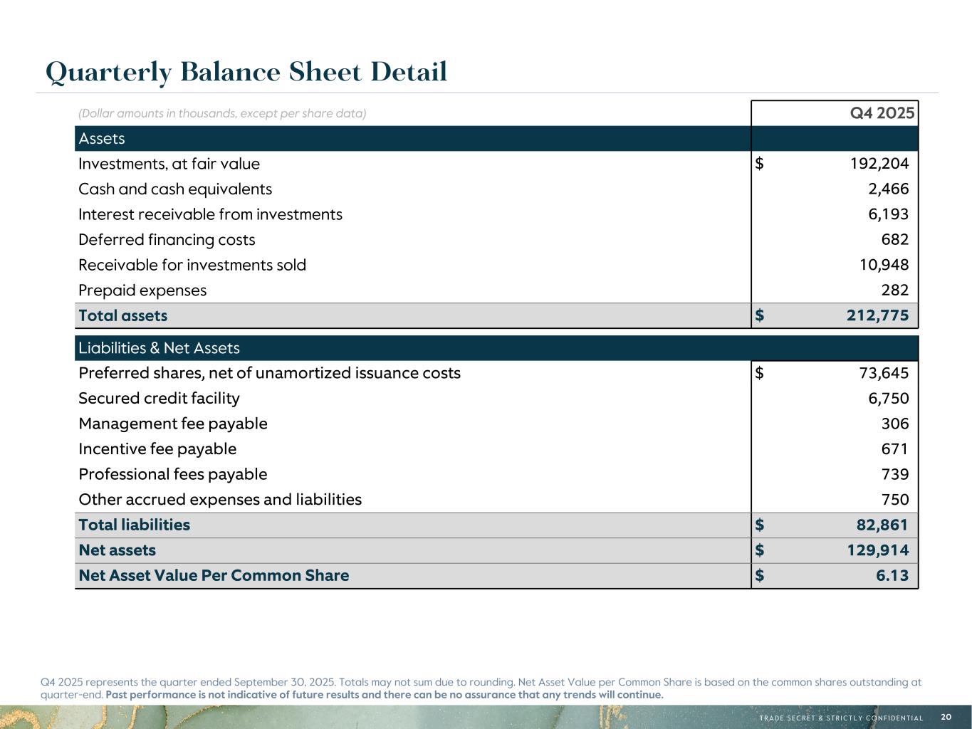 R-171, G-132, B-51 R-108, G-132, B-156 R-97, G-161, B-224 R-10, G-54, B-74 R-29, G-101, B-113 R-182, G-231, B-250 R-215, G-185, B-122 R-196, G-206, B-215 R-171, G-202, B-243 R-13, G-107, B-147 R-33, G-152, B-172 R-208, G-232, B-248 R-0, G-0, B-0 R-95, G-95, B-95 R-188, G-188, B-188 R-235, G-235, B-235 R-242, G-232, B-211 R-196, G-234, B-240 T R A D E S E C R E T & S T R I C T L Y C O N F I D E N T I A L 20 Quarterly Balance Sheet Detail (Dollar amounts in thousands, except per share data) Q4 2025 Assets Investments, at fair value $ 192,204 Cash and cash equivalents 2,466 Interest receivable from investments 6,193 Deferred financing costs 682 Receivable for investments sold 10,948 Prepaid expenses 282 Total assets $ 212,775 Liabilities & Net Assets Preferred shares, net of unamortized issuance costs $ 73,645 Secured credit facility 6,750 Management fee payable 306 Incentive fee payable 671 Professional fees payable 739 Other accrued expenses and liabilities 750 Total liabilities $ 82,861 Net assets $ 129,914 Net Asset Value Per Common Share $ 6.13 Q4 2025 represents the quarter ended September 30, 2025. Totals may not sum due to rounding. Net Asset Value per Common Share is based on the common shares outstanding at quarter-end. Past performance is not indicative of future results and there can be no assurance that any trends will continue.