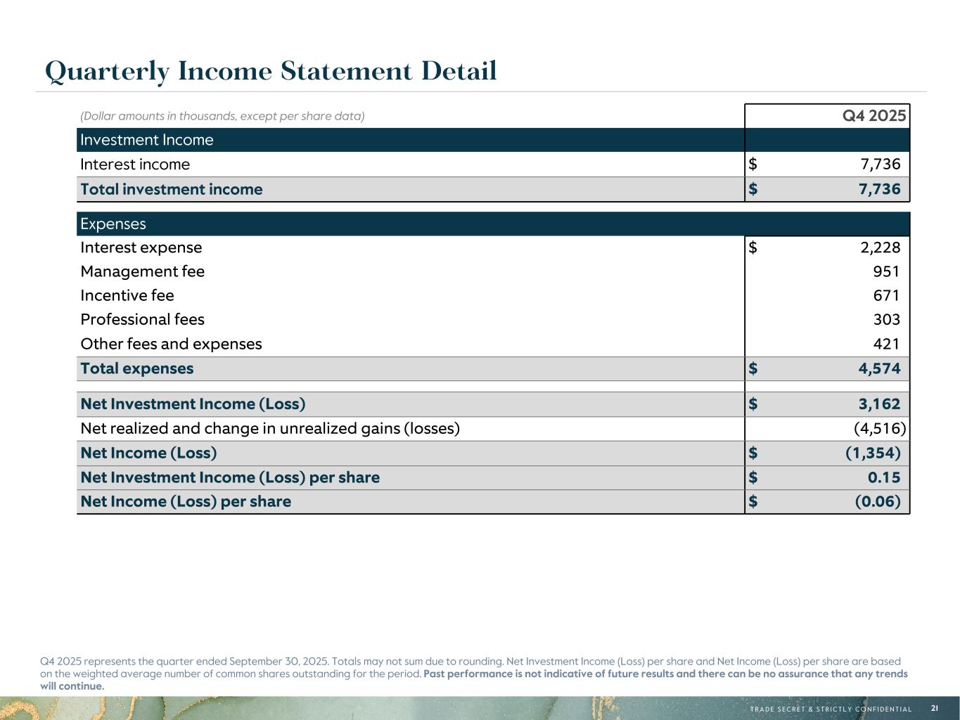 R-171, G-132, B-51 R-108, G-132, B-156 R-97, G-161, B-224 R-10, G-54, B-74 R-29, G-101, B-113 R-182, G-231, B-250 R-215, G-185, B-122 R-196, G-206, B-215 R-171, G-202, B-243 R-13, G-107, B-147 R-33, G-152, B-172 R-208, G-232, B-248 R-0, G-0, B-0 R-95, G-95, B-95 R-188, G-188, B-188 R-235, G-235, B-235 R-242, G-232, B-211 R-196, G-234, B-240 T R A D E S E C R E T & S T R I C T L Y C O N F I D E N T I A L 21 Q4 2025 represents the quarter ended September 30, 2025. Totals may not sum due to rounding. Net Investment Income (Loss) per share and Net Income (Loss) per share are based on the weighted average number of common shares outstanding for the period. Past performance is not indicative of future results and there can be no assurance that any trends will continue. Quarterly Income Statement Detail (Dollar amounts in thousands, except per share data) Q4 2025 Investment Income Interest income $ 7,736 Total investment income $ 7,736 Expenses Interest expense $ 2,228 Management fee 951 Incentive fee 671 Professional fees 303 Other fees and expenses 421 Total expenses $ 4,574 Net Investment Income (Loss) $ 3,162 Net realized and change in unrealized gains (losses) (4,516) Net Income (Loss) $ (1,354) Net Investment Income (Loss) per share $ 0.15 Net Income (Loss) per share $ (0.06)