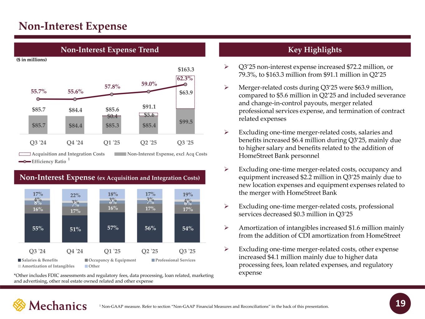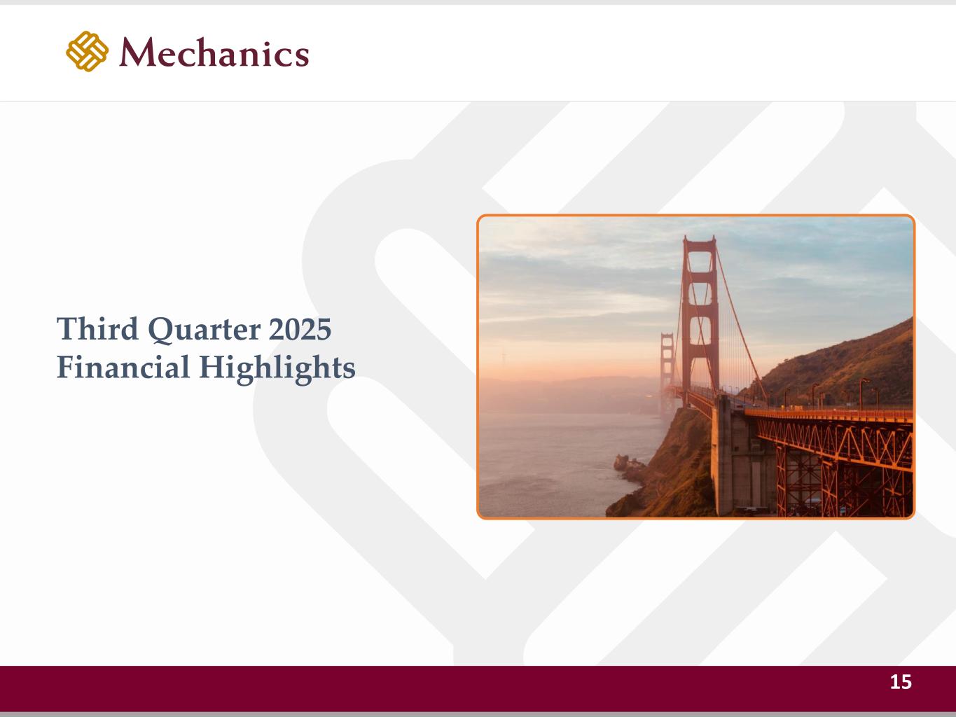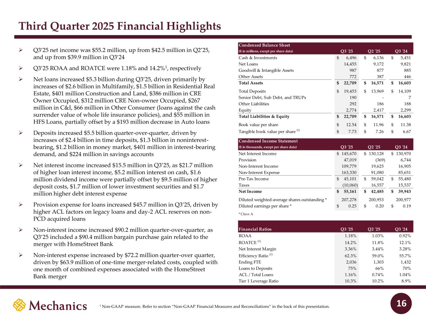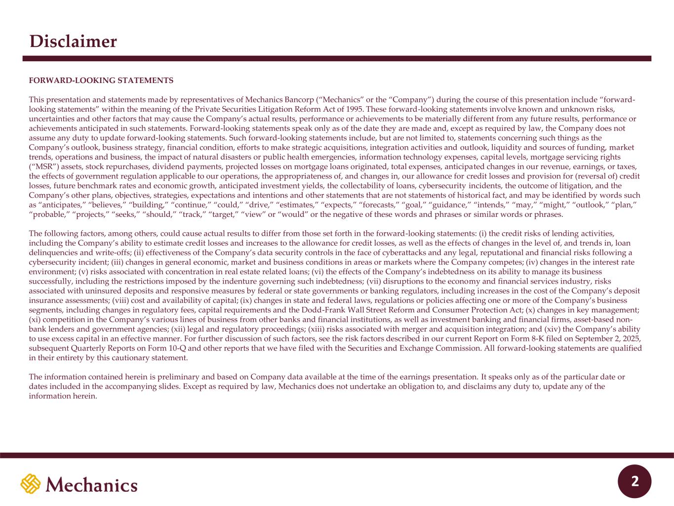 Disclaimer FORWARD-LOOKING STATEMENTS This presentation and statements made by representatives of Mechanics Bancorp (“Mechanics” or the “Company”) during the course of this presentation include “forward- looking statements” within the meaning of the Private Securities Litigation Reform Act of 1995. These forward-looking statements involve known and unknown risks, uncertainties and other factors that may cause the Company’s actual results, performance or achievements to be materially different from any future results, performance or achievements anticipated in such statements. Forward-looking statements speak only as of the date they are made and, except as required by law, the Company does not assume any duty to update forward-looking statements. Such forward-looking statements include, but are not limited to, statements concerning such things as the Company’s outlook, business strategy, financial condition, efforts to make strategic acquisitions, integration activities and outlook, liquidity and sources of funding, market trends, operations and business, the impact of natural disasters or public health emergencies, information technology expenses, capital levels, mortgage servicing rights (“MSR”) assets, stock repurchases, dividend payments, projected losses on mortgage loans originated, total expenses, anticipated changes in our revenue, earnings, or taxes, the effects of government regulation applicable to our operations, the appropriateness of, and changes in, our allowance for credit losses and provision for (reversal of) credit losses, future benchmark rates and economic growth, anticipated investment yields, the collectability of loans, cybersecurity incidents, the outcome of litigation, and the Company’s other plans, objectives, strategies, expectations and intentions and other statements that are not statements of historical fact, and may be identified by words such as “anticipates,” “believes,” “building,” “continue,” “could,” “drive,” “estimates,” “expects,” “forecasts,” “goal,” “guidance,” “intends,” “may,” “might,” “outlook,” “plan,” “probable,” “projects,” “seeks,” “should,” “track,” “target,” “view” or “would” or the negative of these words and phrases or similar words or phrases. The following factors, among others, could cause actual results to differ from those set forth in the forward-looking statements: (i) the credit risks of lending activities, including the Company’s ability to estimate credit losses and increases to the allowance for credit losses, as well as the effects of changes in the level of, and trends in, loan delinquencies and write-offs; (ii) effectiveness of the Company’s data security controls in the face of cyberattacks and any legal, reputational and financial risks following a cybersecurity incident; (iii) changes in general economic, market and business conditions in areas or markets where the Company competes; (iv) changes in the interest rate environment; (v) risks associated with concentration in real estate related loans; (vi) the effects of the Company’s indebtedness on its ability to manage its business successfully, including the restrictions imposed by the indenture governing such indebtedness; (vii) disruptions to the economy and financial services industry, risks associated with uninsured deposits and responsive measures by federal or state governments or banking regulators, including increases in the cost of the Company’s deposit insurance assessments; (viii) cost and availability of capital; (ix) changes in state and federal laws, regulations or policies affecting one or more of the Company’s business segments, including changes in regulatory fees, capital requirements and the Dodd-Frank Wall Street Reform and Consumer Protection Act; (x) changes in key management; (xi) competition in the Company’s various lines of business from other banks and financial institutions, as well as investment banking and financial firms, asset-based non- bank lenders and government agencies; (xii) legal and regulatory proceedings; (xiii) risks associated with merger and acquisition integration; and (xiv) the Company’s ability to use excess capital in an effective manner. For further discussion of such factors, see the risk factors described in our current Report on Form 8-K filed on September 2, 2025, subsequent Quarterly Reports on Form 10-Q and other reports that we have filed with the Securities and Exchange Commission. All forward-looking statements are qualified in their entirety by this cautionary statement. The information contained herein is preliminary and based on Company data available at the time of the earnings presentation. It speaks only as of the particular date or dates included in the accompanying slides. Except as required by law, Mechanics does not undertake an obligation to, and disclaims any duty to, update any of the information herein. 2