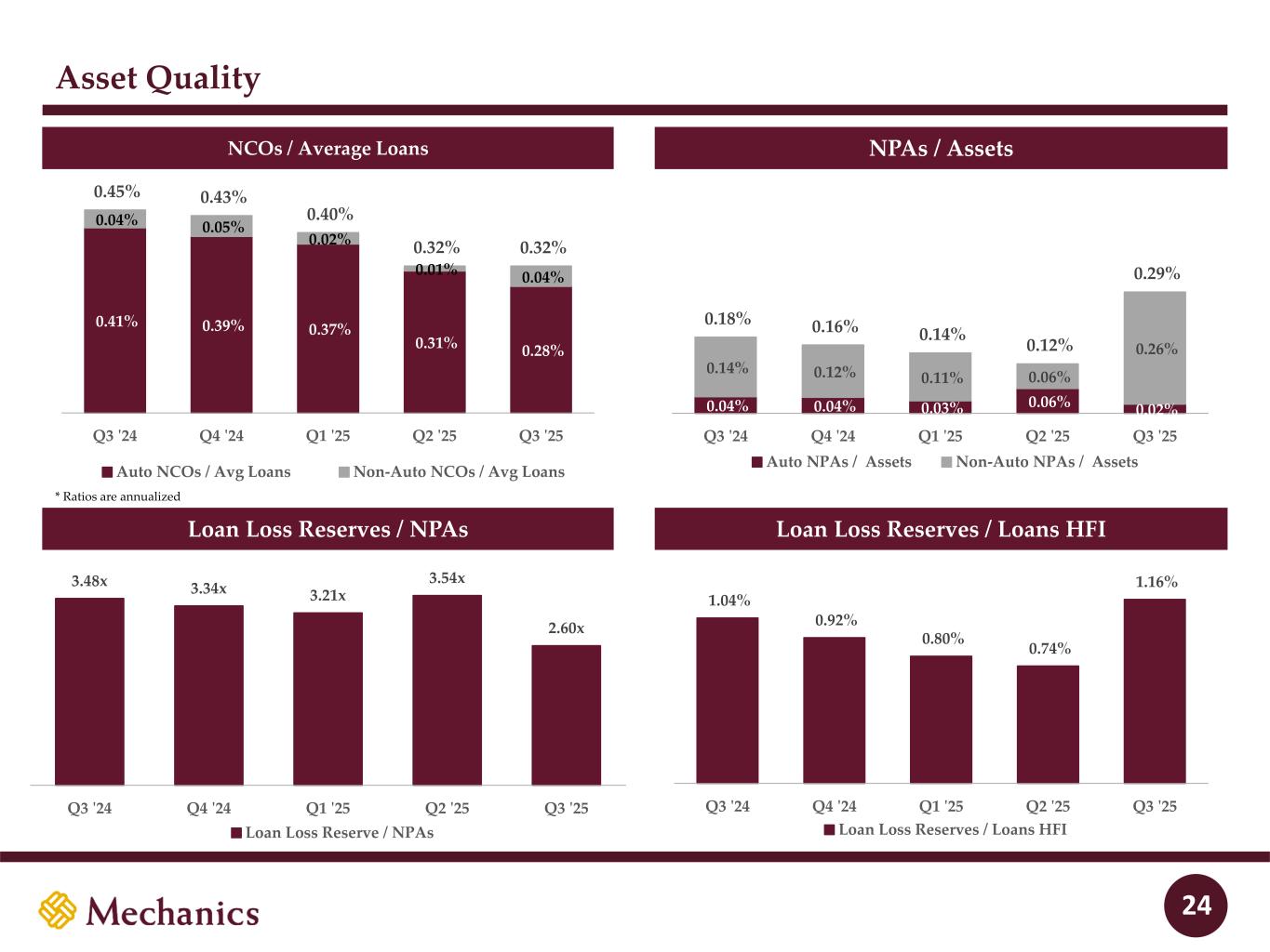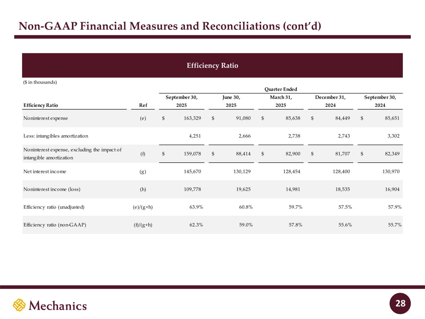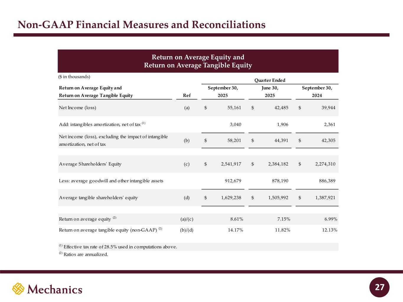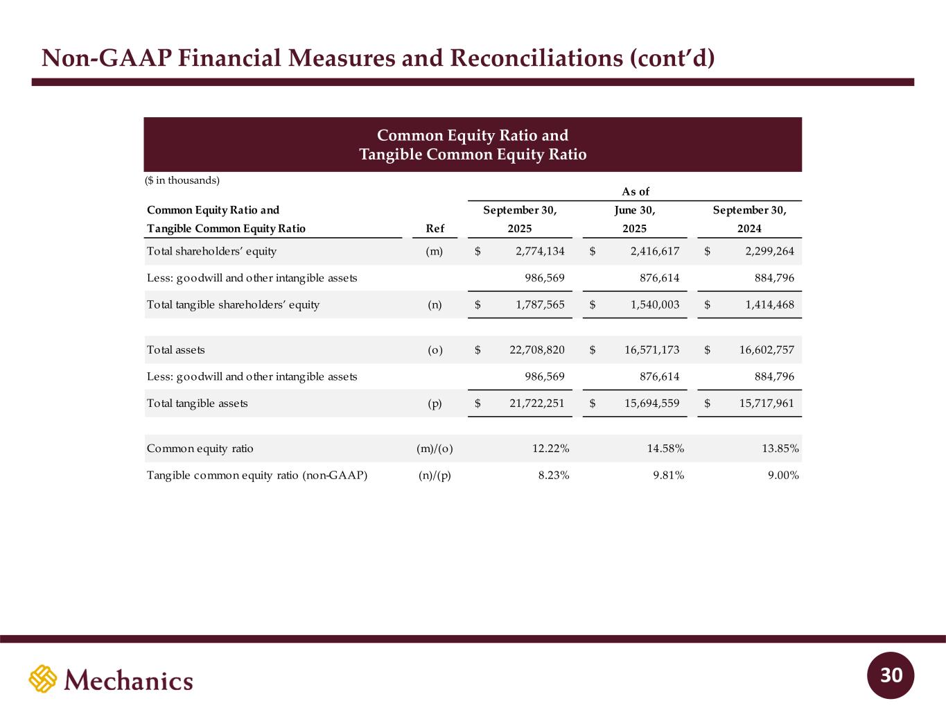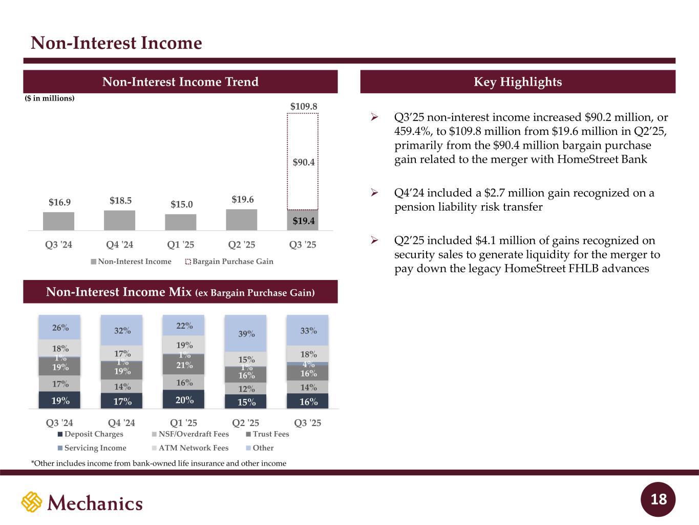 Disclaimer FORWARD-LOOKING STATEMENTS This presentation and statements made by representatives of Mechanics Bancorp (“Mechanics” or the “Company”) during the course of this presentation include “forward- looking statements” within the meaning of the Private Securities Litigation Reform Act of 1995. These forward-looking statements involve known and unknown risks, uncertainties and other factors that may cause the Company’s actual results, performance or achievements to be materially different from any future results, performance or achievements anticipated in such statements. Forward-looking statements speak only as of the date they are made and, except as required by law, the Company does not assume any duty to update forward-looking statements. Such forward-looking statements include, but are not limited to, statements concerning such things as the Company’s outlook, business strategy, financial condition, efforts to make strategic acquisitions, integration activities and outlook, liquidity and sources of funding, market trends, operations and business, the impact of natural disasters or public health emergencies, information technology expenses, capital levels, mortgage servicing rights (“MSR”) assets, stock repurchases, dividend payments, projected losses on mortgage loans originated, total expenses, anticipated changes in our revenue, earnings, or taxes, the effects of government regulation applicable to our operations, the appropriateness of, and changes in, our allowance for credit losses and provision for (reversal of) credit losses, future benchmark rates and economic growth, anticipated investment yields, the collectability of loans, cybersecurity incidents, the outcome of litigation, and the Company’s other plans, objectives, strategies, expectations and intentions and other statements that are not statements of historical fact, and may be identified by words such as “anticipates,” “believes,” “building,” “continue,” “could,” “drive,” “estimates,” “expects,” “forecasts,” “goal,” “guidance,” “intends,” “may,” “might,” “outlook,” “plan,” “probable,” “projects,” “seeks,” “should,” “track,” “target,” “view” or “would” or the negative of these words and phrases or similar words or phrases. The following factors, among others, could cause actual results to differ from those set forth in the forward-looking statements: (i) the credit risks of lending activities, including the Company’s ability to estimate credit losses and increases to the allowance for credit losses, as well as the effects of changes in the level of, and trends in, loan delinquencies and write-offs; (ii) effectiveness of the Company’s data security controls in the face of cyberattacks and any legal, reputational and financial risks following a cybersecurity incident; (iii) changes in general economic, market and business conditions in areas or markets where the Company competes; (iv) changes in the interest rate environment; (v) risks associated with concentration in real estate related loans; (vi) the effects of the Company’s indebtedness on its ability to manage its business successfully, including the restrictions imposed by the indenture governing such indebtedness; (vii) disruptions to the economy and financial services industry, risks associated with uninsured deposits and responsive measures by federal or state governments or banking regulators, including increases in the cost of the Company’s deposit insurance assessments; (viii) cost and availability of capital; (ix) changes in state and federal laws, regulations or policies affecting one or more of the Company’s business segments, including changes in regulatory fees, capital requirements and the Dodd-Frank Wall Street Reform and Consumer Protection Act; (x) changes in key management; (xi) competition in the Company’s various lines of business from other banks and financial institutions, as well as investment banking and financial firms, asset-based non- bank lenders and government agencies; (xii) legal and regulatory proceedings; (xiii) risks associated with merger and acquisition integration; and (xiv) the Company’s ability to use excess capital in an effective manner. For further discussion of such factors, see the risk factors described in our current Report on Form 8-K filed on September 2, 2025, subsequent Quarterly Reports on Form 10-Q and other reports that we have filed with the Securities and Exchange Commission. All forward-looking statements are qualified in their entirety by this cautionary statement. The information contained herein is preliminary and based on Company data available at the time of the earnings presentation. It speaks only as of the particular date or dates included in the accompanying slides. Except as required by law, Mechanics does not undertake an obligation to, and disclaims any duty to, update any of the information herein. 2