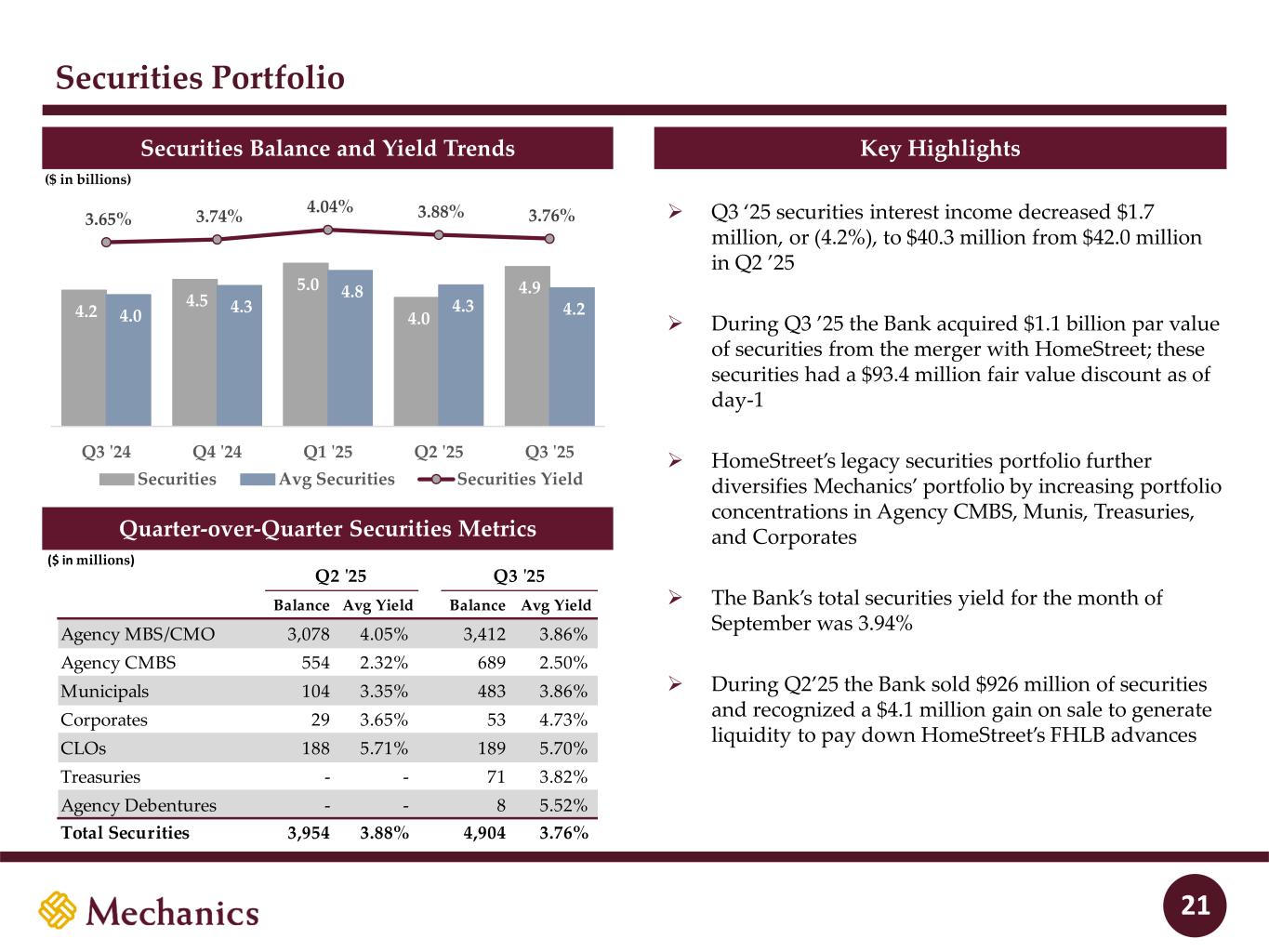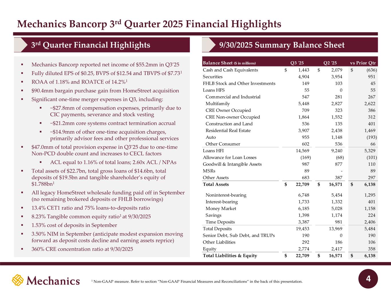 Disclaimer (cont’d) Presentation of Results – HomeStreet Bank Merger On September 2, 2025, the merger of HomeStreet Bank, the wholly owned subsidiary of Mechanics Bancorp (formerly known as HomeStreet, Inc.) with and into Mechanics Bank, was completed. Mechanics Bank is the accounting acquirer (legal acquiree), HomeStreet Bank is the accounting acquiree and Mechanics Bancorp is the legal acquirer. Mechanic’s financial results for all periods ended prior to September 2, 2025 reflect Mechanics Bank’s historical financial results on a standalone basis. In addition, Mechanics’ reported financial results for the quarter and nine months ended September 30, 2025 reflect Mechanics Bank’s financial results on a standalone basis until the closing of the merger on September 2, 2025 and results of the combined company for September 2, 2025 through September 30, 2025. The number of shares issued and outstanding, earnings per share, and all references to share quantities or metrics of Mechanics have been retrospectively restated to reflect the equivalent number of shares issued in the merger since the merger was accounted for as a reverse acquisition. As the accounting acquirer, Mechanics Bank remeasured the identifiable assets acquired and liabilities assumed in the merger as of September 2, 2025 at their acquisition date fair values. 3
