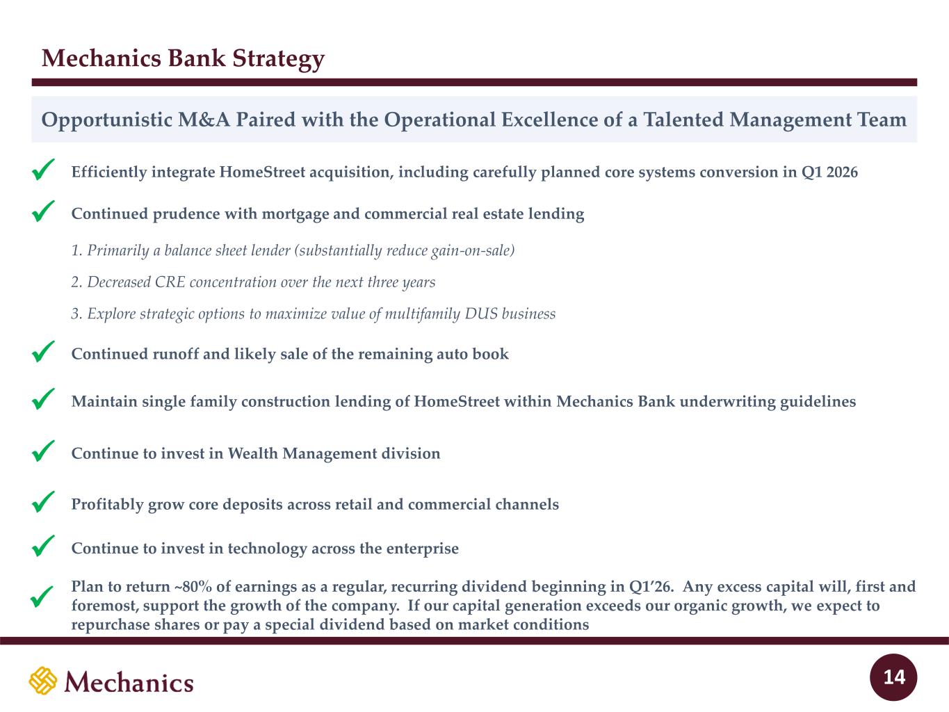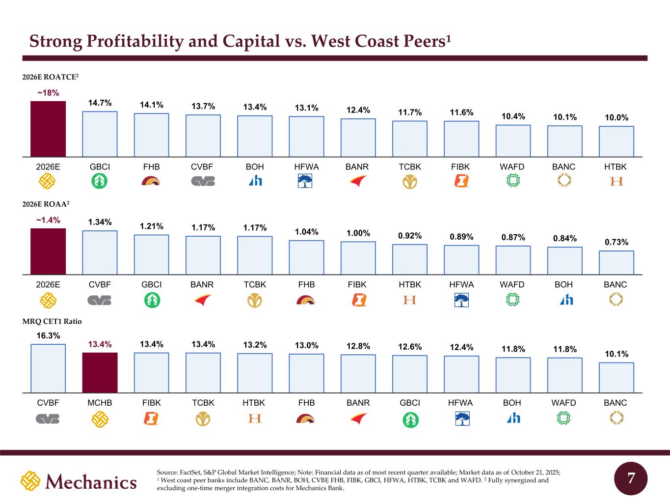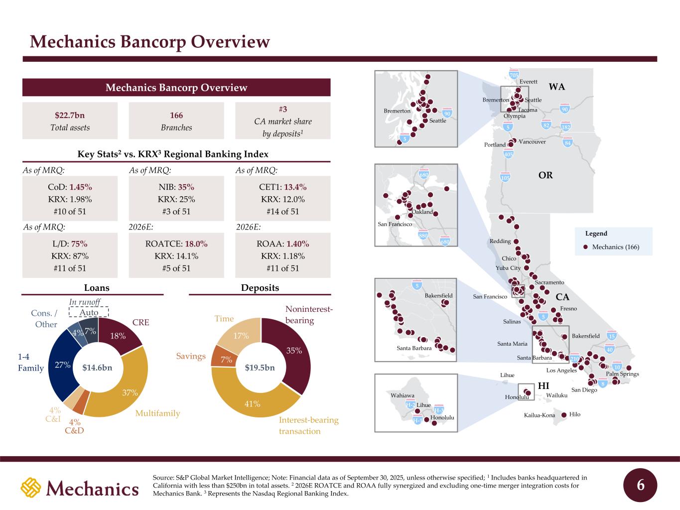 Key Stats2 vs. KRX3 Regional Banking Index Mechanics Bancorp Overview Source: S&P Global Market Intelligence; Note: Financial data as of September 30, 2025, unless otherwise specified; 1 Includes banks headquartered in California with less than $250bn in total assets. 2 2026E ROATCE and ROAA fully synergized and excluding one-time merger integration costs for Mechanics Bank. 3 Represents the Nasdaq Regional Banking Index. CoD: 1.45% KRX: 1.98% #10 of 51 NIB: 35% KRX: 25% #3 of 51 L/D: 75% KRX: 87% #11 of 51 ROATCE: 18.0% KRX: 14.1% #5 of 51 As of MRQ: CET1: 13.4% KRX: 12.0% #14 of 51 ROAA: 1.40% KRX: 1.18% #11 of 51 $22.7bn Total assets 166 Branches #3 CA market share by deposits1 Mechanics Bancorp Overview 18% 37% 27% 4% 7% $14.6bn CRE C&I 1-4 Family Cons. / Other Auto 35% 41% 7% 17% $19.5bn Noninterest- bearing Interest-bearing transaction Savings Time Loans Multifamily C&D Deposits 4% 4% 6 In runoff As of MRQ: San Francisco Oakland 880 680 680 90 5 5 Santa Barbara Bakersfield CA OR WA 8 10 40 15 5 5 90 82 182 84 105 405 210 Palm Springs San Diego Los Angeles Santa Maria Santa Barbara Bakersfield Fresno Salinas San Francisco Sacramento Yuba City Chico Redding Seattle Bremerton Seattle Everett Bremerton Tacoma Olympia Vancouver Portland 705 H-3 Lihue Honolulu Hilo Lihue Wailuku H-1 Kailua-Kona Wahiawa H-2 Honolulu Legend Mechanics (166) HI As of MRQ: As of MRQ: 2026E: 2026E: