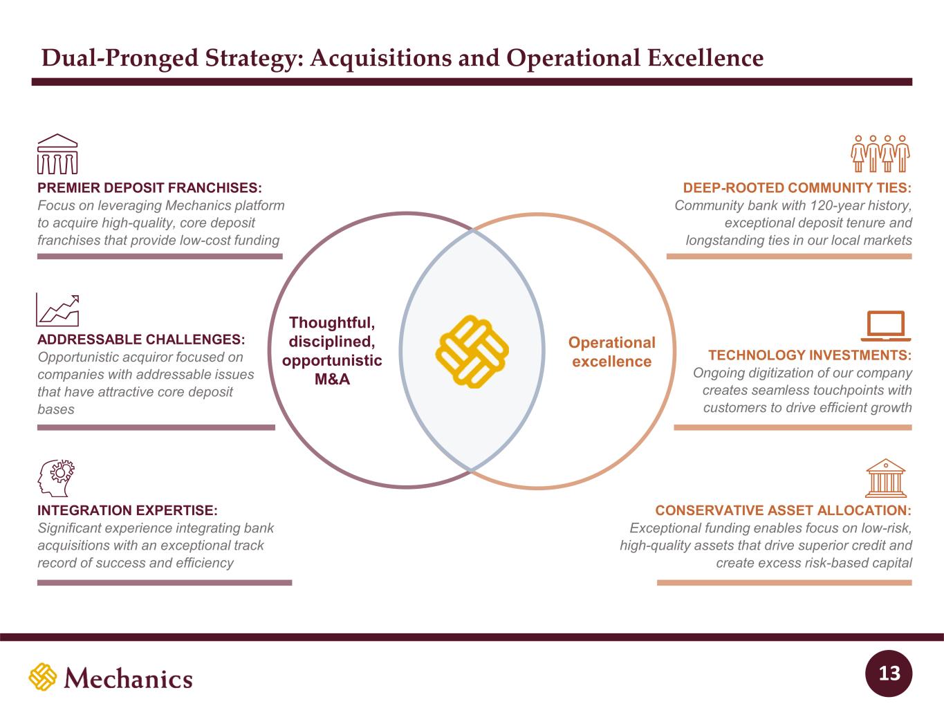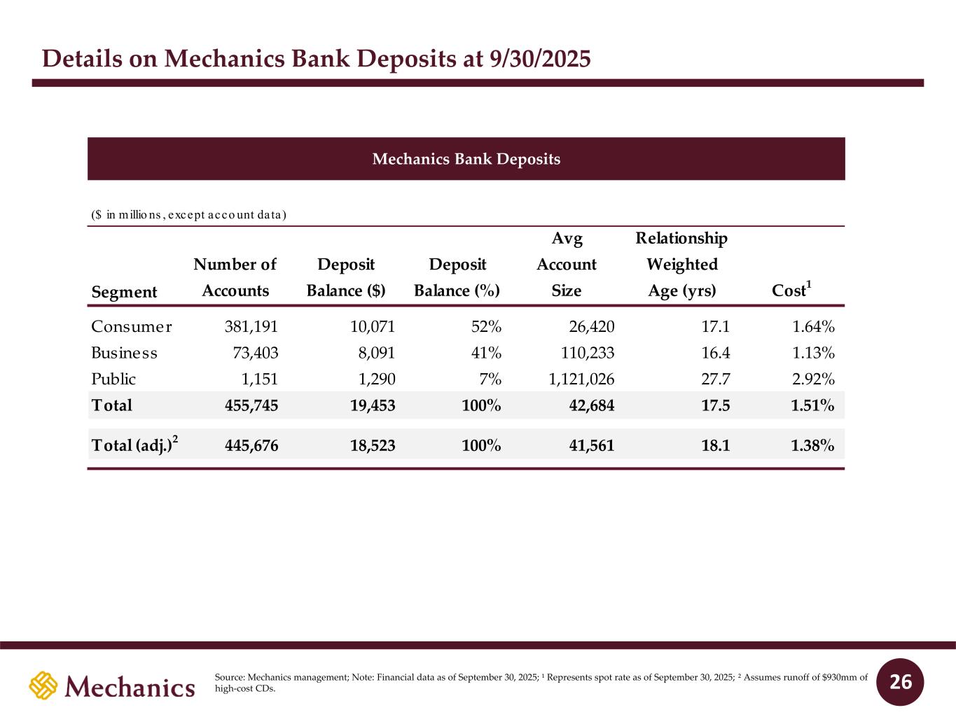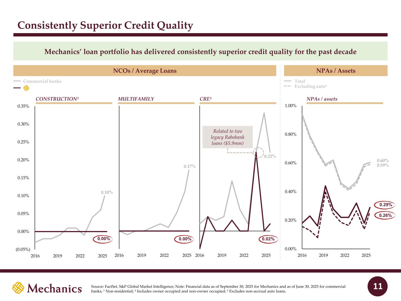 Key Stats2 vs. KRX3 Regional Banking Index Mechanics Bancorp Overview Source: S&P Global Market Intelligence; Note: Financial data as of September 30, 2025, unless otherwise specified; 1 Includes banks headquartered in California with less than $250bn in total assets. 2 2026E ROATCE and ROAA fully synergized and excluding one-time merger integration costs for Mechanics Bank. 3 Represents the Nasdaq Regional Banking Index. CoD: 1.45% KRX: 1.98% #10 of 51 NIB: 35% KRX: 25% #3 of 51 L/D: 75% KRX: 87% #11 of 51 ROATCE: 18.0% KRX: 14.1% #5 of 51 As of MRQ: CET1: 13.4% KRX: 12.0% #14 of 51 ROAA: 1.40% KRX: 1.18% #11 of 51 $22.7bn Total assets 166 Branches #3 CA market share by deposits1 Mechanics Bancorp Overview 18% 37% 27% 4% 7% $14.6bn CRE C&I 1-4 Family Cons. / Other Auto 35% 41% 7% 17% $19.5bn Noninterest- bearing Interest-bearing transaction Savings Time Loans Multifamily C&D Deposits 4% 4% 6 In runoff As of MRQ: San Francisco Oakland 880 680 680 90 5 5 Santa Barbara Bakersfield CA OR WA 8 10 40 15 5 5 90 82 182 84 105 405 210 Palm Springs San Diego Los Angeles Santa Maria Santa Barbara Bakersfield Fresno Salinas San Francisco Sacramento Yuba City Chico Redding Seattle Bremerton Seattle Everett Bremerton Tacoma Olympia Vancouver Portland 705 H-3 Lihue Honolulu Hilo Lihue Wailuku H-1 Kailua-Kona Wahiawa H-2 Honolulu Legend Mechanics (166) HI As of MRQ: As of MRQ: 2026E: 2026E:
