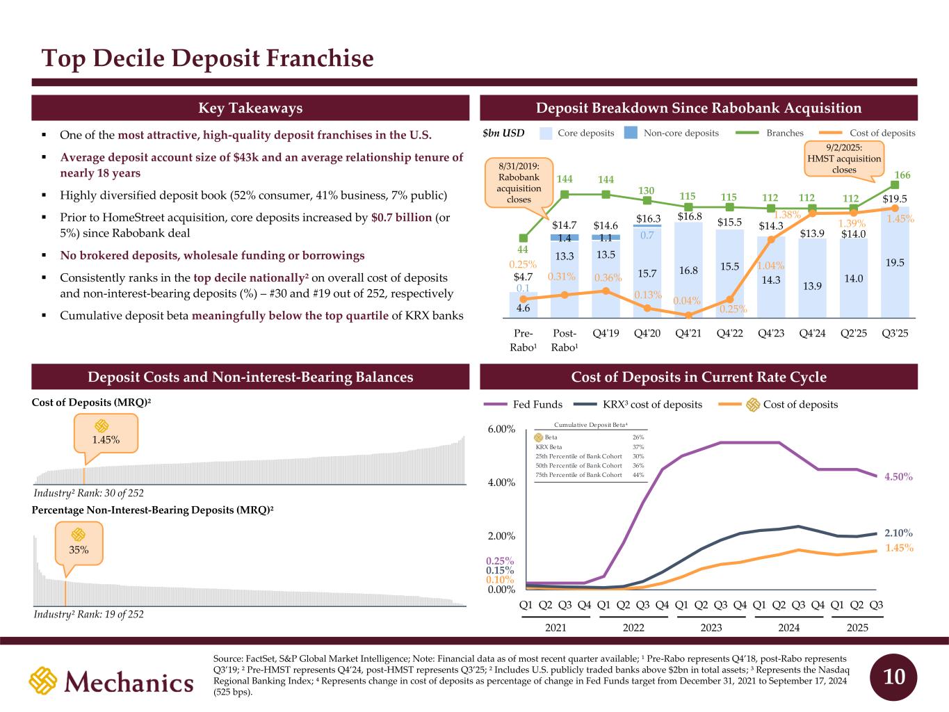 Top 10 Deposit Share in Many Attractive West Coast Markets Top West Coast MSAs Seattle San Francisco Los Angeles San Luis Obispo Santa Barbara Salinas Ventura Riverside El Centro Siskiyou County $3.8 | #10 $1.1 | #6 $3.2 | #9 $2.1 | #29 $1.5 | #2 $1.0 | #4 $0.8 | #17 $0.6 | #7 $0.4 | #1 $0.8 | #6 Top 10 10–20 >20 California and Washington Are Especially Attractive Markets Deposits ($bn) | Rank California is the 2nd largest deposit market in the U.S. California and Washington are in top 10 states for household income¹: WA (#5): $96,000 CA (#9): $95,000 California and Washington are central hubs for leading technology, media and healthcare companies California and Washington are home to many exceptional universities and academic institutions California has the 5th largest economy in the world by GDP Seattle is one of the fastest growing large cities in the United States 9 Honolulu $0.6 | #1 Sacramento $0.4 | #18 Chico $0.4 | #9Bakersfield $0.3 | #8 Merced $0.3 | #5 Source: Public Policy Institute of California; S&P Global Market Intelligence; Note: Branch and deposit data as of June 30, 2025; ¹ Represents current median household income; excludes District of Columbia.