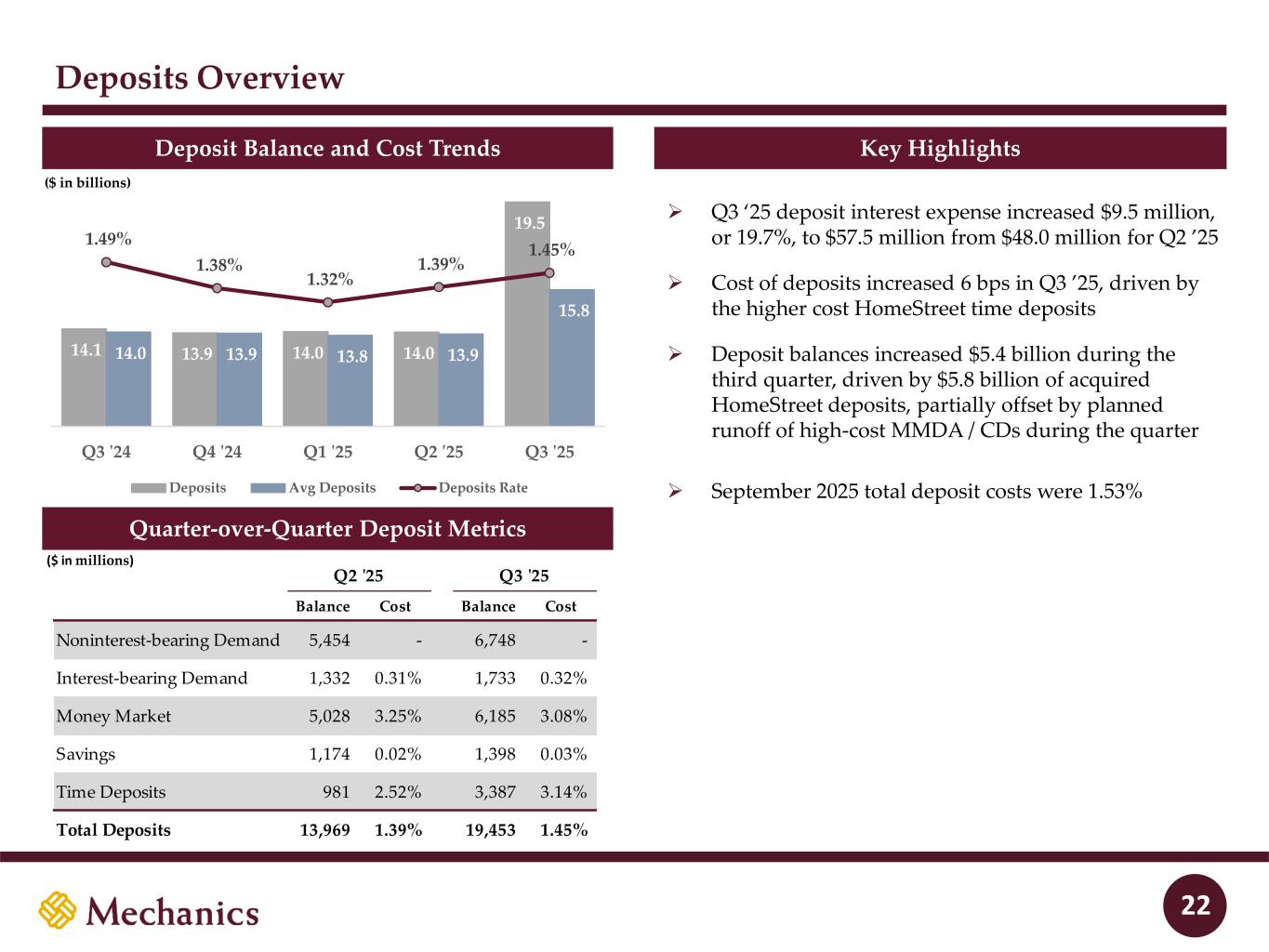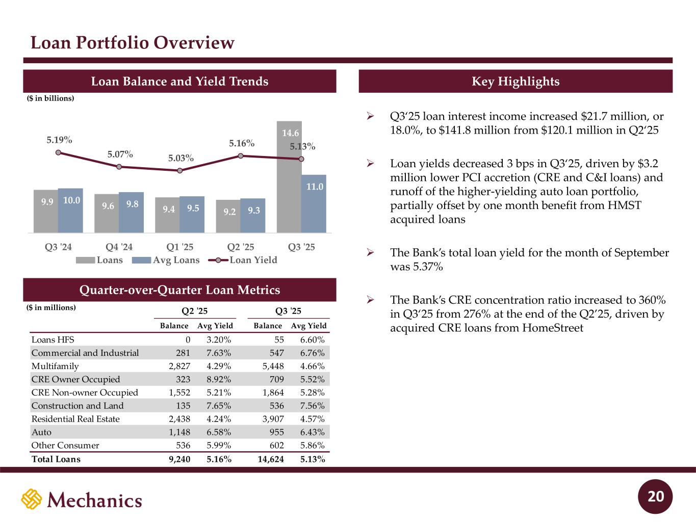Mechanics Bancorp 3rd Quarter 2025 Financial Highlights 4 3rd Quarter Financial Highlights 9/30/2025 Summary Balance Sheet ▪ Mechanics Bancorp reported net income of $55.2mm in Q3’25 ▪ Fully diluted EPS of $0.25, BVPS of $12.54 and TBVPS of $7.731 ▪ ROAA of 1.18% and ROATCE of 14.2%1 ▪ $90.4mm bargain purchase gain from HomeStreet acquisition ▪ Significant one-time merger expenses in Q3, including: ▪ ~$27.8mm of compensation expenses, primarily due to CIC payments, severance and stock vesting ▪ ~$21.2mm core systems contract termination accrual ▪ ~$14.9mm of other one-time acquisition charges, primarily advisor fees and other professional services ▪ $47.0mm of total provision expense in Q3’25 due to one-time Non-PCD double count and increases to CECL factors ▪ ACL equal to 1.16% of total loans; 2.60x ACL / NPAs ▪ Total assets of $22.7bn, total gross loans of $14.6bn, total deposits of $19.5bn and tangible shareholder’s equity of $1.788bn1 ▪ All legacy HomeStreet wholesale funding paid off in September (no remaining brokered deposits or FHLB borrowings) ▪ 13.4% CET1 ratio and 75% loans-to-deposits ratio ▪ 8.23% Tangible common equity ratio1 at 9/30/2025 ▪ 1.53% cost of deposits in September ▪ 3.50% NIM in September (anticipate modest expansion moving forward as deposit costs decline and earning assets reprice) ▪ 360% CRE concentration ratio at 9/30/2025 1 Non-GAAP measure. Refer to section “Non-GAAP Financial Measures and Reconciliations” in the back of this presentation. Balance Sheet ($ in millions) Q3 '25 Q2 '25 vs Prior Qtr Cash and Cash Equivalents 1,443$ 2,079$ (636)$ Securities 4,904 3,954 951 FHLB Stock and Other Investments 149 103 45 Loans HFS 55 0 55 Commercial and Industrial 547 281 267 Multifamily 5,448 2,827 2,622 CRE Owner Occupied 709 323 386 CRE Non-owner Occupied 1,864 1,552 312 Construction and Land 536 135 401 Residential Real Estate 3,907 2,438 1,469 Auto 955 1,148 (193) Other Consumer 602 536 66 Loans HFI 14,569 9,240 5,329 Allowance for Loan Losses (169) (68) (101) Goodwill & Intangible Assets 987 877 110 MSRs 89 - 89 Other Assets 683 387 297 Total Assets 22,709$ 16,571$ 6,138$ Noninterest-bearing 6,748 5,454 1,295 Interest-bearing 1,733 1,332 401 Money Market 6,185 5,028 1,158 Savings 1,398 1,174 224 Time Deposits 3,387 981 2,406 Total Deposits 19,453 13,969 5,484 Senior Debt, Sub Debt, and TRUPs 190 0 190 Other Liabilities 292 186 106 Equity 2,774 2,417 358 Total Liabilities & Equity 22,709$ 16,571$ 6,138$